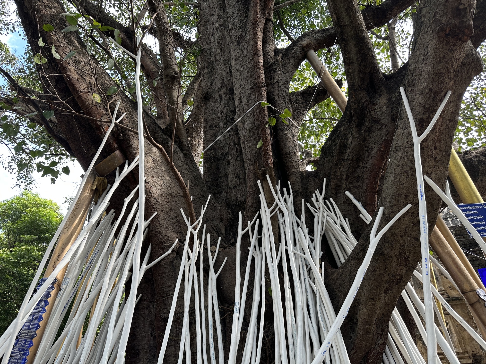 At Wat Jed Yot you can buy a white forked stick for 99 Baht ($2.80), write you name or anything you want on it and lean it against the big Bodhi Tree as symbolically holding up a branch of the sacred tree in order to gain some merit. The Buddha gained enlightenment under such species of tree in India and there is always one growing in temple compounds.