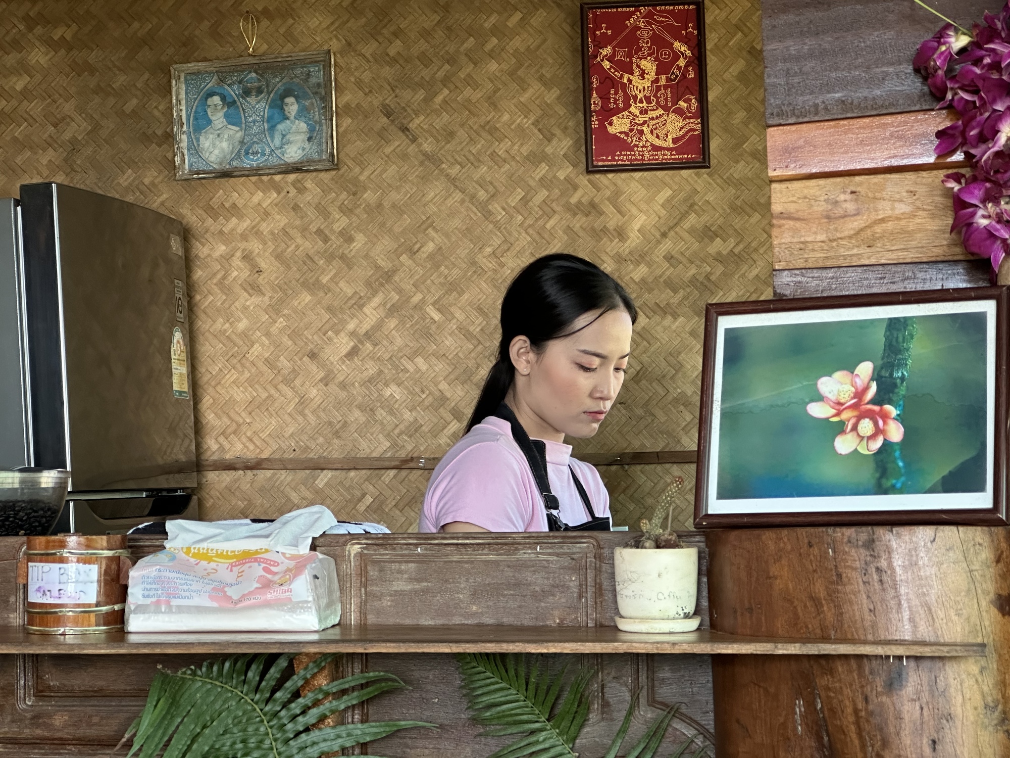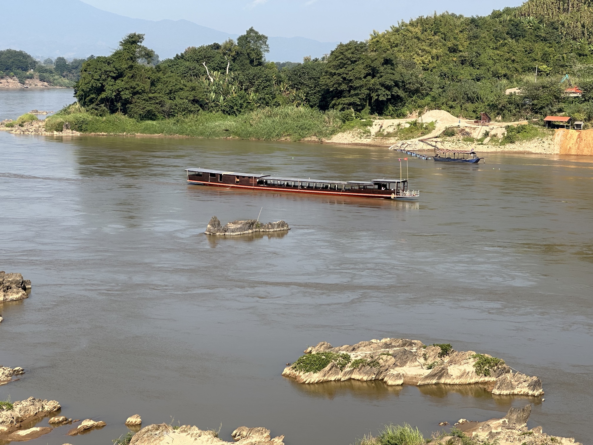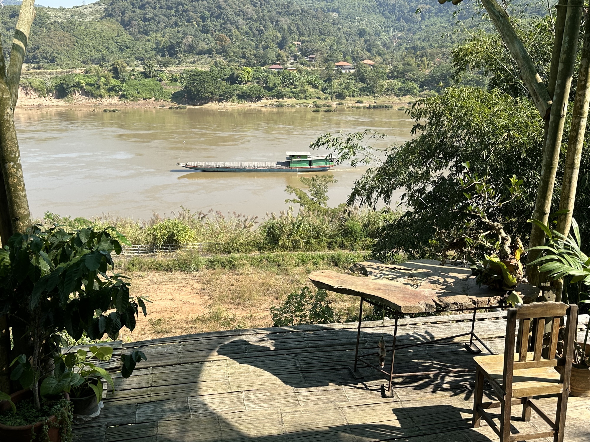 But we sure didn't get far because we quickly came to an adorable little rustic bamboo hut coffee place also hanging out and over, also with great views. We pulled in there and had yet another cup of great Thai coffee. I think I am fully addicted to coffee now - you know, full on headache if I don't have it every morning! But the setting for this cup of coffee was a must and linger we did. We saw the slow boat go by - the boat that takes tourists to Luang Prabang every morning. Going downstream it was zipping along at a good clip.