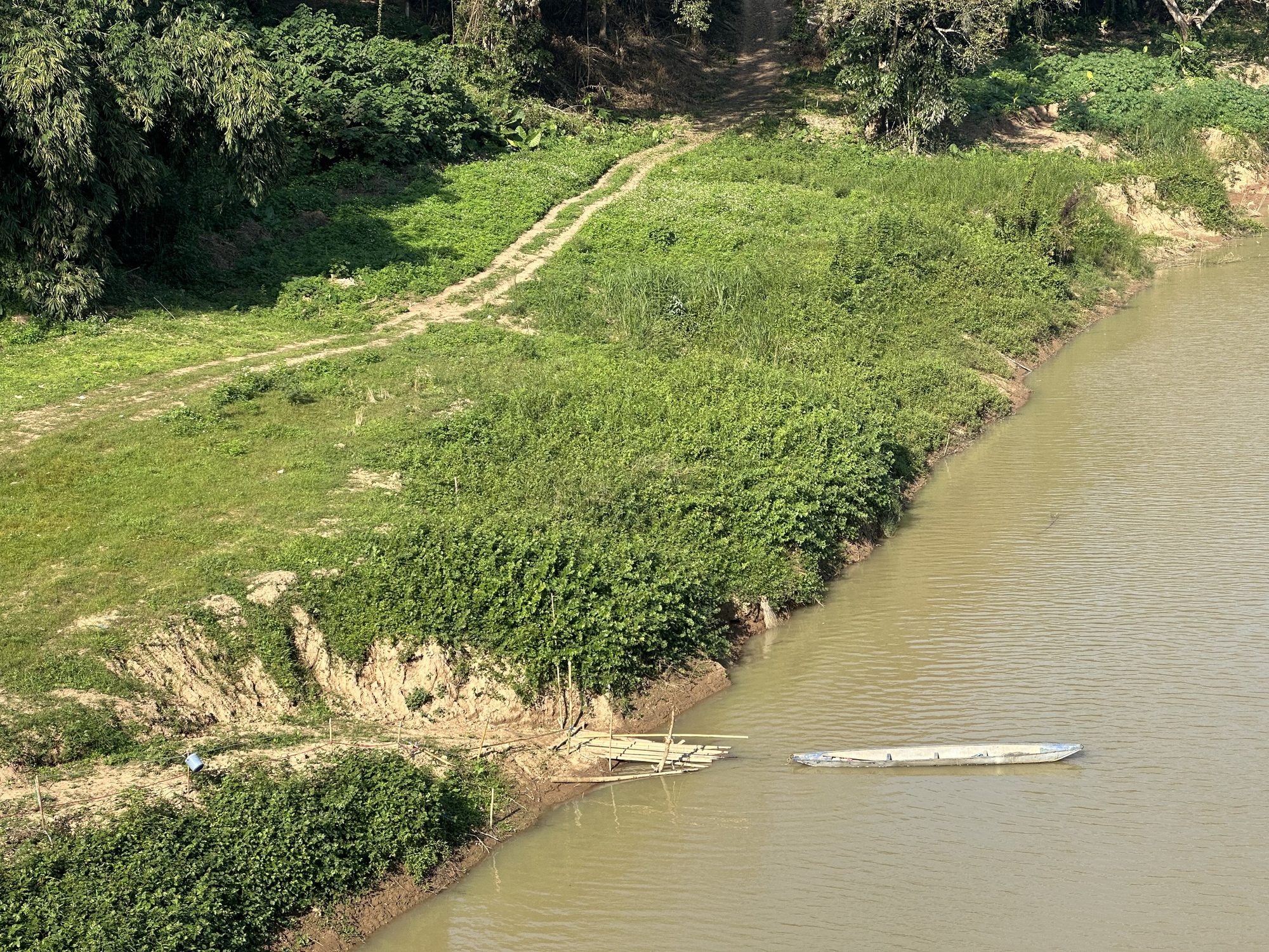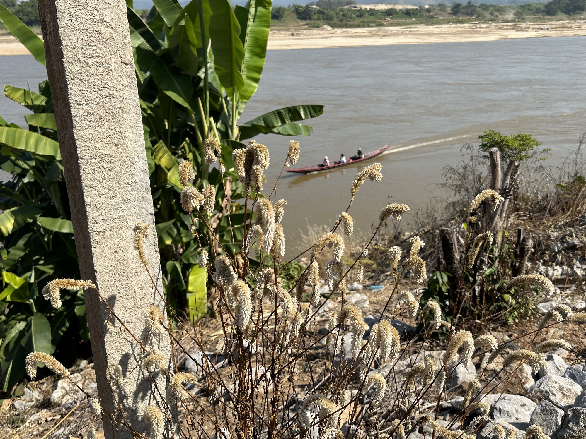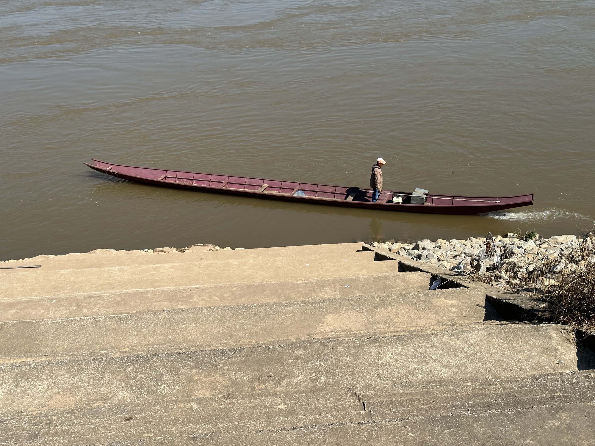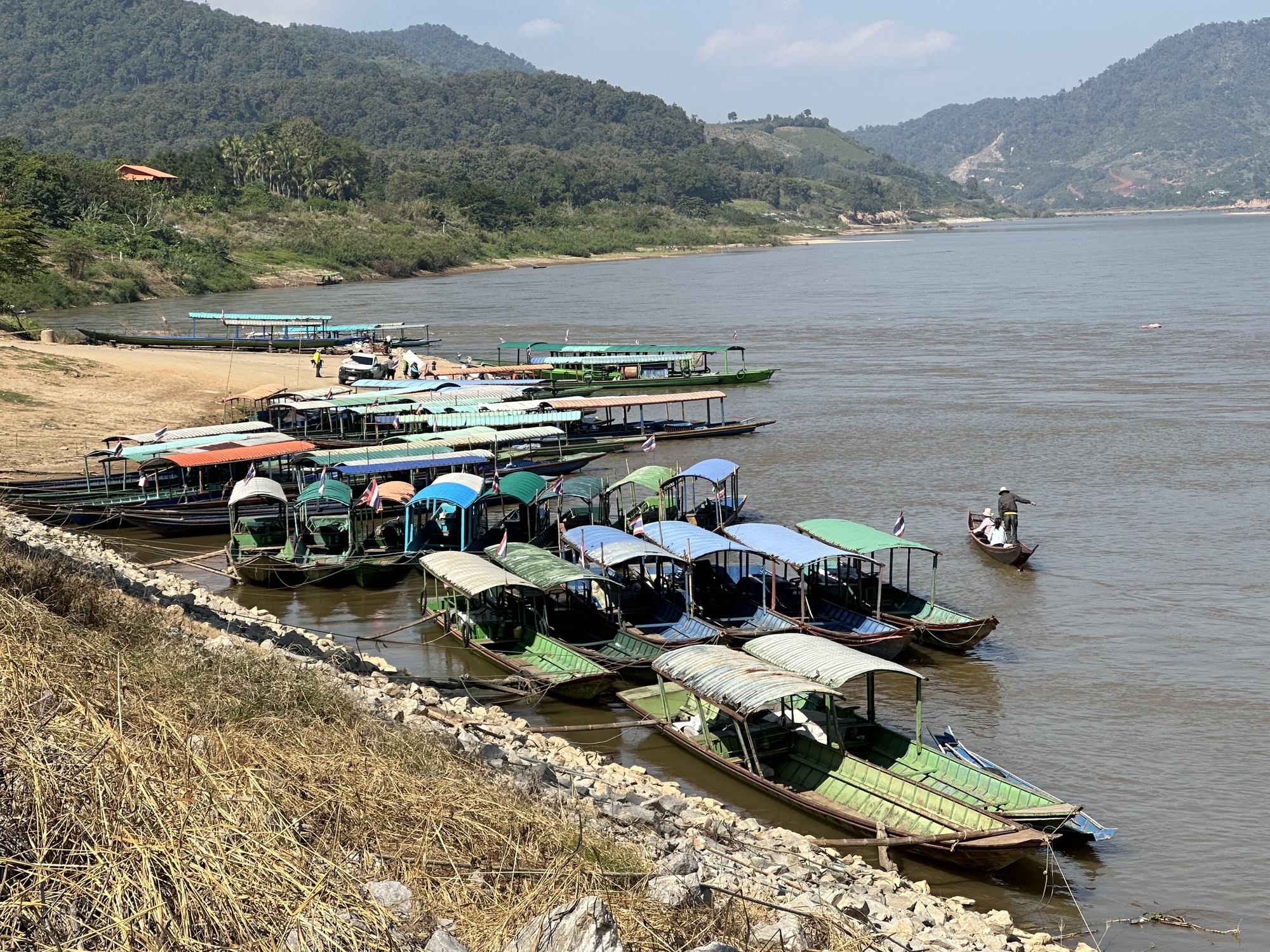 After a while in the coffee spot and fearing that each step taken on the bamboo deck would take us through the rotting bamboo, we didn't linger any longer. We flew down the big hill to a small sleepy settlement. In an effort to river-linger some more I turned us down a street that headed towards the river. Having never been to the settlement before I didn't know what to expect at the river. It turned out that a possible reason for the town's existence is because it is a border crossing point only for Thai and Lao nationals, not us. There's no bridge but lots of long, narrow, wooden boats were tied up at a dock. There was also a policeman. Normally we never see police but near the border areas we have actually seen a few. It's just too easy to smuggle drugs across the Mekong into Thailand and the Thai police and border police do what they can to stem the tide of drugs entering. I doubt they catch more than a very small percentage since the border is along such rugged country.