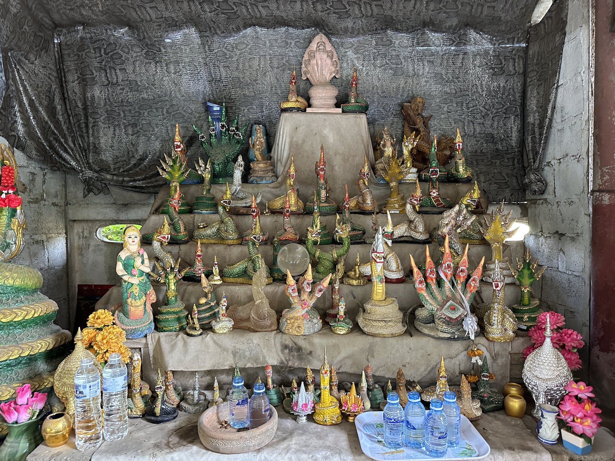 Even though the distance was not great on the Mekong road it was spectacular. It was mostly well above the river which afforded great views and we got to watch the many Lao wooden boats plying the Naga infested waters. In places the river was pretty narrow which meant it was deeper in those places and the way the water welled up you just know that Nagas were down there in the depths swishing their massive tails. The captains of the colorful wooden boats no doubt were tossing sticky rice into the swirling water to appease the serpents. Above the waters and up the rocky banks to where we were riding on the road, were shrines at certain steep and dangerous curves, shrines devoted to Nagas or snakes. Inside the shrines the most cautious of travelers had left statues of cobras and Nagas. Lots of them. I, of course, had to stop to photograph them. I thanked them as well.