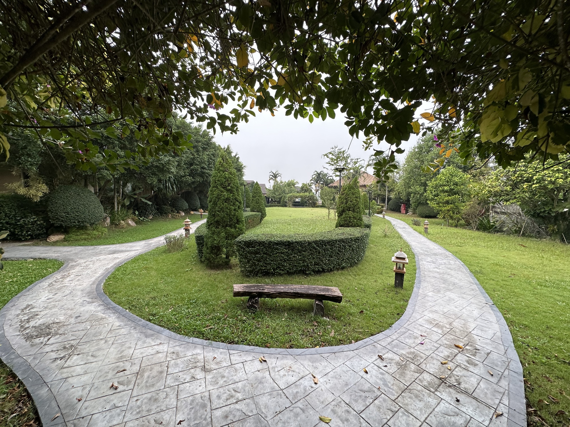 The hills, or mountains as they call them, are the highest ones we've seen on our trip and it was nice to view them as we rode. We stopped in a small town to eat some pad krapow and then just outside of that same town we came across what looked like a resort that would be too expensive for us. Lanna Thai Resort and Spa. It was the "and Spa" that made it sound too expensive. We pulled in anyway to ask the price. It turned out to be totally within our budget so we stopped after only 18 miles. The grounds as well as the bungalows of Lanna Thai Resort and Spa are very beautiful. Someone obviously spends a lot of time grooming the grounds. There are beautiful plants everywhere and the place was super mellow with nobody else staying. This has been the way it's been wherever we have gone on this trip. I feel bad for the owners of the resorts way out in the countryside because they can't be making much money. I want them to succeed. As we walked around to explore the vast gardens we noticed that the spa part is most likely gone which is why the price for a bungalow probably dropped recently.