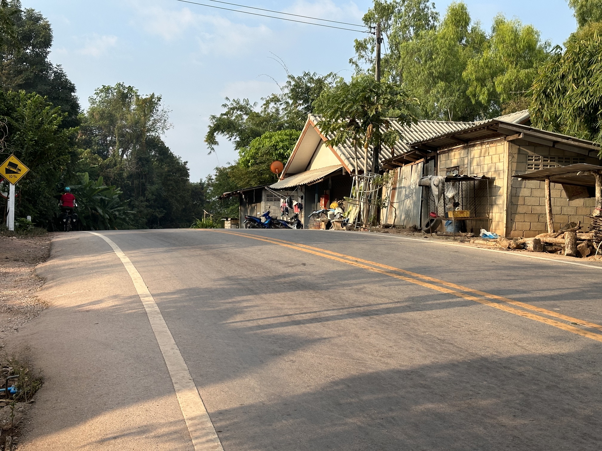 We were sort of shooting for a resort at a crossroads but it was not near a town. On the fly, while we were stopped to sip some water, we decided to go four extra miles to the town of Thoeng because neither of us had ever been to Thoeng and there might be better lodging there too. We were ready for a bit of a bigger city experience although Thoeng is not a very big city, just bigger than any place we had been recently. Mostly it's just fun to explore a new place which we always try to do on each successive S.E. Asia bike trip.
