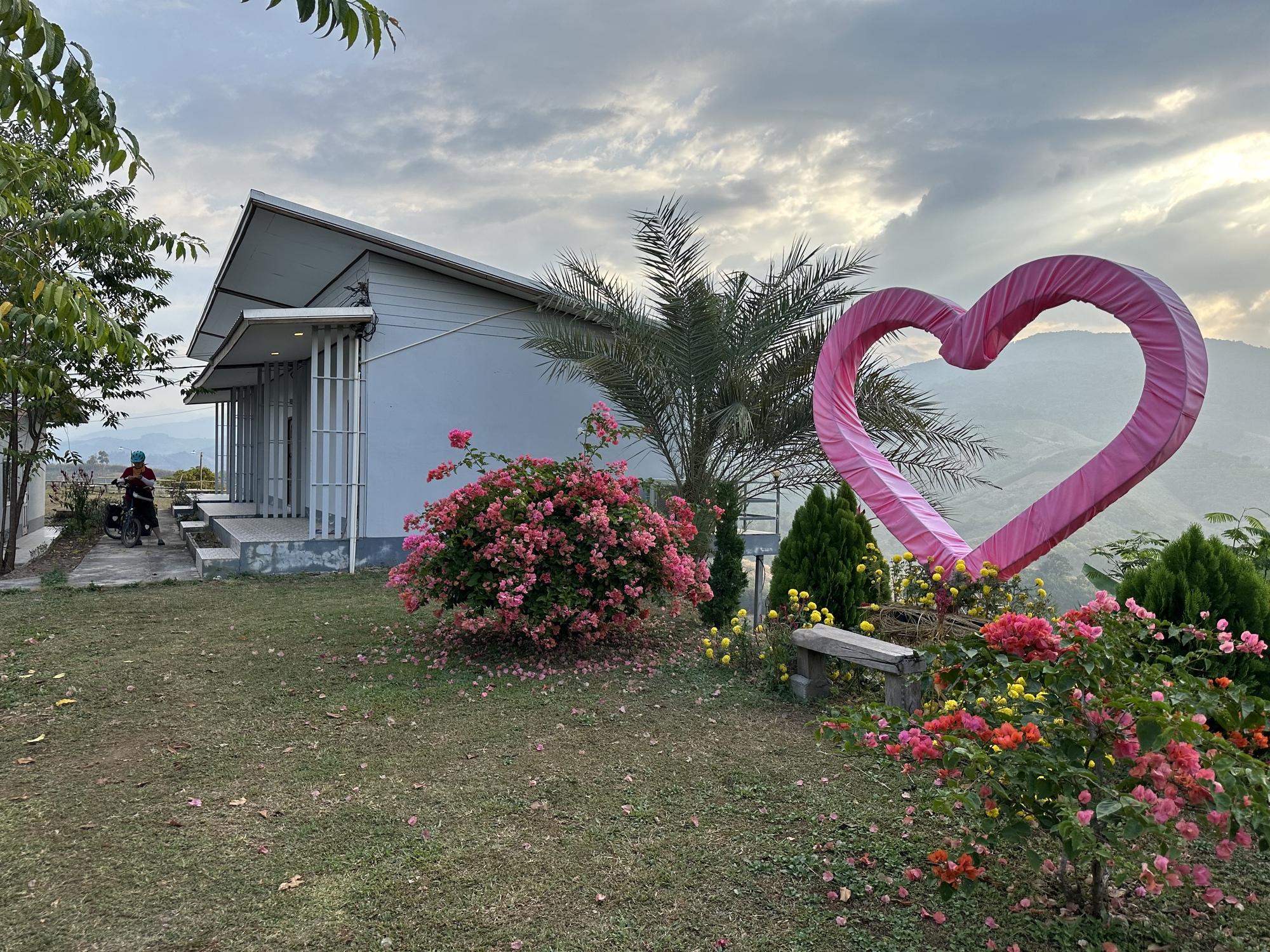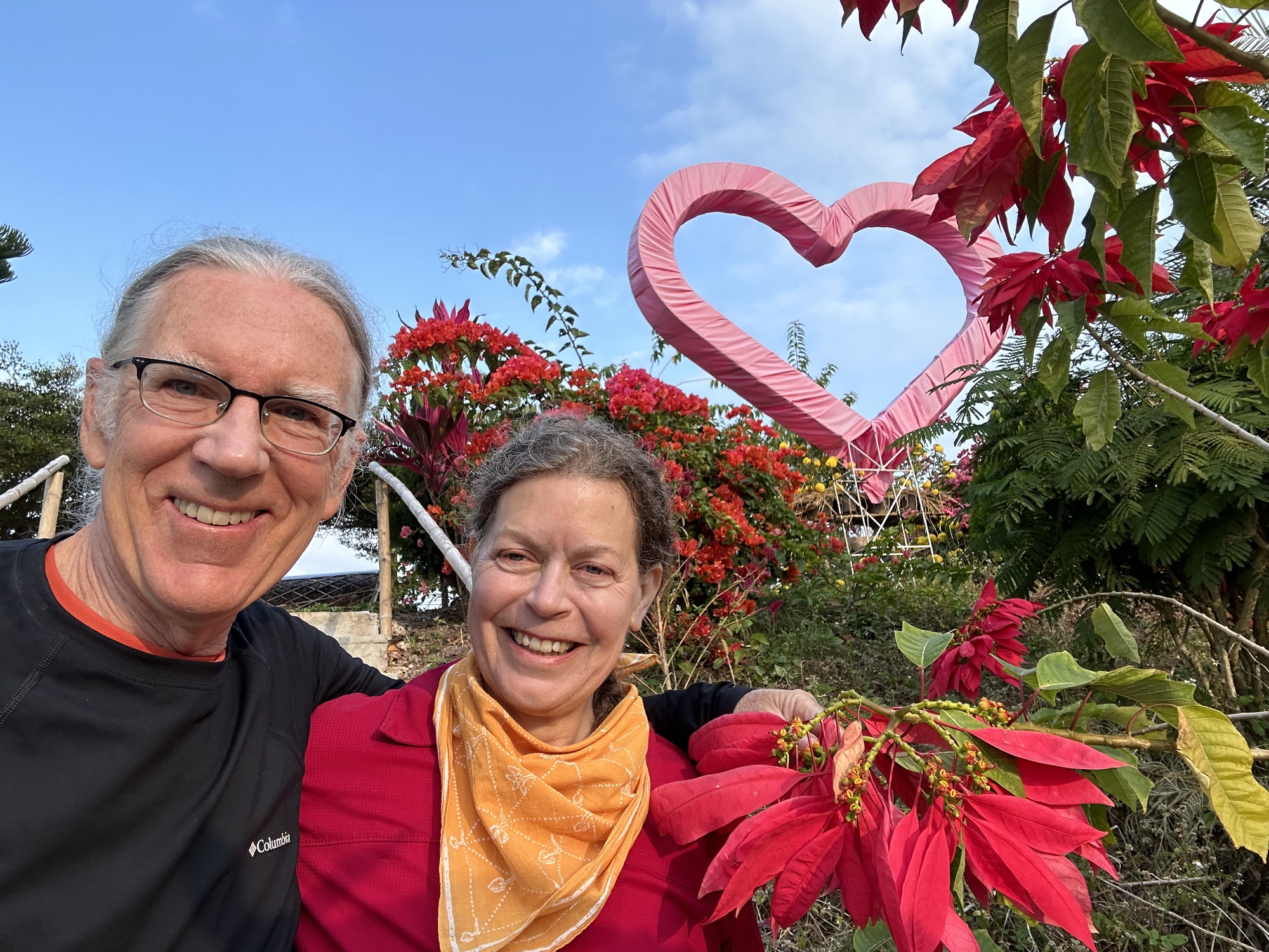 Before we started riding we wanted to do a selfie Christmas Instagram since it was Christmas Eve. There was the perfect poinsettia bush outside our bungalow, plus a strange big heart. Perfect.