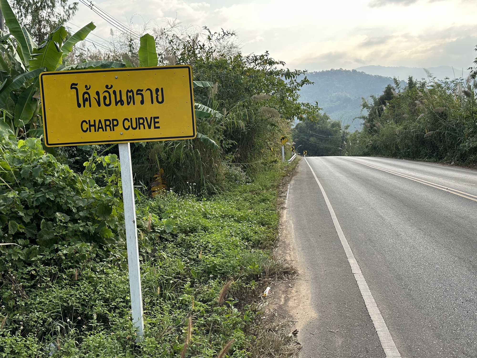 After our photo session we got on our bikes for the dreaded Hell Ride continuation from yesterday. But, wait......Imagine our surprise when we left Charoensuk Resort and placed our bikes on the asphalt and pushed off downhill, (downhill not uphill ) and the road continued downhill for the next nearly six miles dropping more than one thousand feet! It was too steeply down at times but that is not something I'm going to complain about. There were lots of beautiful, gentle curves and the road was in perfect condition. Besides the few places of 16%, it was one of the most enjoyable downhills I've ever experienced. Most enjoyable was the surprise of pure Hell turning into pure Joy. It was a Christmas miracle.