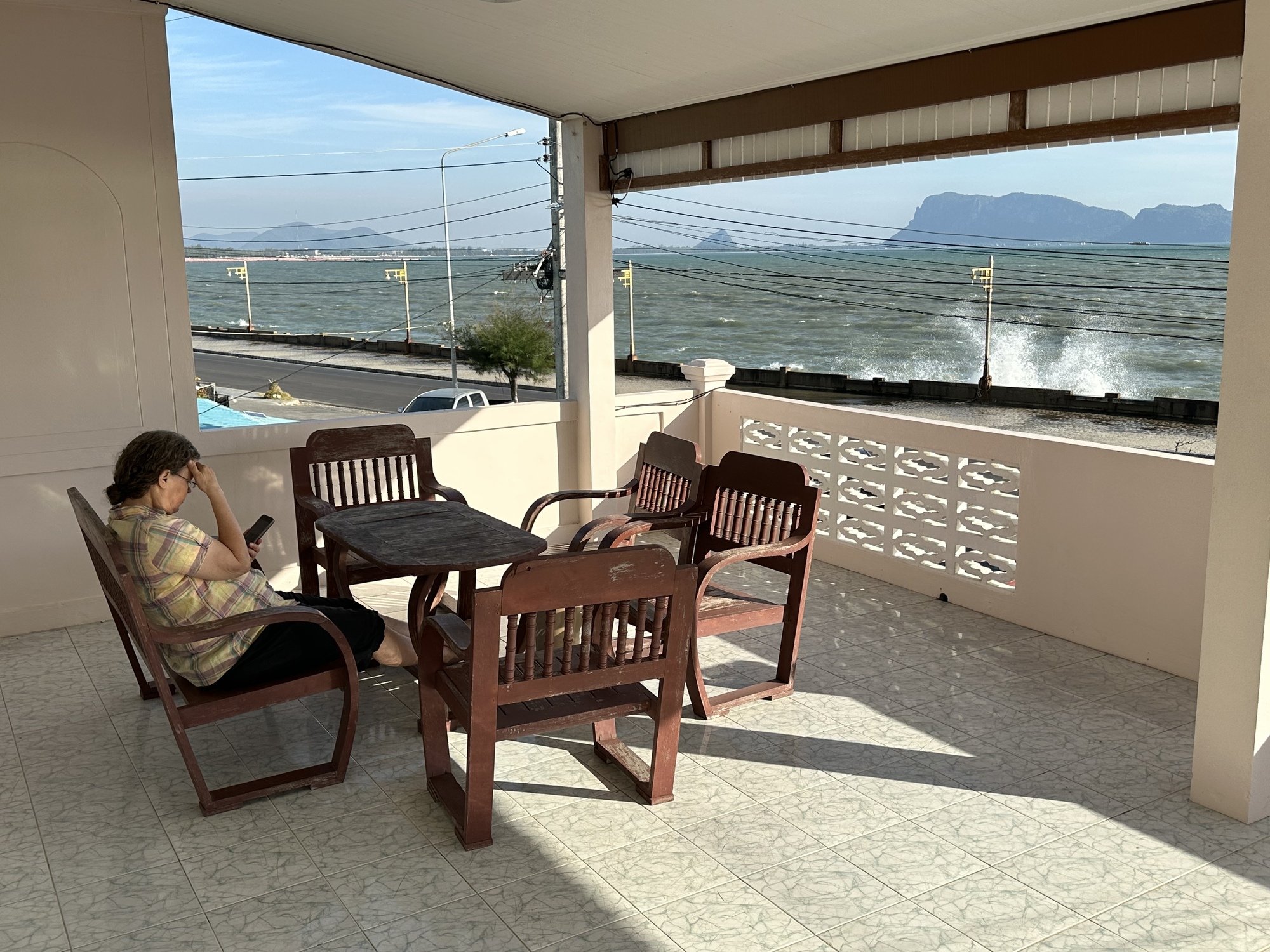 Then we settled into our room discovering one improvement after another. We loved being back and lounging on the huge second floor veranda outside our room overlooking waves crashing over the seawall. We were glad to see screens on the windows which meant we could open them at night to let in the cool night air but also be able to hear the waves better. The veranda was also a perfect place for us to have our breakfasts which we make - just go downstairs for some of the best coffee ever. Paradise!