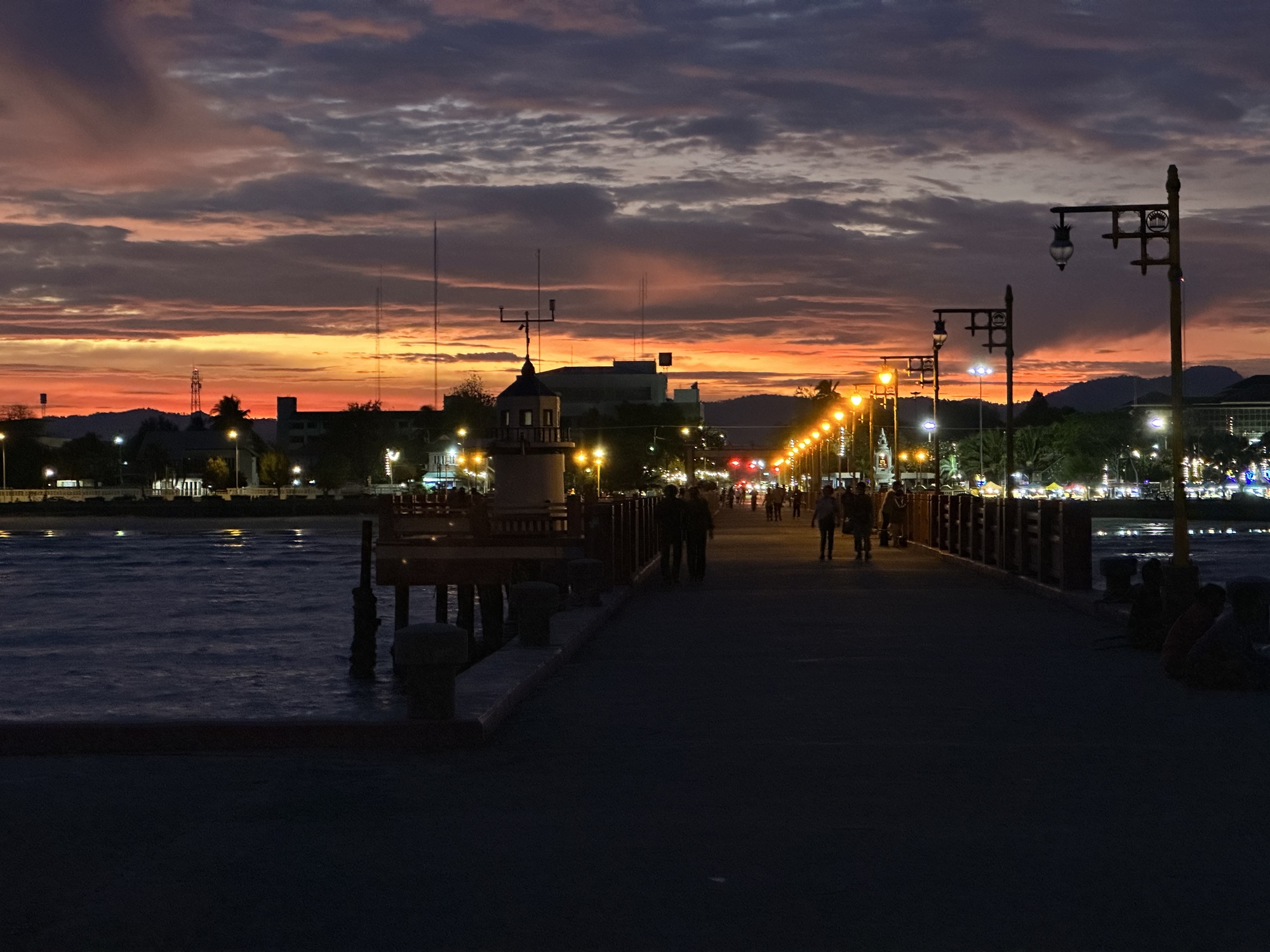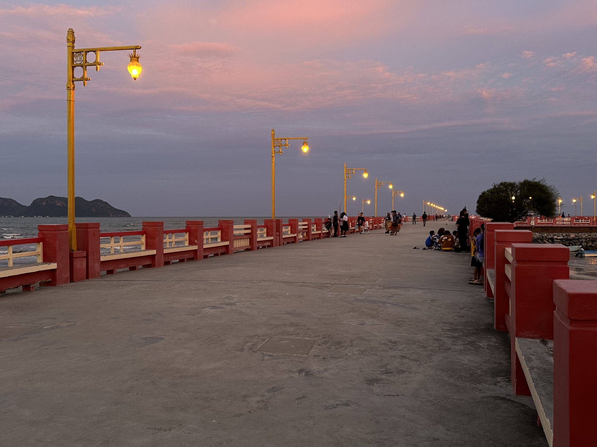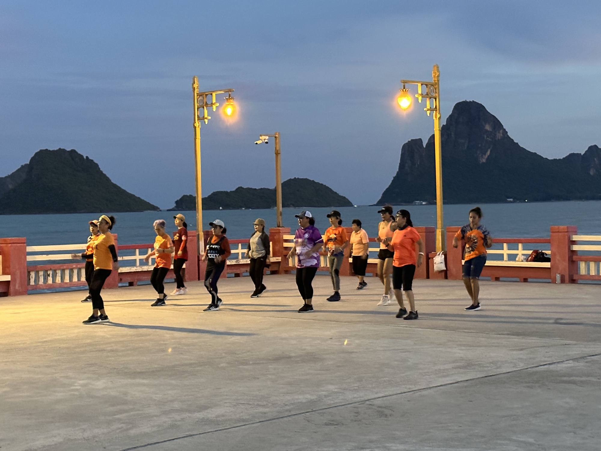The pier has been remade and lengthened but is in the same place. It's a really nice pier and one evening at sunset Andrea and I lifted and fit our bikes through the gate and rode to the end. The sunset and the lights of Prachuap were a lovely sight. Halfway out there is a wide area and an aerobics class was taking place with some lively music. Aerobics classes are always fun to watch but especially if they are taking place on a beautiful pier at sunset.
