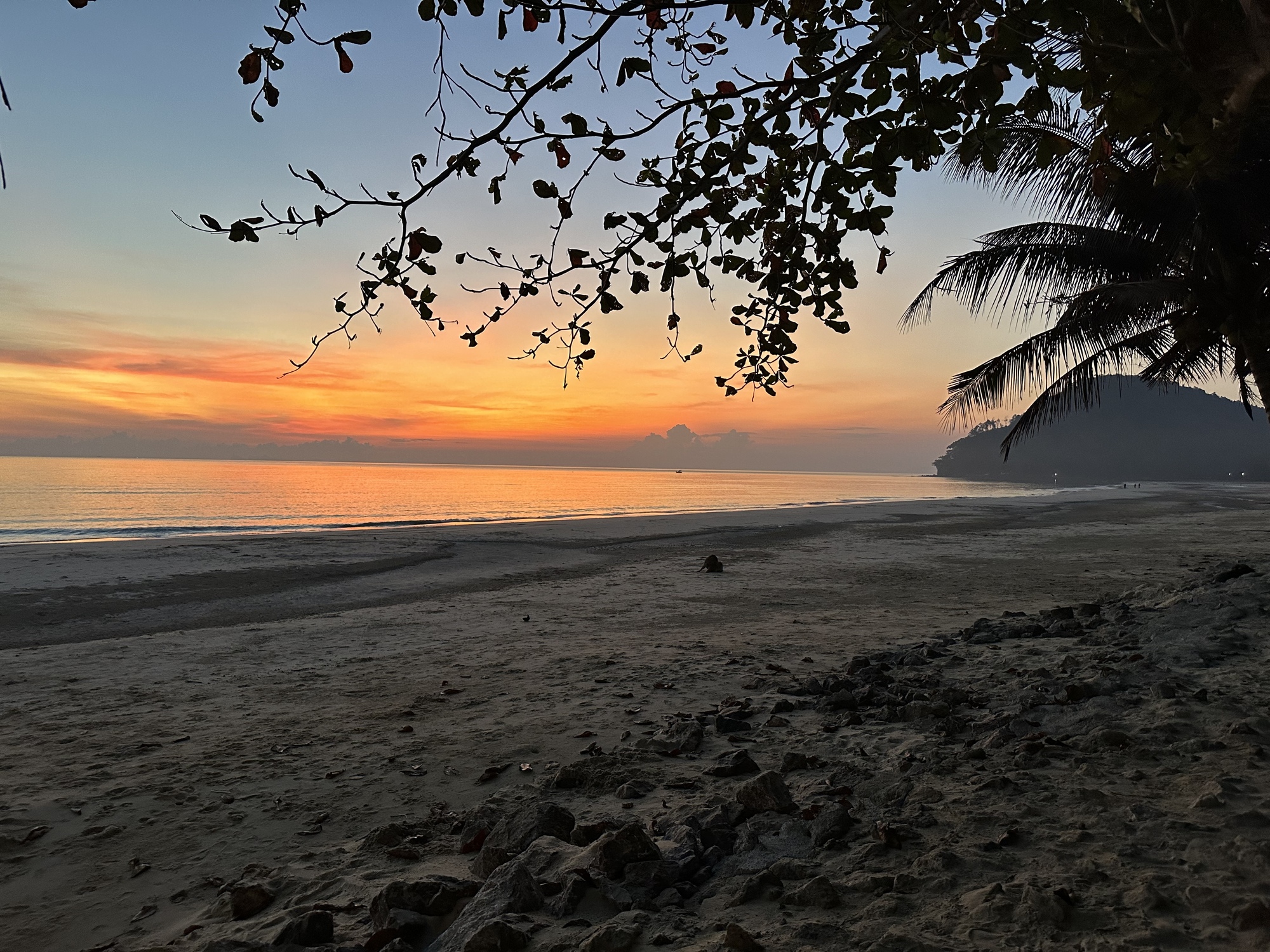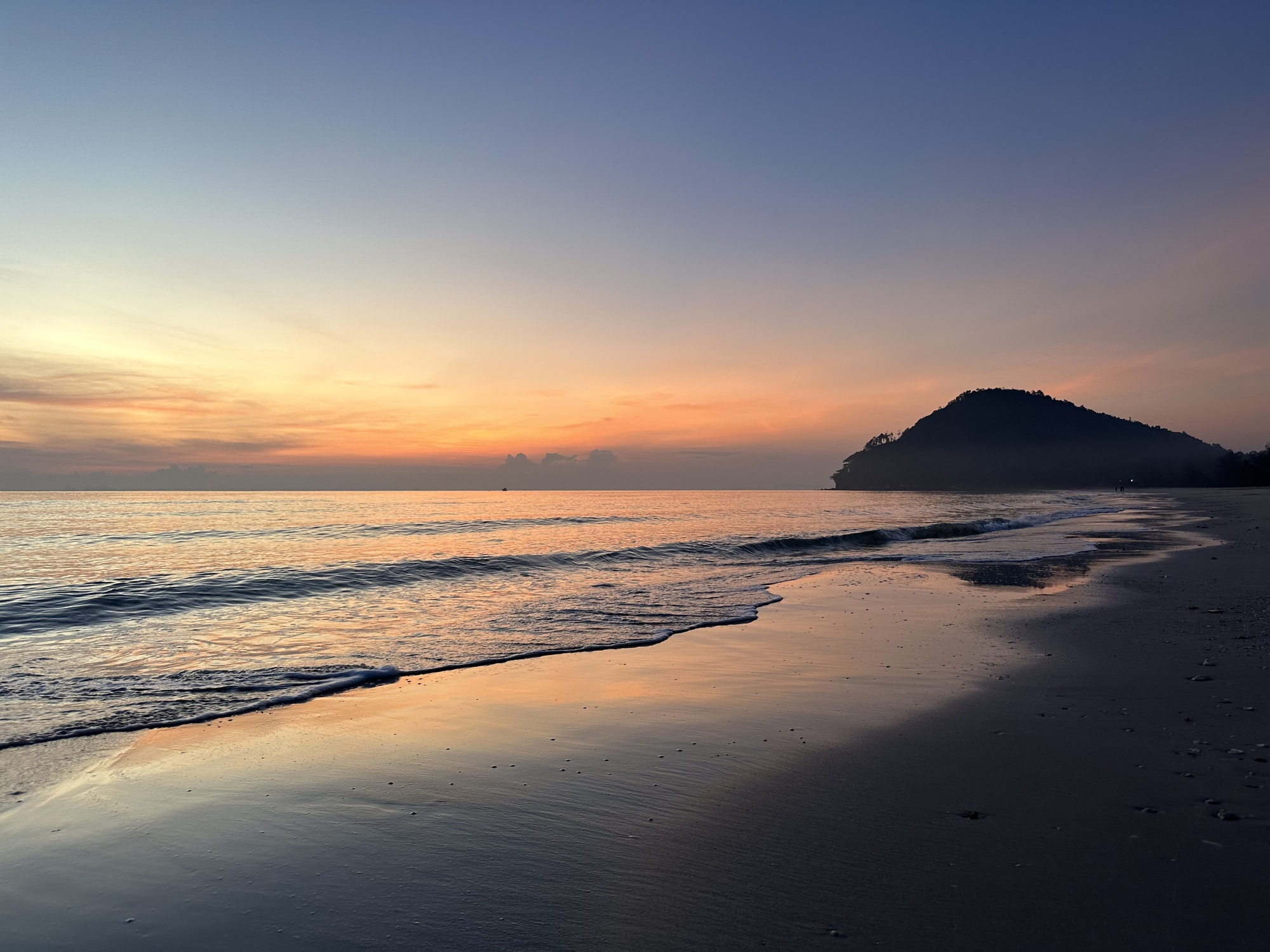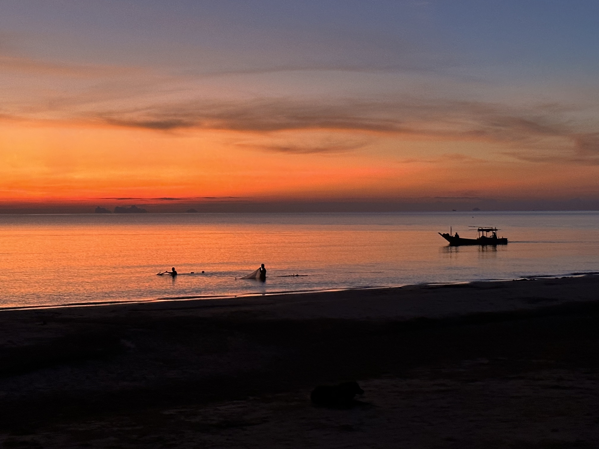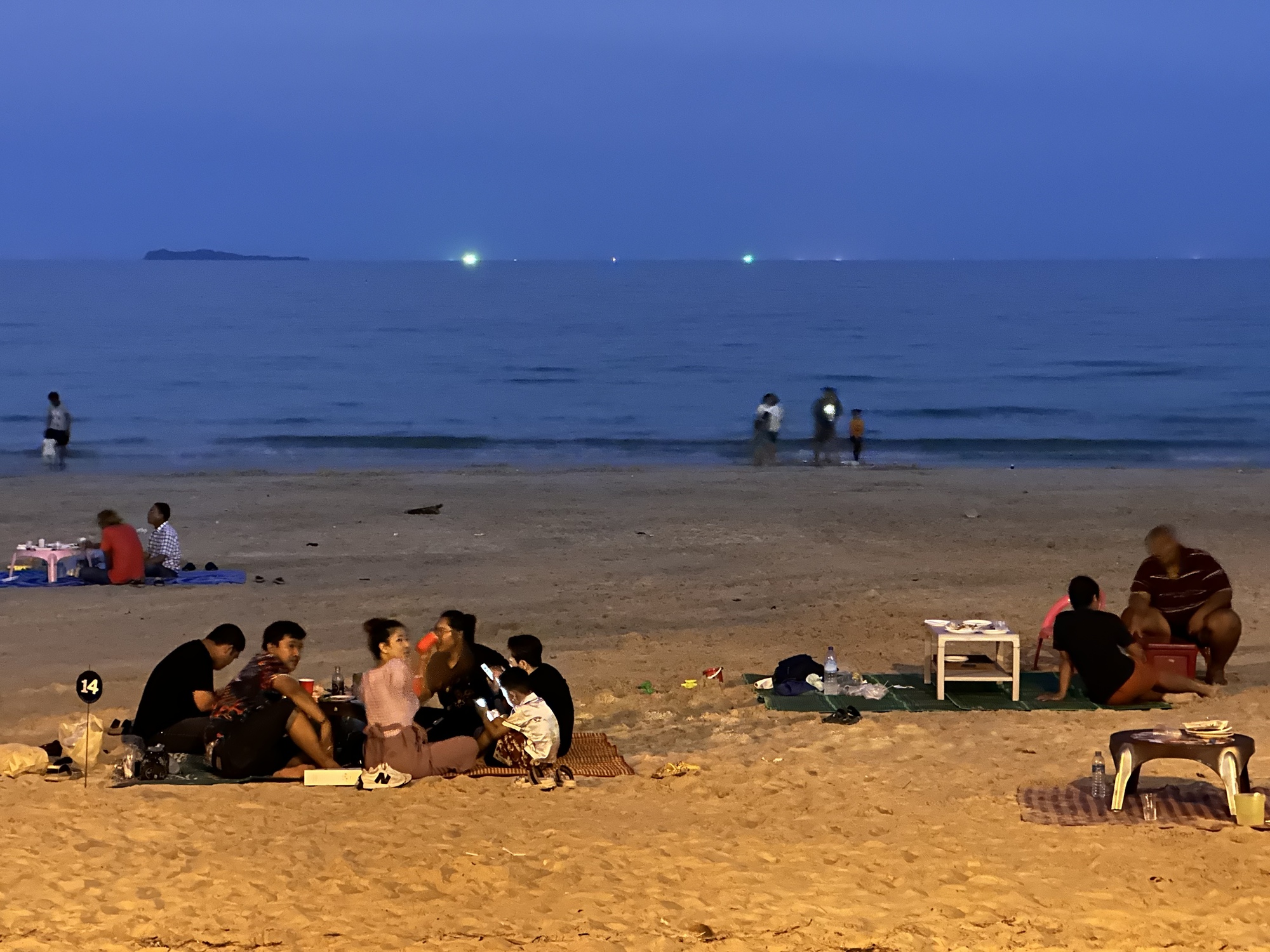 We observed the way everyone was doing dinner. They ordered a bunch of food at a restaurant and then they went down to the beach and spread their blankets and mats. The restaurant would give them a metal stake with a number on it and when the food was ready the restaurant workers would bring a low round table and the food to wherever they were. If more food or drink was wanted they texted the restaurant and simply told them their number. Payment was done the way payment seems to be done all over Thailand now - by Prompt Pay, a payment app via their phones. Restaurants also had mats and tables available for rent. Thais doing things the Thai way. We sat and watched the well organized scene until the sky had turned a deep dark blue and the squid boats were lighting the horizon green.
