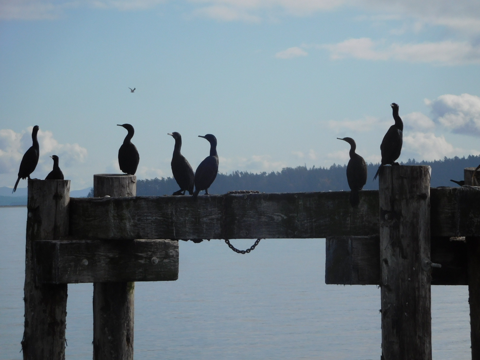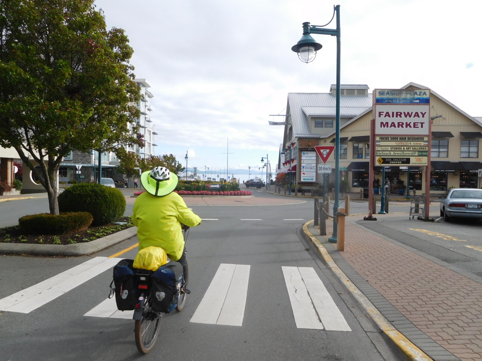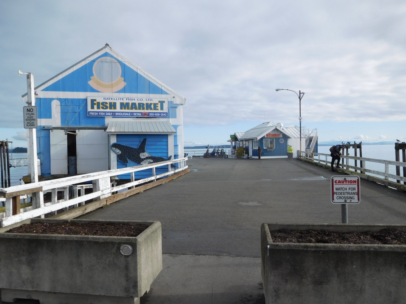 Rolling into Sidney we found the sun shining, and the pleasant shops and restaurants of the main street. It ends at a pier with a fish store and a restaurant.