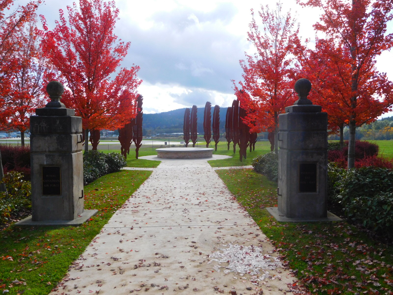 Around the back of the airport, in an area we had never visited, was "hospital hill" - a spot where once stood a military hospital. Now it hosts a memorial for fallen military flyers. The bits that look in the shot like poplar trees are metal and represent hawk feathers, each standing for a fallen flyer from the Victoria area. The entrance pillars formerly stood at the hospital.