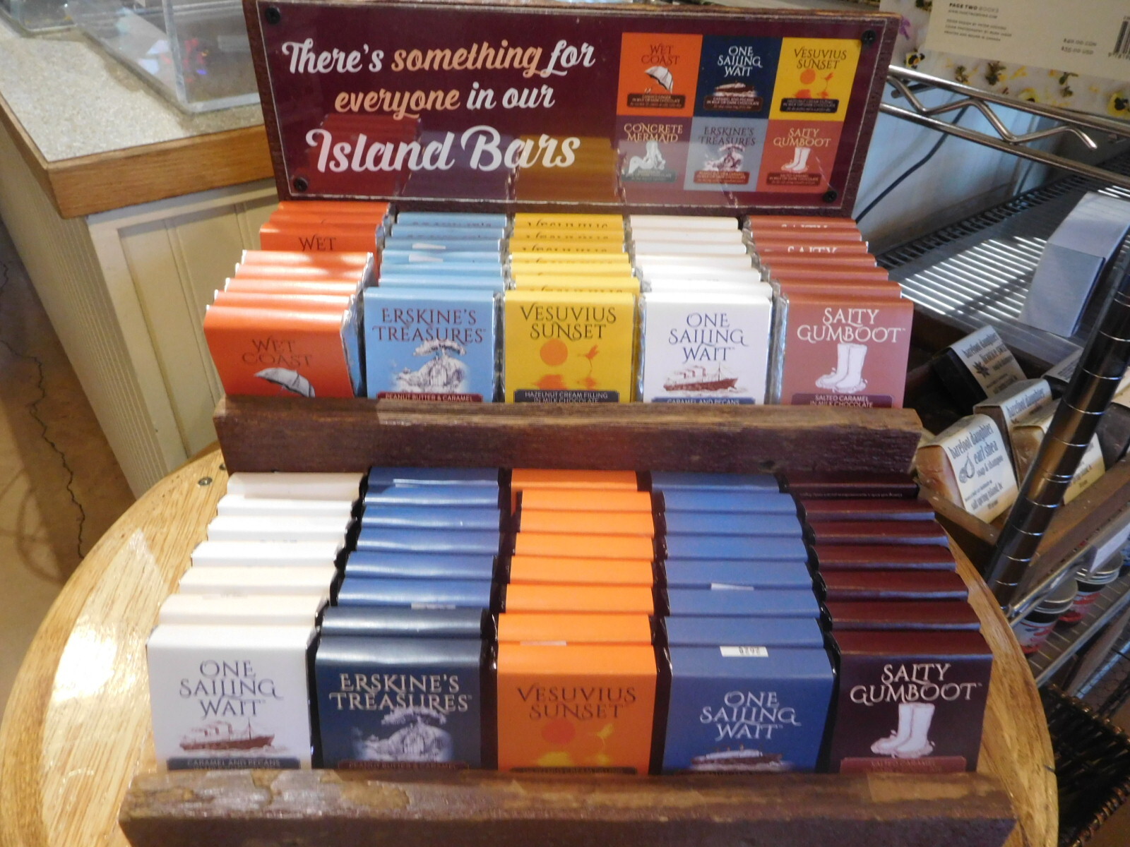 In Europe a display that looks like the one below normally contains Ritter Sport bars. But here it's Island Bars, with flavours like "One Sailing Wait"!