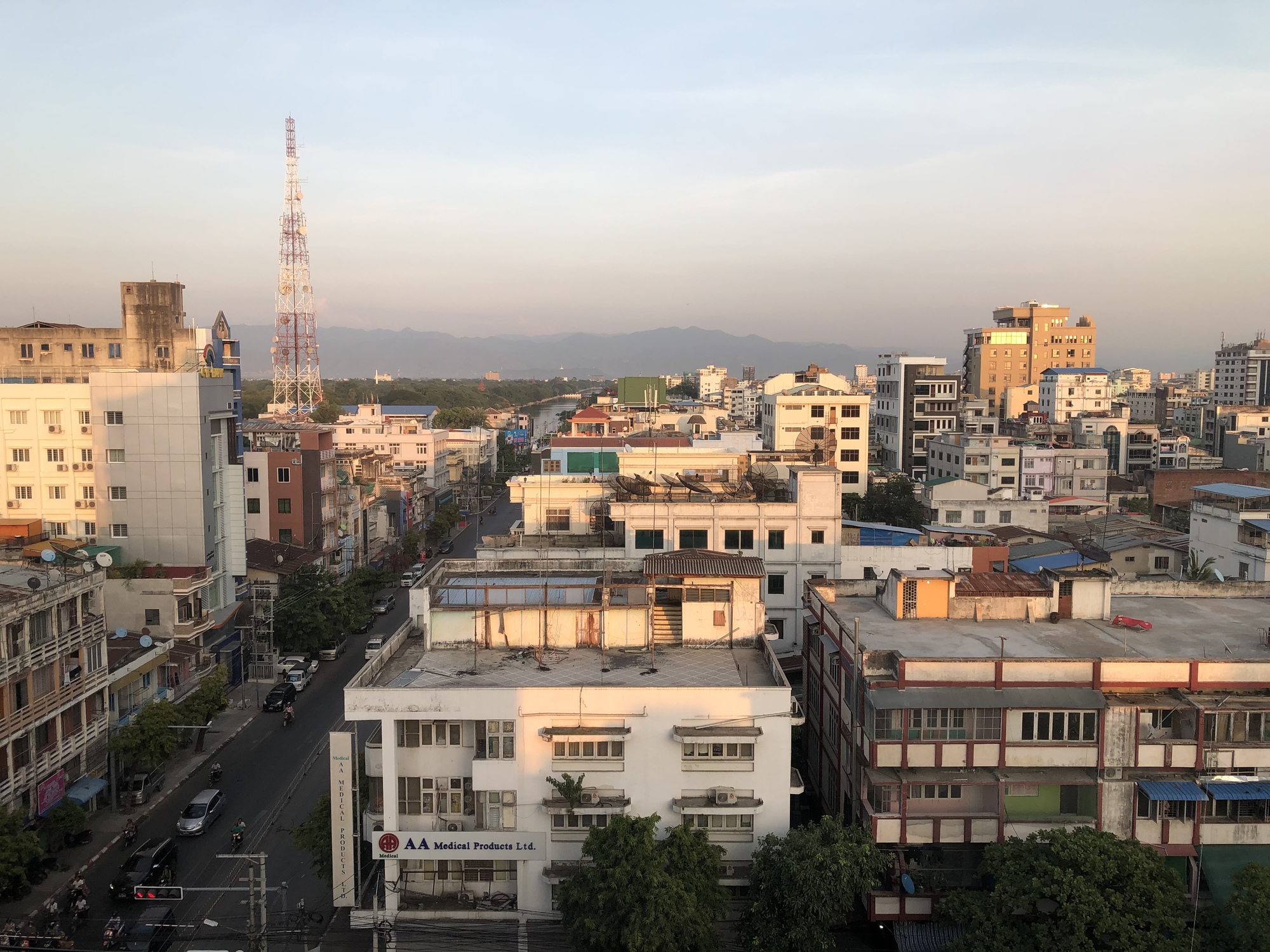 At only 24.5 miles, the ride from the airport is a distance your typical cycle tourer does before breakfast, but we were sweaty and happy and utterly worn out when the door swung open to our room on the 9th floor. The hotel manager pulled up the window shade and there was the moat, the hills, the bedraggled but vivid buildings of Mandalay. Within our view was faraway Buddhist pagodas, the steeple of a Catholic church, a South Indian Hindu temple, and out of view but soon to be heard, one of the four or five mosques in the neighboring blocks.