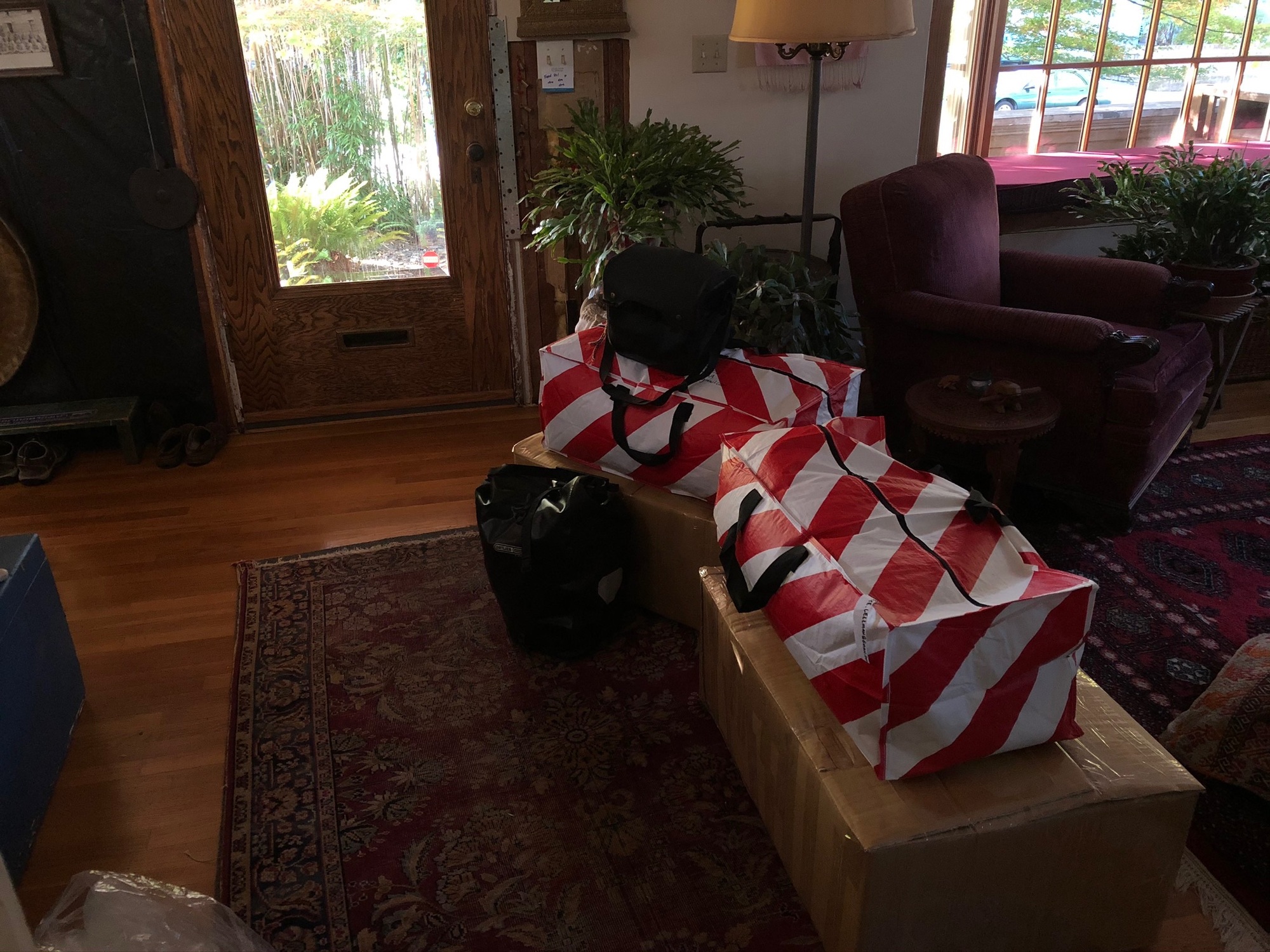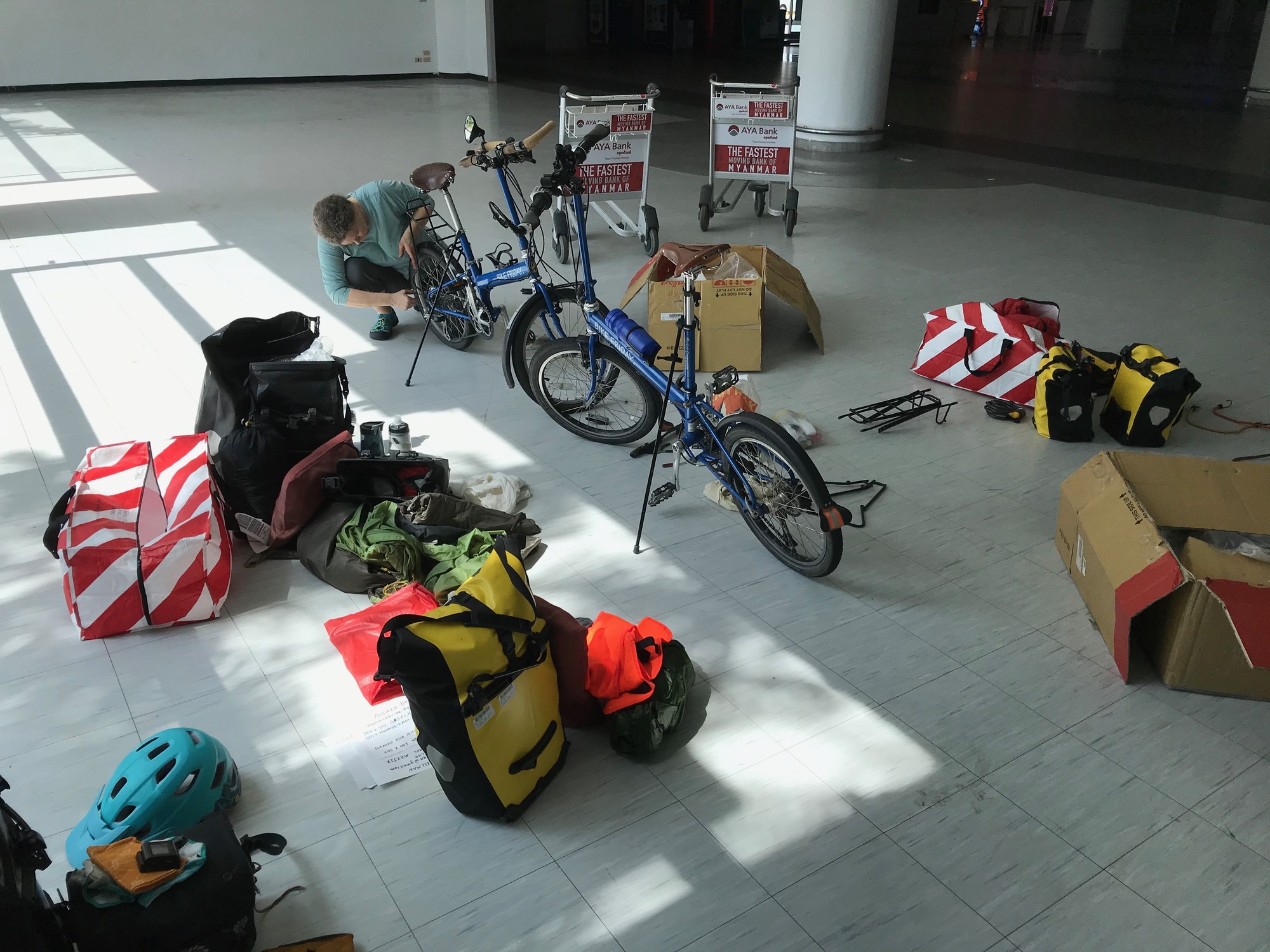 One problem we hadn’t foreseen when we bought our One Way Ticket to Mandalays is that when you have layovers longer than 8 hours you have to collect your baggage and take it with you, which is as much fun as it sounds what with two awkward bike boxes and two heavy striped bags. But we soldiered on, on through the 13-hour flight that began with a bonus three hours on the tarmac with us looking out the window at several concerned mechanics who came and went. And also unforeseen was that this flight first stopped in Qingdao and for some ominous reason the Chinese made us all deplane and go through immigration and collected our fingerprints and facial photos so we could go into some database of other foreign riffraff. They are pretty starchy about their security which felt a little much seeing as how we went through security to get on that plane in the first place and if they would just leave us on it for the remainder of the flight to Kunming all would have been peachy but nooooo.