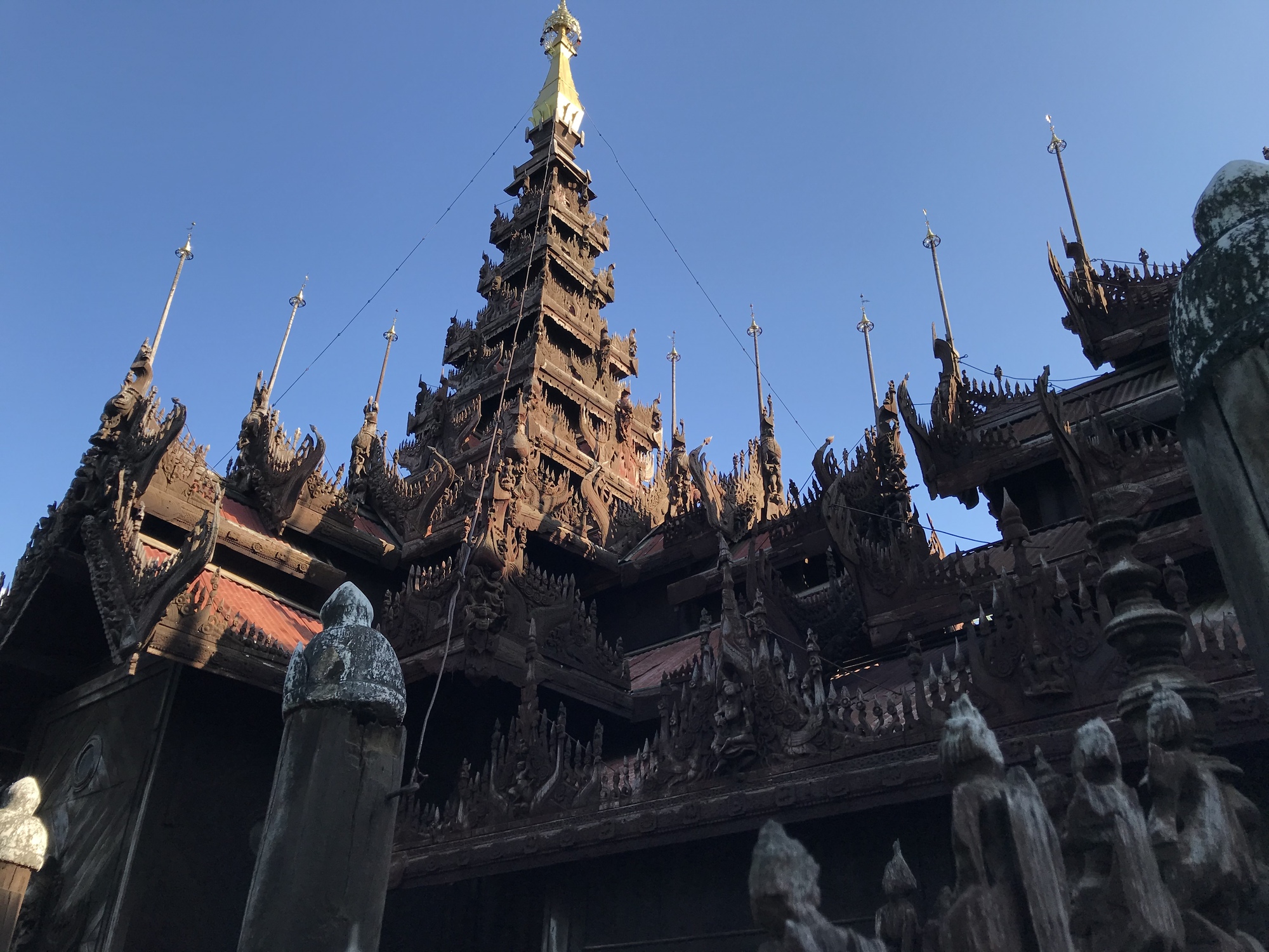 We seem to find things to keep us busy. Since I am a sweat virtuoso I seem to be constantly washing clothes and hanging them off of improbable protuberances in our room. We have a list of places that Frank Roettgen visited last time he was here, Frankie’s List, and when we’re not overcome by heat we go visit some of them, mostly some of the old wooden temples that ain’t gonna last forever. Frankie, we sucked at following your list as much as it deserved, but it was too hot to do a lot of sight-seeing.