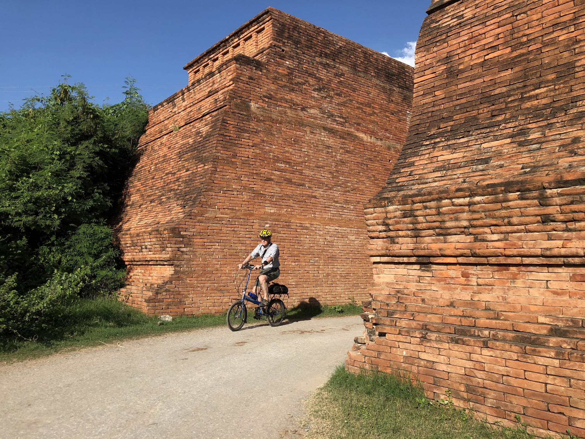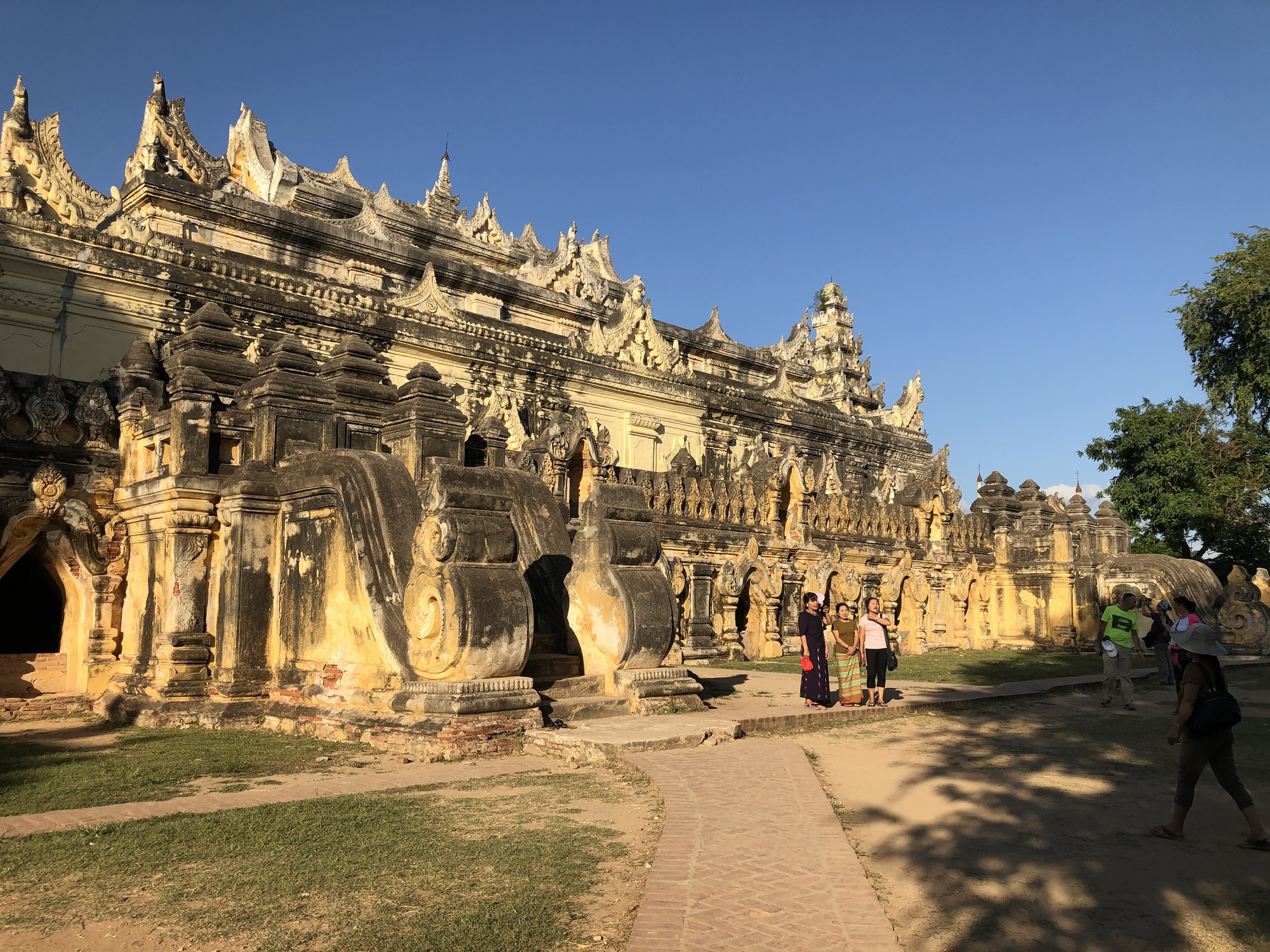 The air conditioning worked great, and once we put the mothball-smelling towels outside on the porch we settled in for a cooling nap. Then it was time to get up and explore Innwa, an historical temple site and ancient imperial capital situated on the Irrawaddy River, about four miles away. It was a gorgeous ride and the temples were fun and we just love rural Myanmar. Life is right out there, and although these folks see a lot of tourists come and go they were still cheerful and helpful. We stood along the riverbank and watched some guys swimming in the Irrawaddy with long, long bamboo poles that they were floating from place to place.