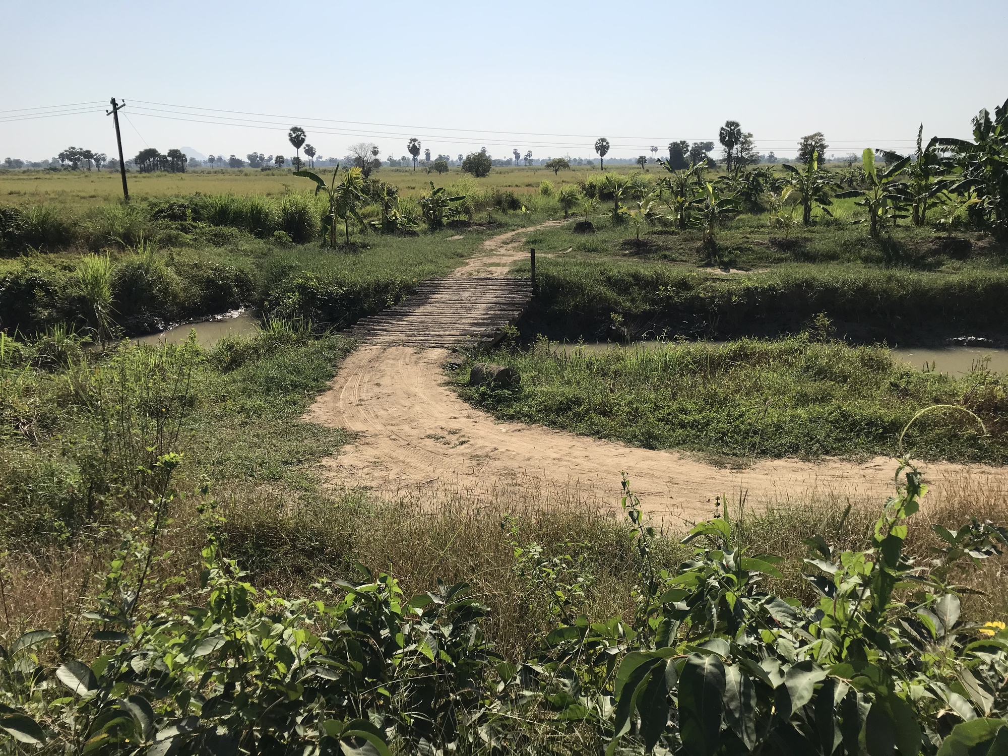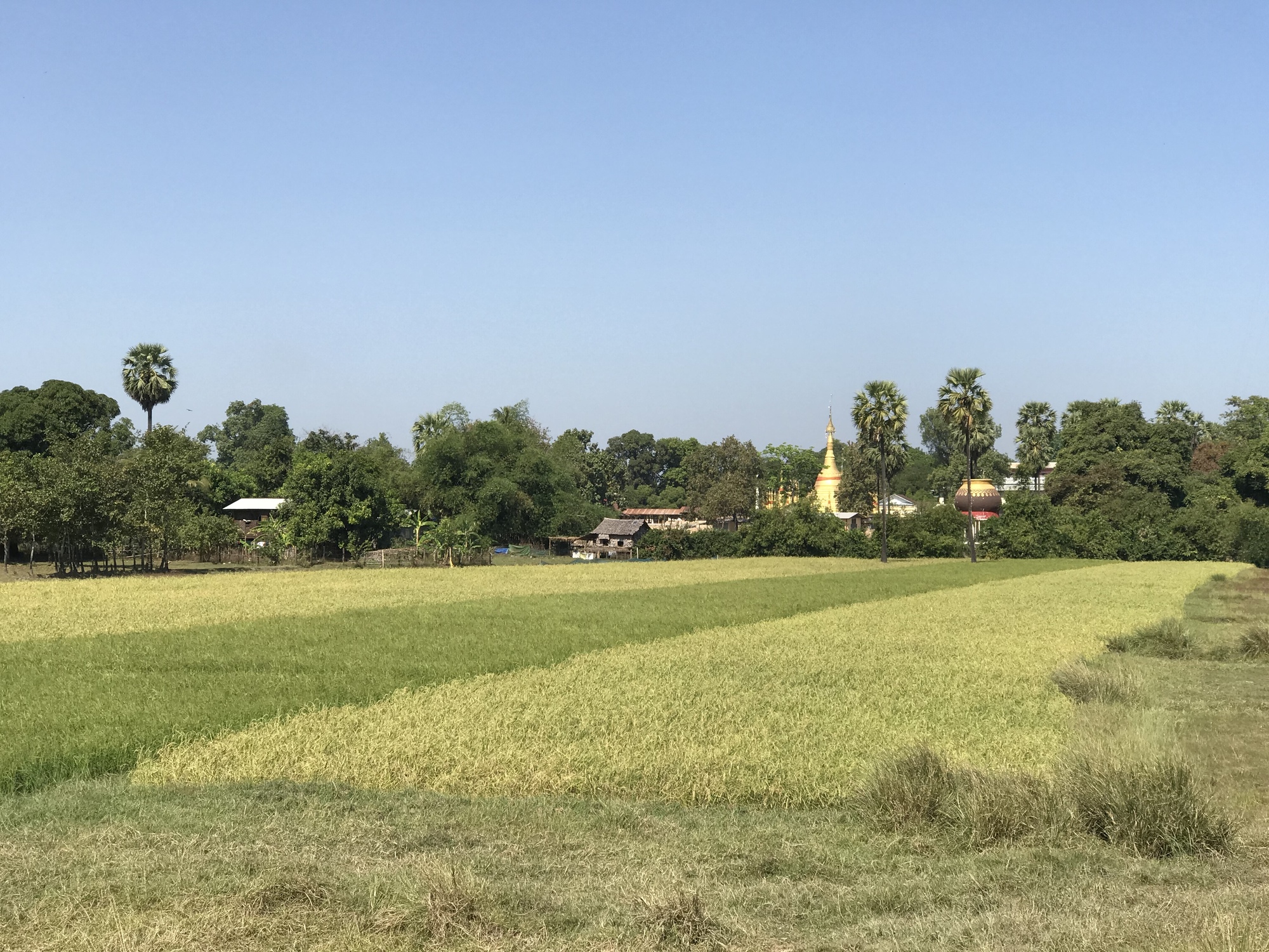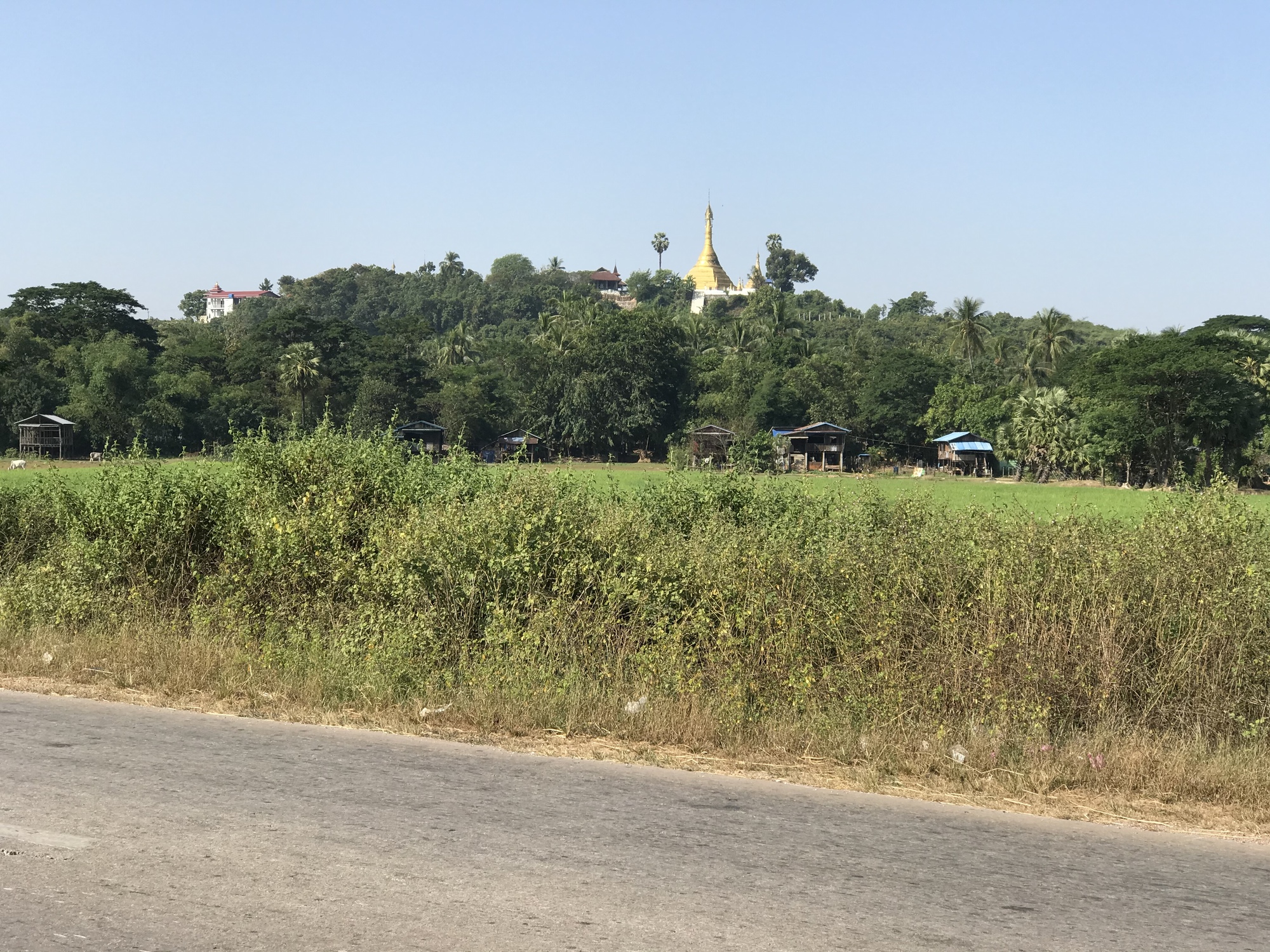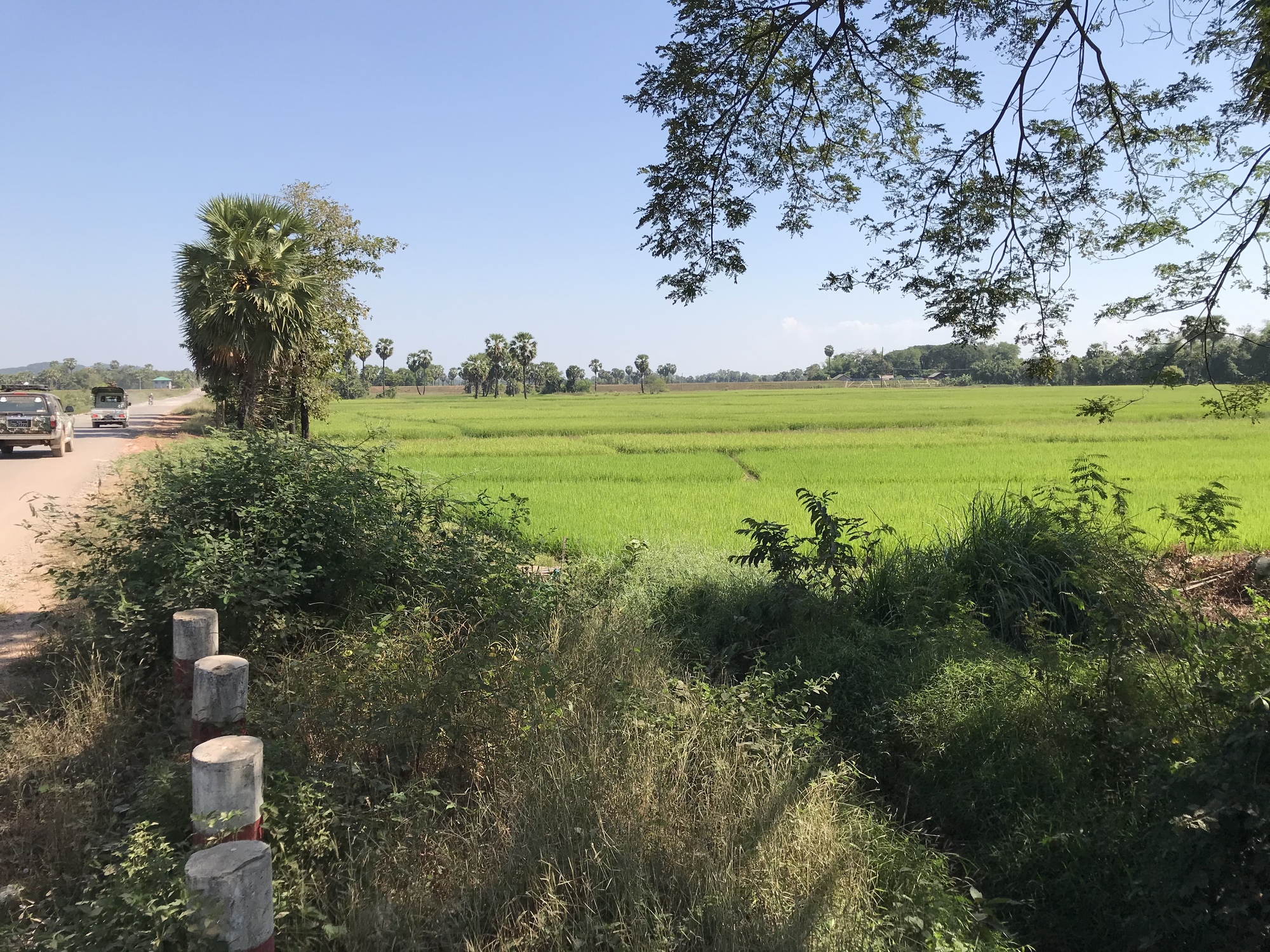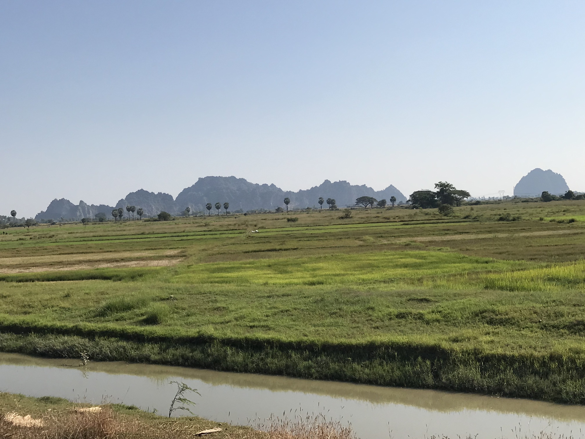 The day started out nice. The first thirteen miles were a retracing of our ride to Hpa An. There were once again green rice fields, golden pagodas shining in the distance, birds singing beautifully and then the area of big shade trees making the road a dark tunnel and lots of watermelon vendors underneath. Then the long line of tall palm trees on either side of the road. It was all familiar to us and that section of the road was good too. It was slightly cooler, say, 91 instead of 99, but it was still early in the day. Then there were those two bridges where I had been freaking out the first time we rode over them a week ago. I had been dreading riding them again but even that went better than the first time. I was more confident and I didn’t have to stop mid-bridge to freak out and I didn’t slip a tire between rusted slats! Things were looking good.