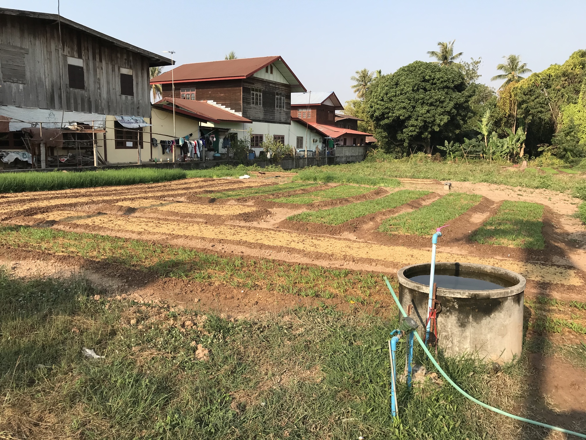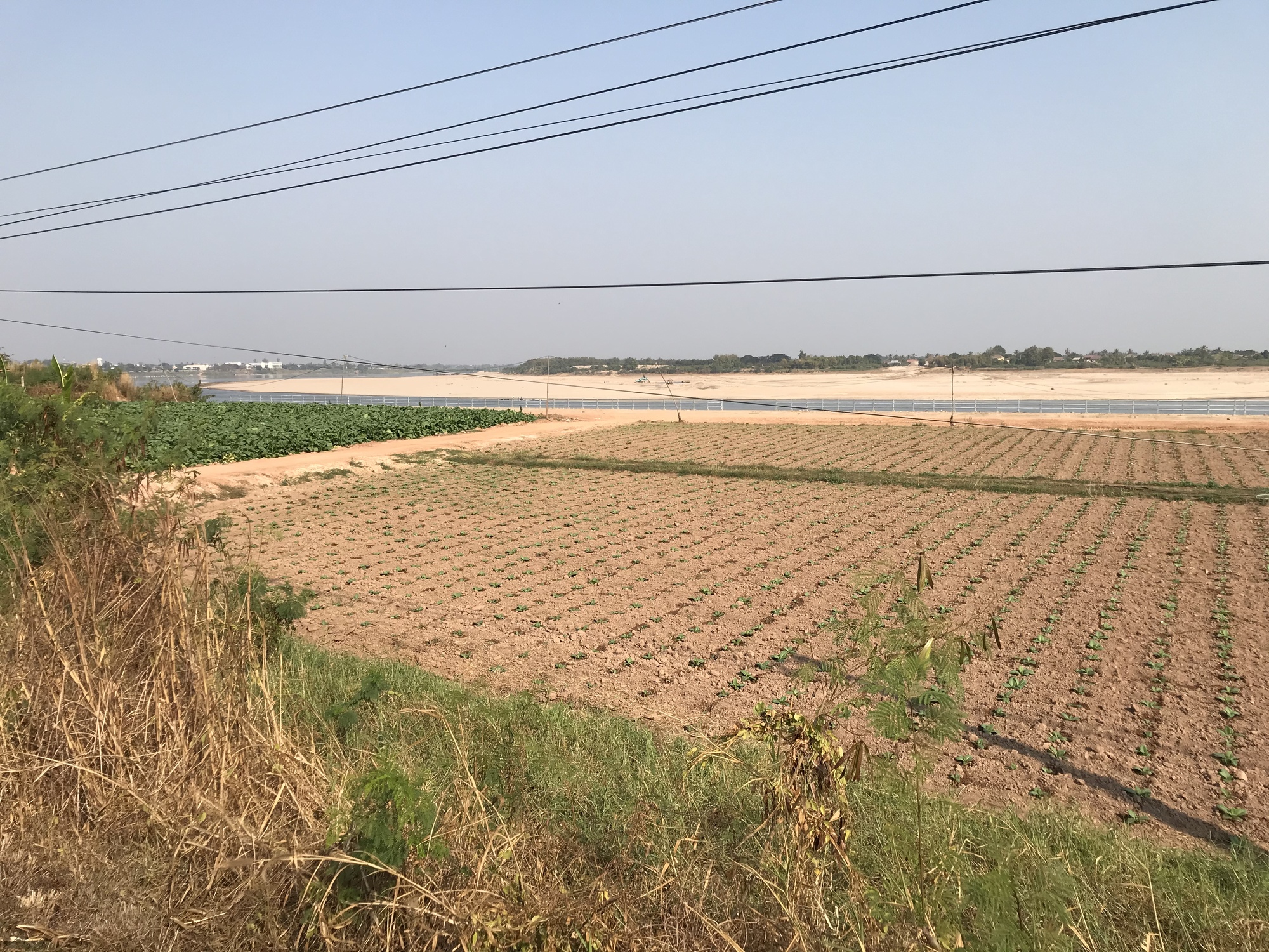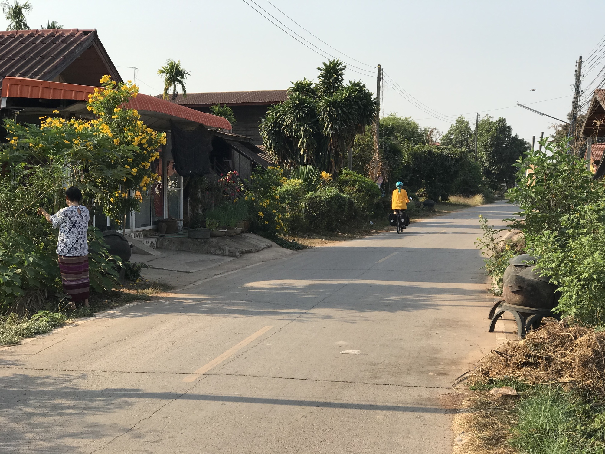 After a brief ride on the highway we were able to make our exit into a village and go through a lot of tobacco farms. Tobacco takes a lot of water and the Mekong was doing the heavy lifting on that with pumps and pipes in the fields. I stopped to wait for Bruce and drink some water and film two kittens enjoying the morning and minding their own business.