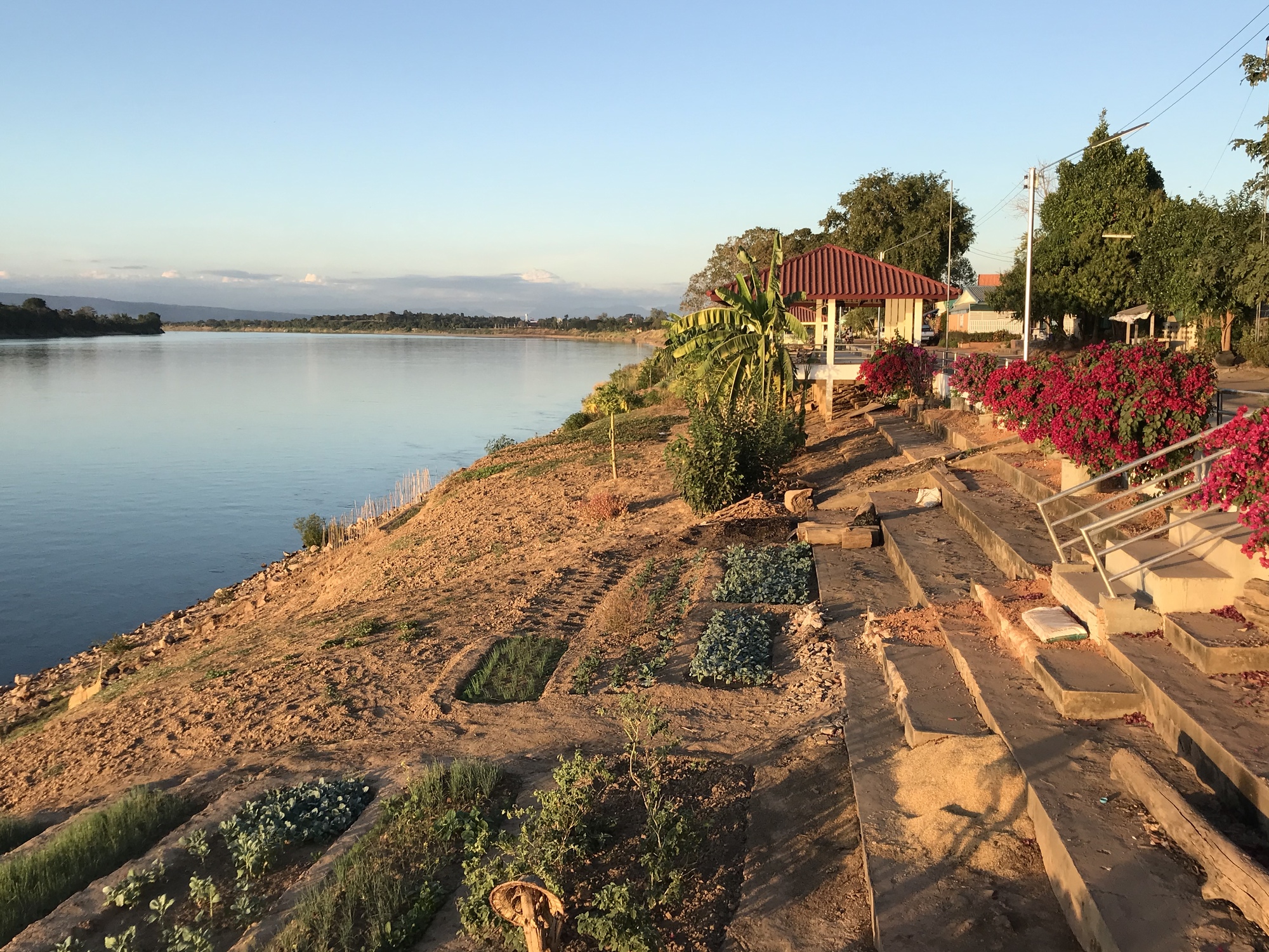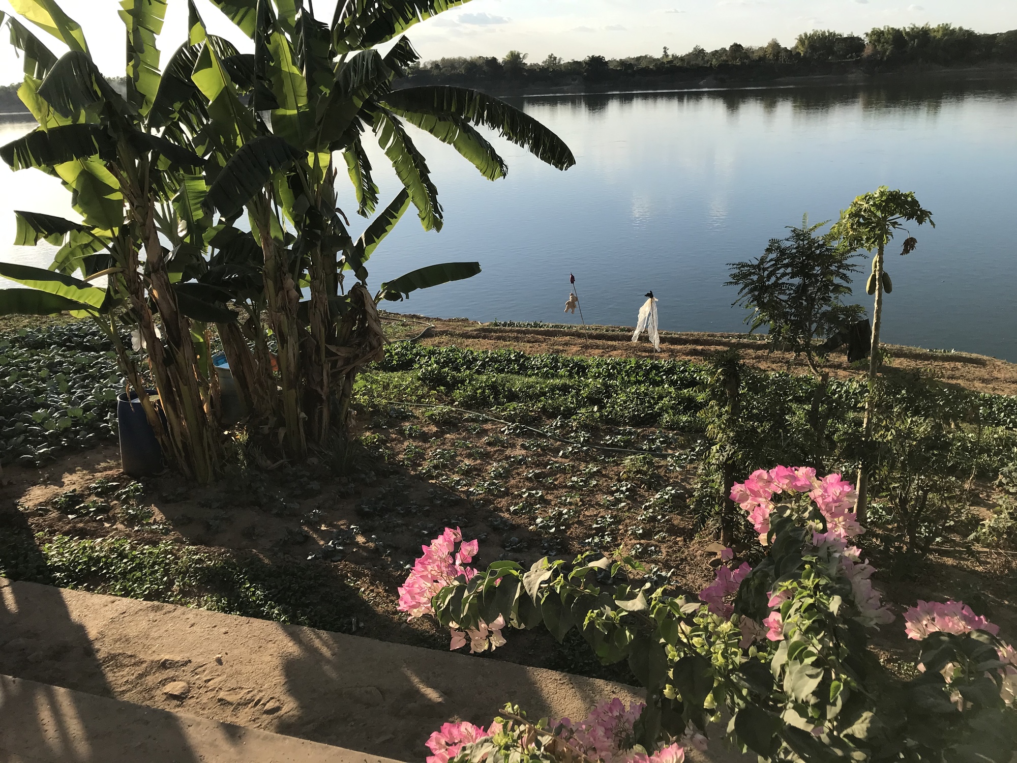 When we were finished eating we went back to our room to wash our bowls but quickly returned to the promenade because it was so beautiful with all the people enjoying the finish to the day overlooking the amazing Mekong at sunset. This is an old promenade and either there never were big jagged rocks dumped along the shore or they have since been covered up with soil because all along the banks were many peoples’ vegetable gardens meticulously cared for. Another thing Thais love and do well - gardening.