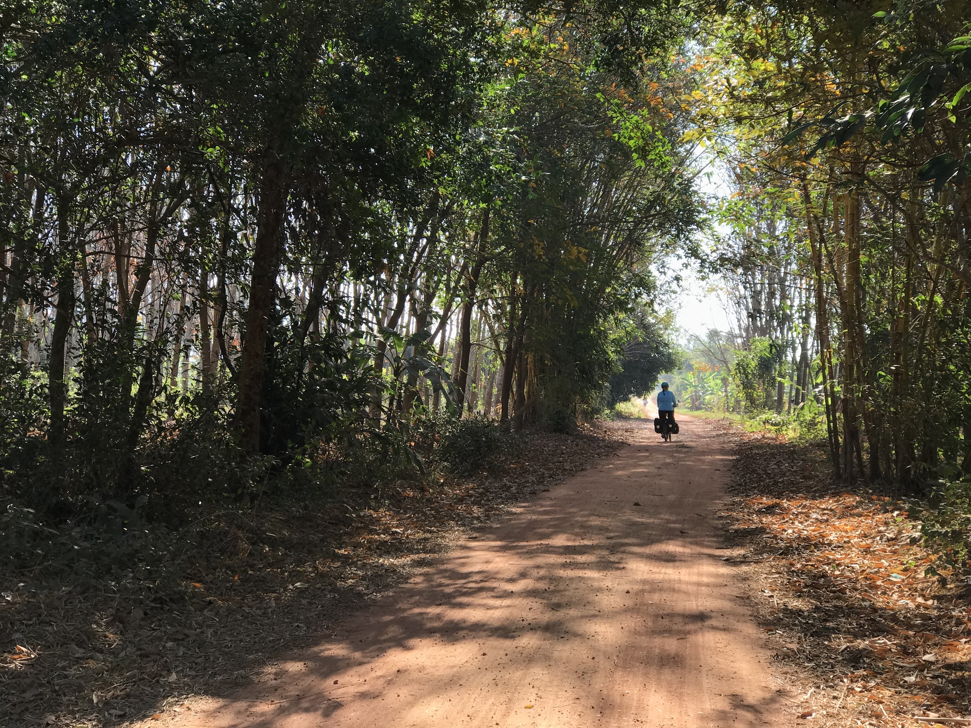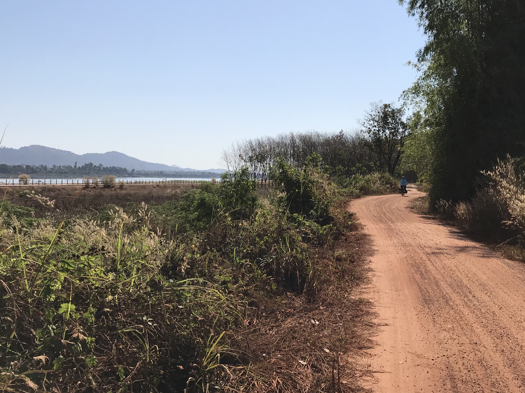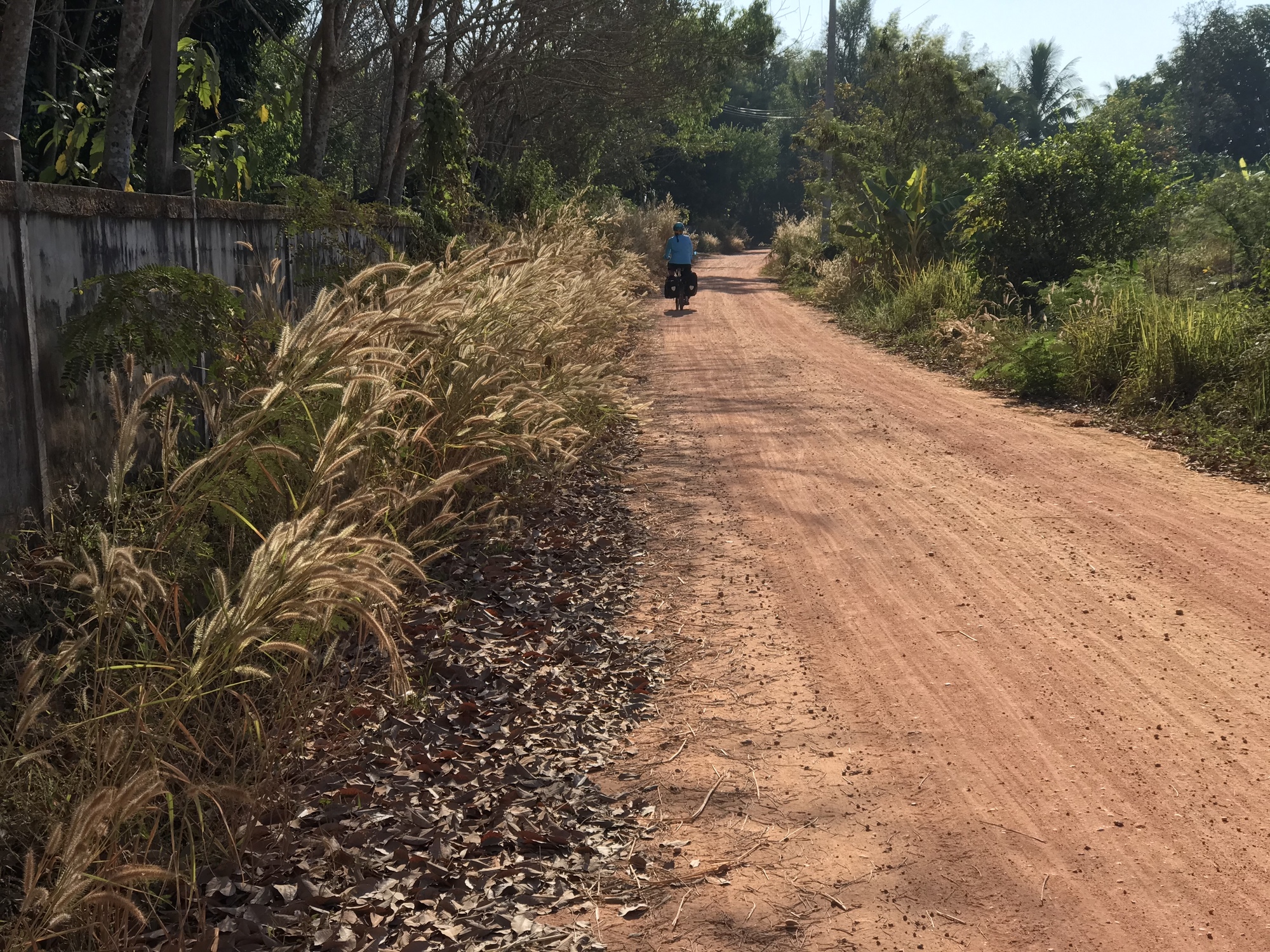 After thoroughly enjoying the sunrise and breakfast on the beautiful all wood porch of our all wood little bungalow we simply headed south on the promenade along the banks of the Mekong. Eventually we were so far out in the middle of nowhere the promenade was quite overgrown so we switched to the road alongside it. We love riding out where few people are because we can listen to birds and meet every dog in the vicinity.