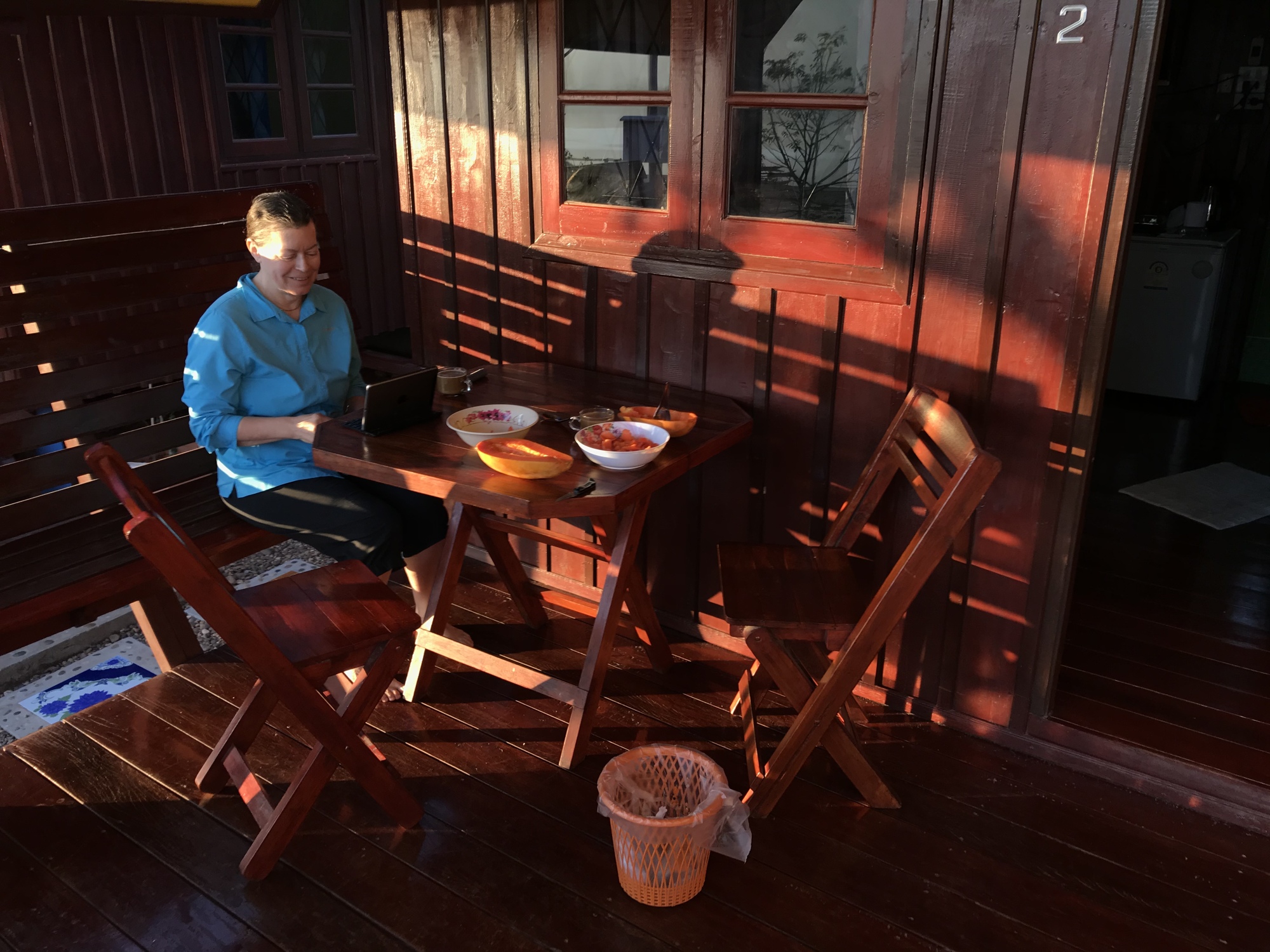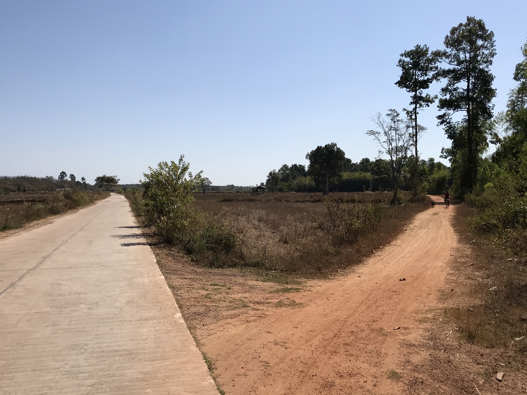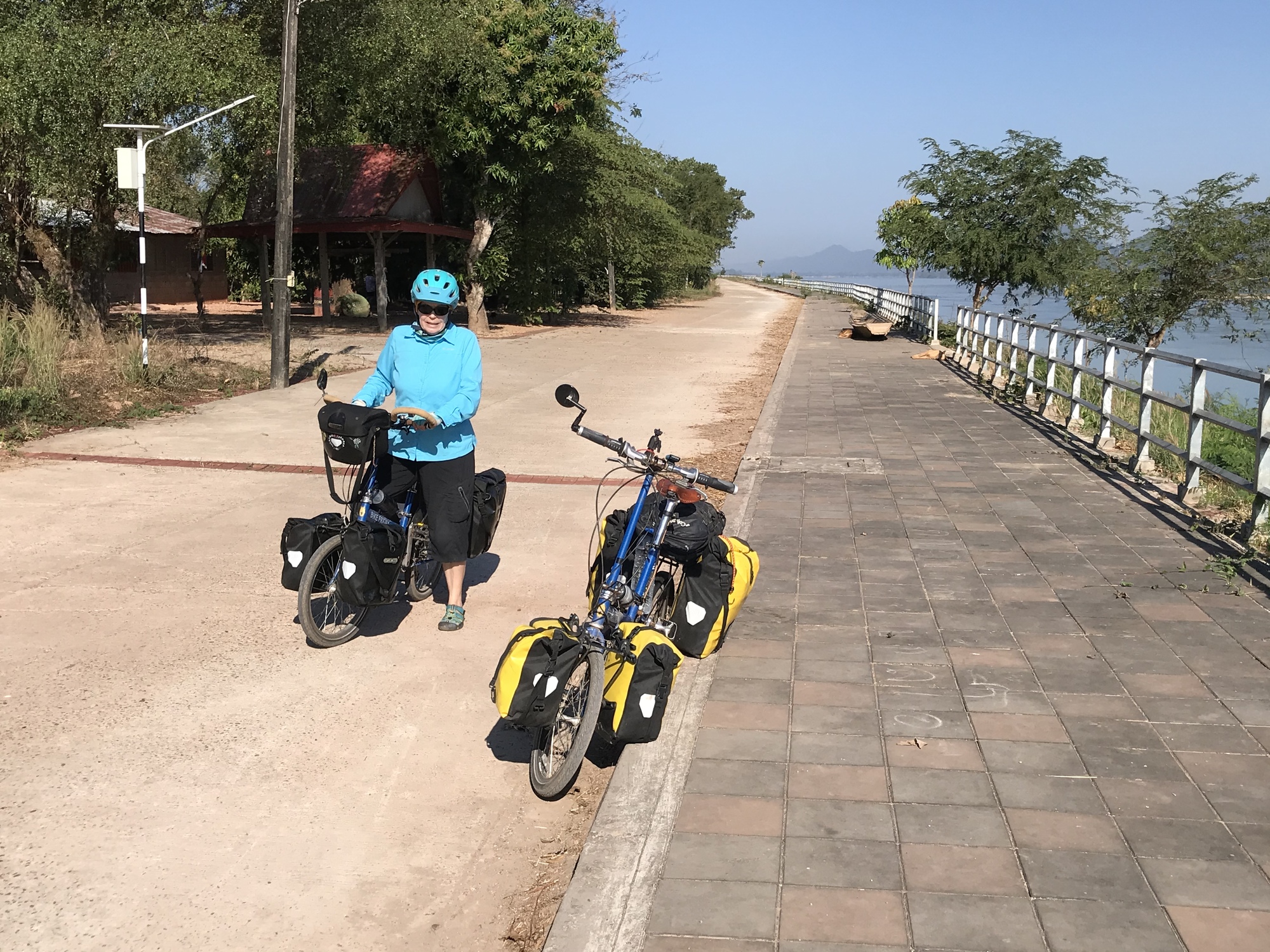 After thoroughly enjoying the sunrise and breakfast on the beautiful all wood porch of our all wood little bungalow we simply headed south on the promenade along the banks of the Mekong. Eventually we were so far out in the middle of nowhere the promenade was quite overgrown so we switched to the road alongside it. We love riding out where few people are because we can listen to birds and meet every dog in the vicinity.