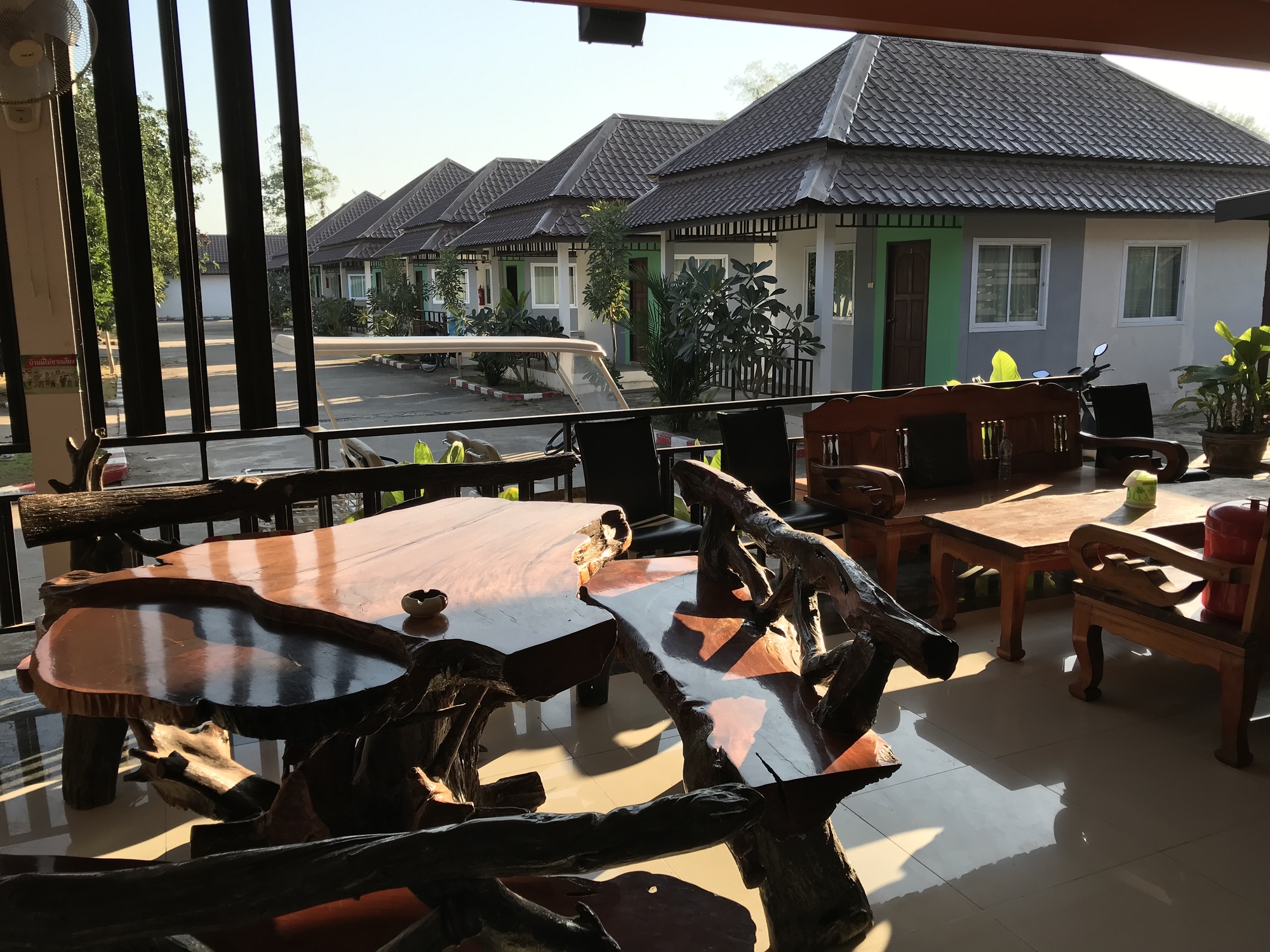 We went past a nice looking resort on the outskirts of the town Ban Phaeng but we were heading to a different resort on the opposite outskirts of town. First we wheeled into the nice looking town and to the market. We came away with what we needed for breakfast. Yes, you guessed it, a papaya and a mango and a small carton of soy milk. It is a bit of relief knowing that in the early morning we can eat something in our room and just go afterwards and ride for hours without needing anything more.
