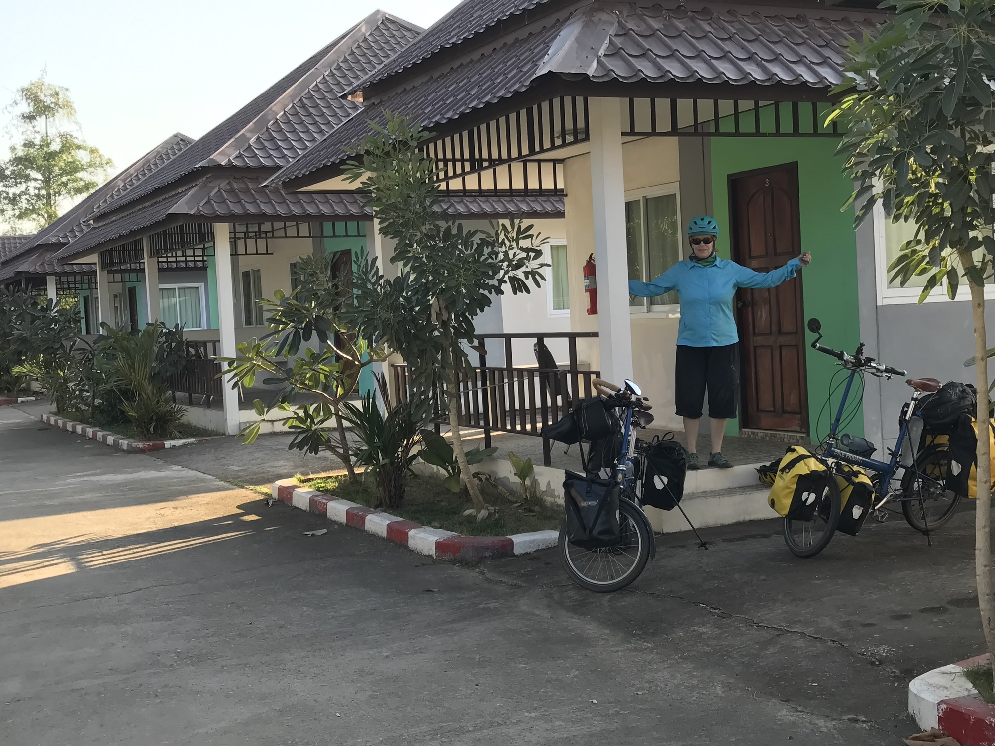 It’s amazing how many dogs people living in the country keep. Because the dogs never see anyone like us they are either terrified and run or they don’t like our scent and want to take us out. But then there is Andrea who, it turns out and lucky for me, is a sort of dog whisperer. We stop or nearly stop when angry dogs are approaching us and she calmly tells the dogs that they are doing a good job of protecting their owner’s place and that they are OK and there is nothing to get all worked up about. If I say one word to the dogs Andrea tells me to shut up because my voice just gets them madder. I’ve been bit twice by dogs in Thailand and have gone through the whole series of rabies shots twice so I tend to listen to Andrea. She’s a sort of Bruce whisperer as well as dog whisperer.