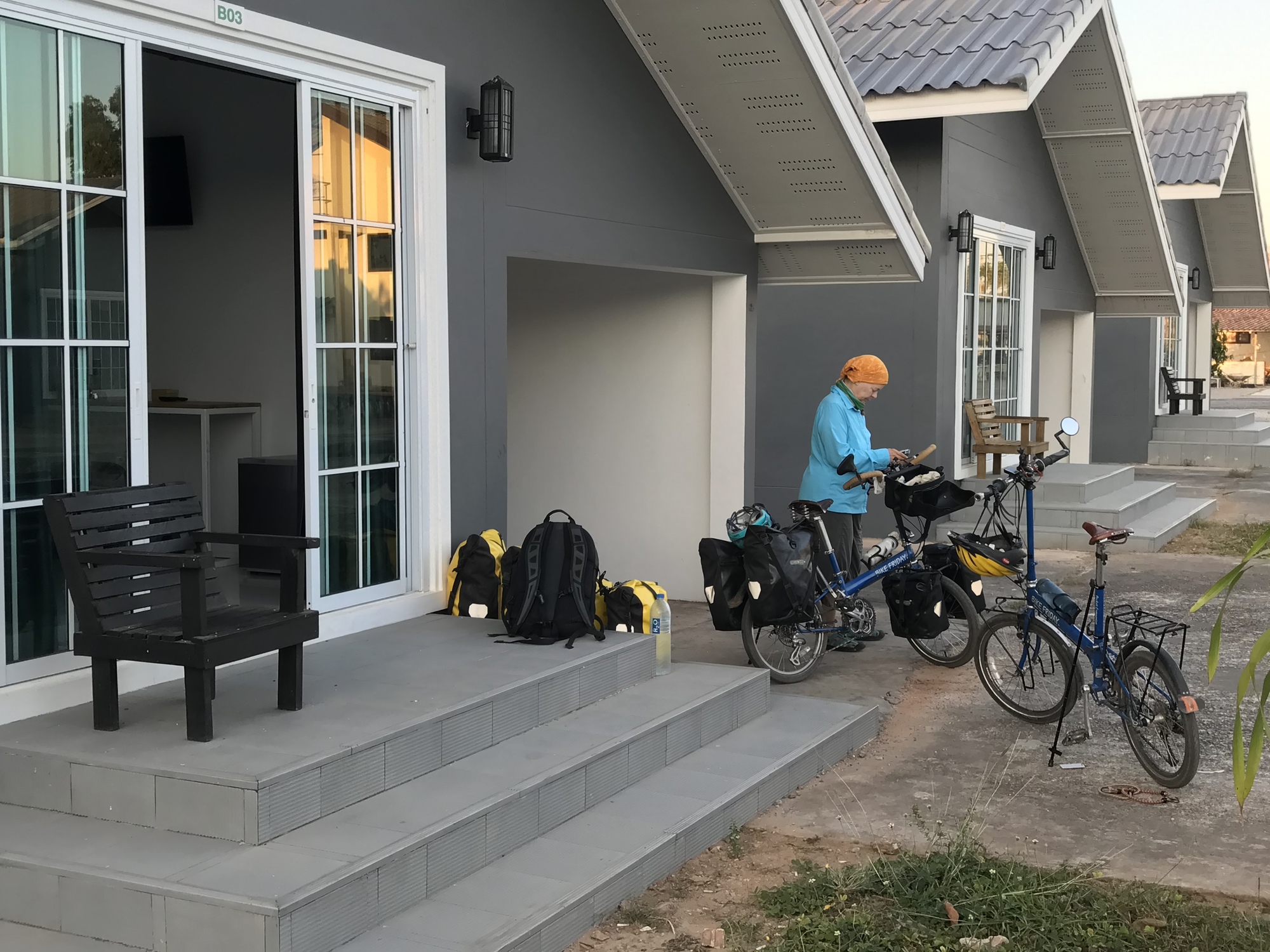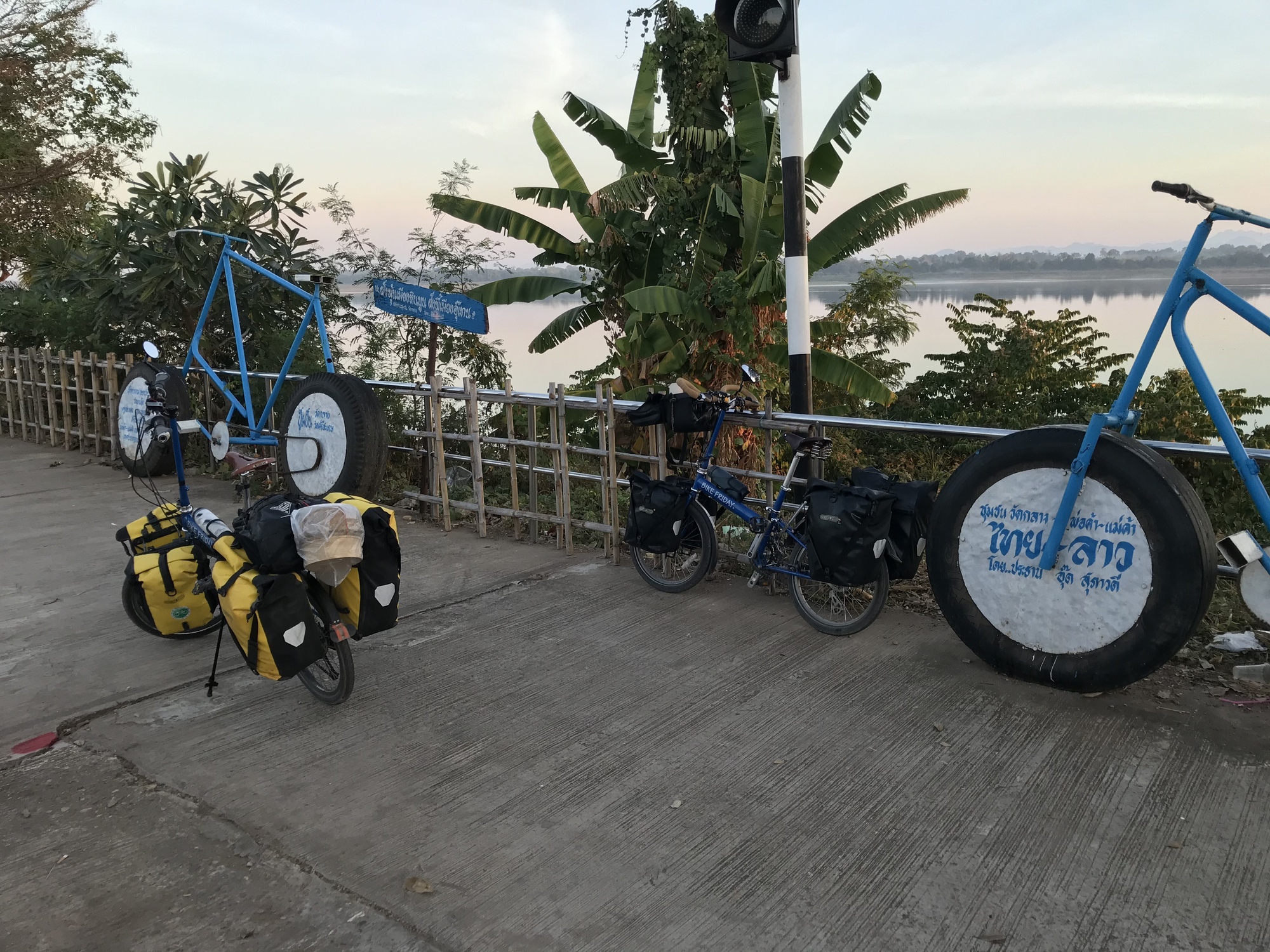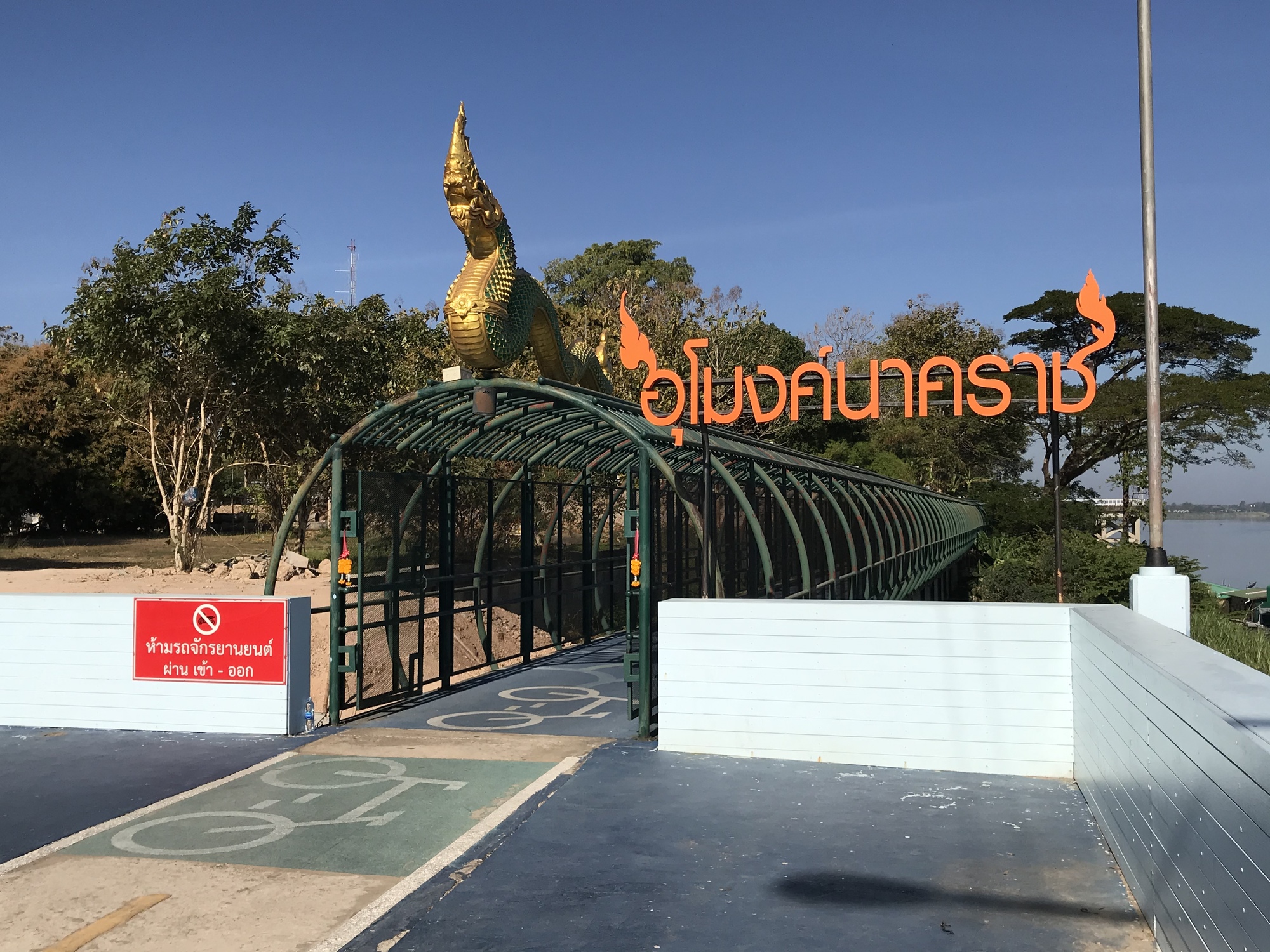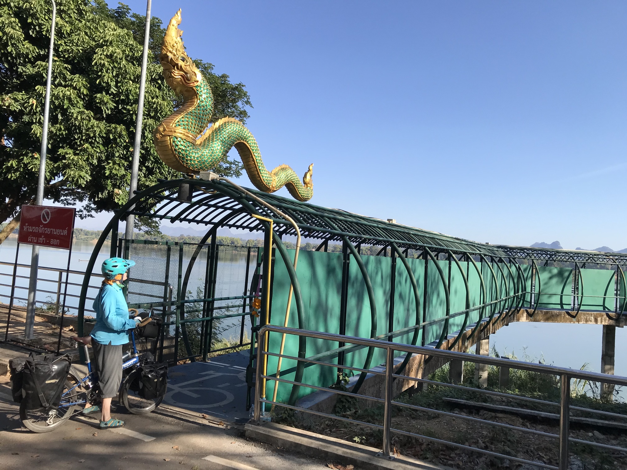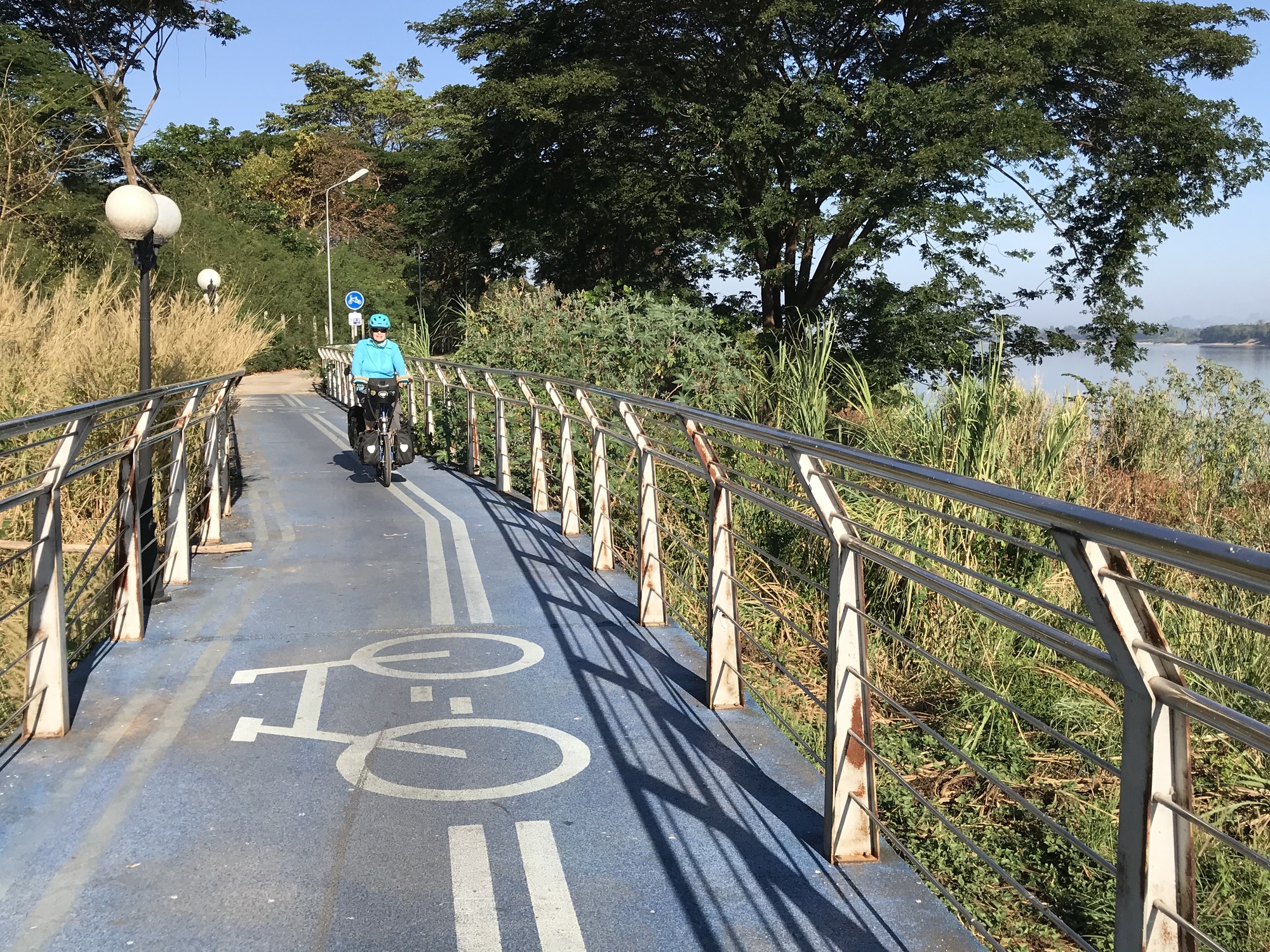 A few miles north of Nakhon Phanom is one of the four “Friendship Bridges” across the Mekong to Laos. As soon as we passed under it we could get back to a road right along the river. From there we could ride all the way into Nakhon Phanom and what a long and lovely entrance it was. There is an actual bike path in addition to the promenade and road which featured first a long bridge over a small tributary river made just for cyclists. Then, further on, was what they called, The Tunnel.