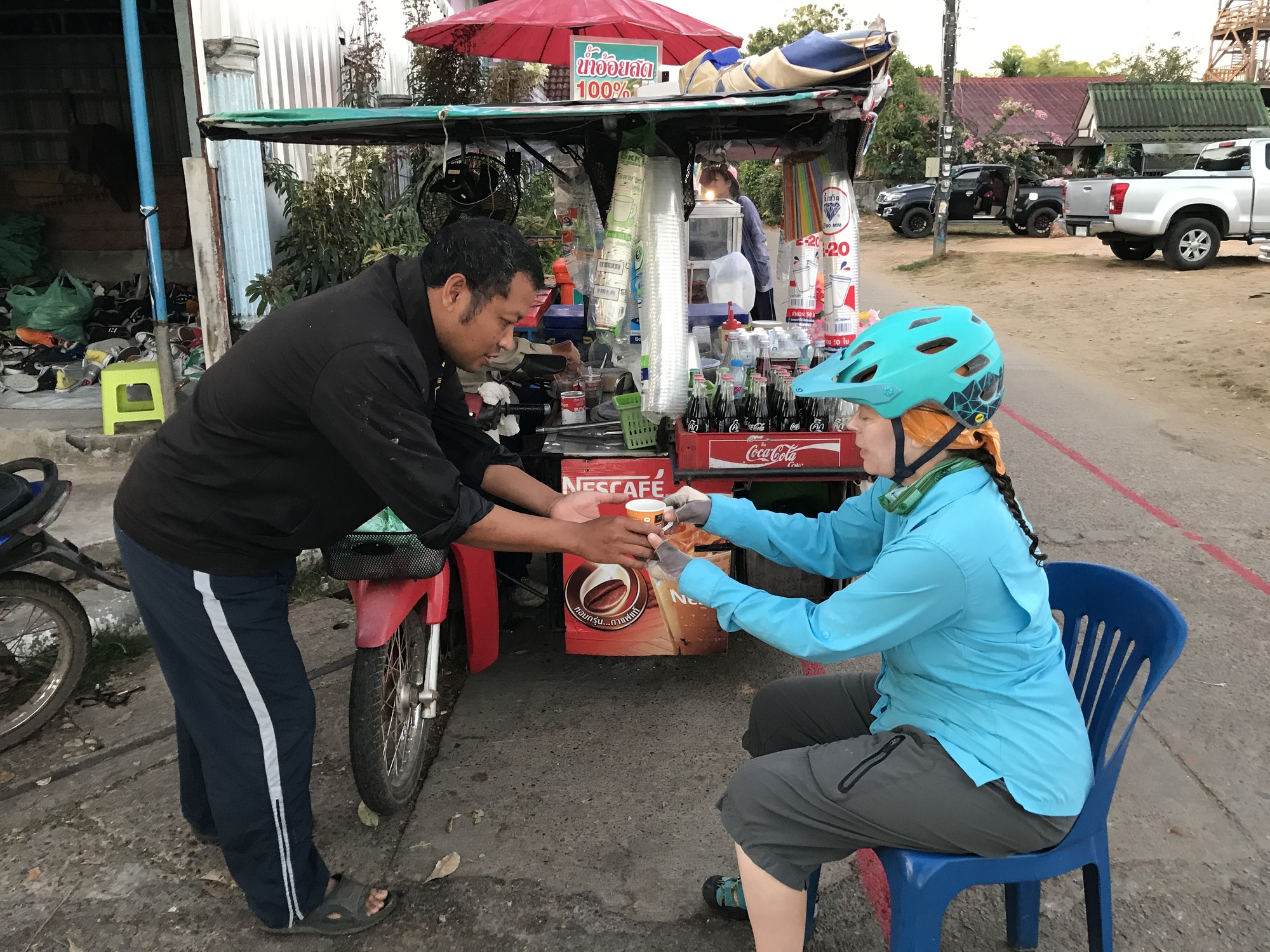 To me it was a Lucky Morning Basket and with it tied and dangling off my rear panniers we tried to go a little further. That time we got another meter or two before the lure of the Cafe Bolan stand hooked us. At that point I gave up and parked my bike. Everyone was being so welcoming. I think those vendors come to that particular street every so often but it seemed like we were the first foreigners to ever participate in their fun, and so early. We were their first customers and they were thrilled we were there. I had the feeling many of the vendors, especially the basket weavers, had come from across the river in Laos. There was an international flair to the whole affair!