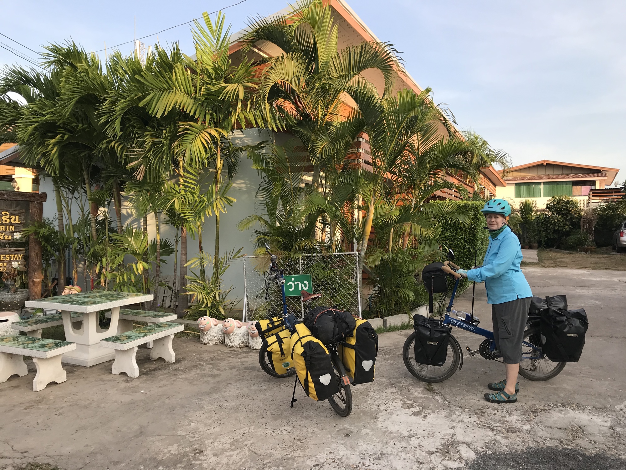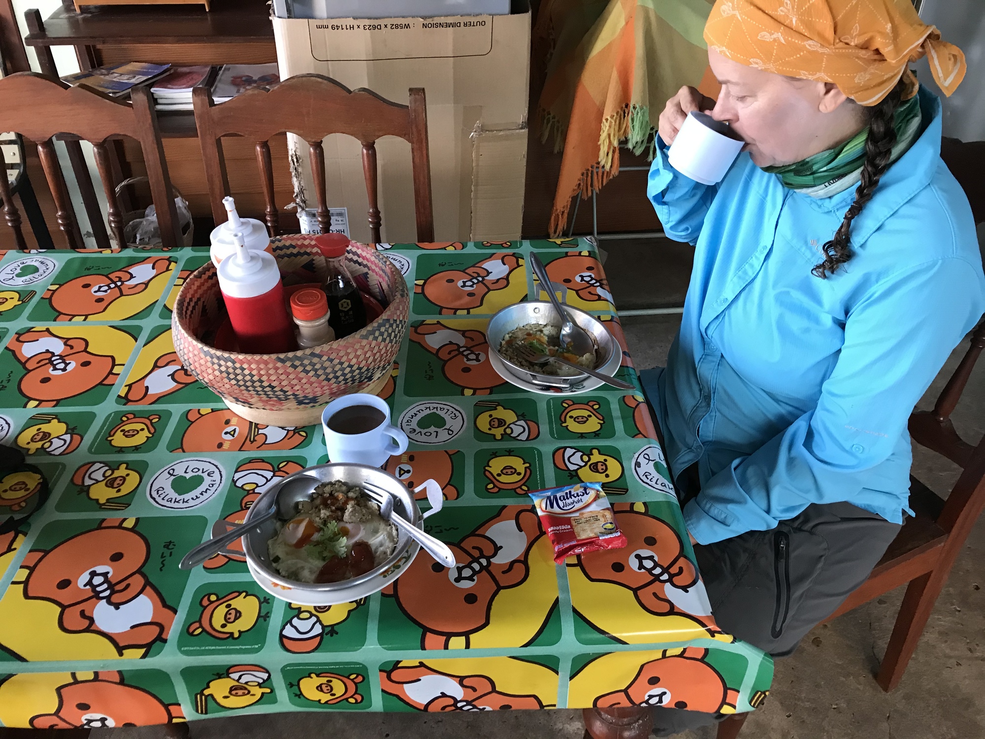 For a third day in a row we were determined to get an early start so we got up at 5AM. We had our usual papaya/etc./muesli breakfast out on our nice little porch in the dark while birds were waking up with us. We packed up, loaded our bikes and were pushing off when the owner of our “homestay” came running from his house across the street telling us breakfast was ready. There is no way we could disappoint him plus, I can always eat Second Breakfast. Normally there would be more separation of time between first and second breakfast but, well, we’re on a bike trip - who cares!