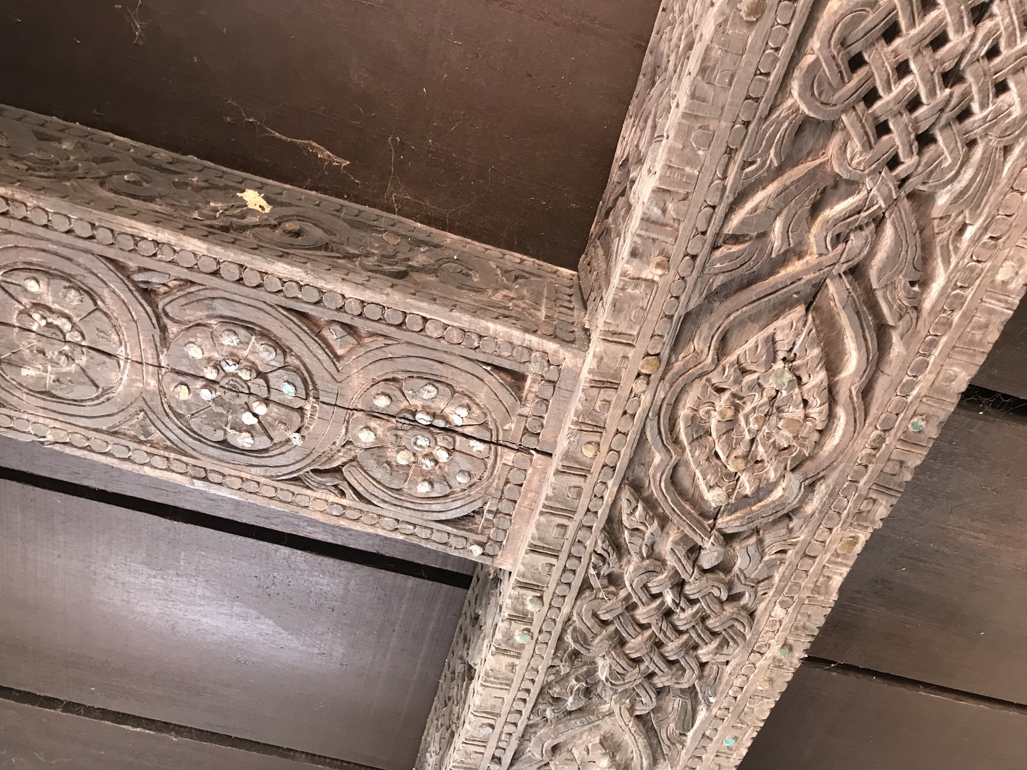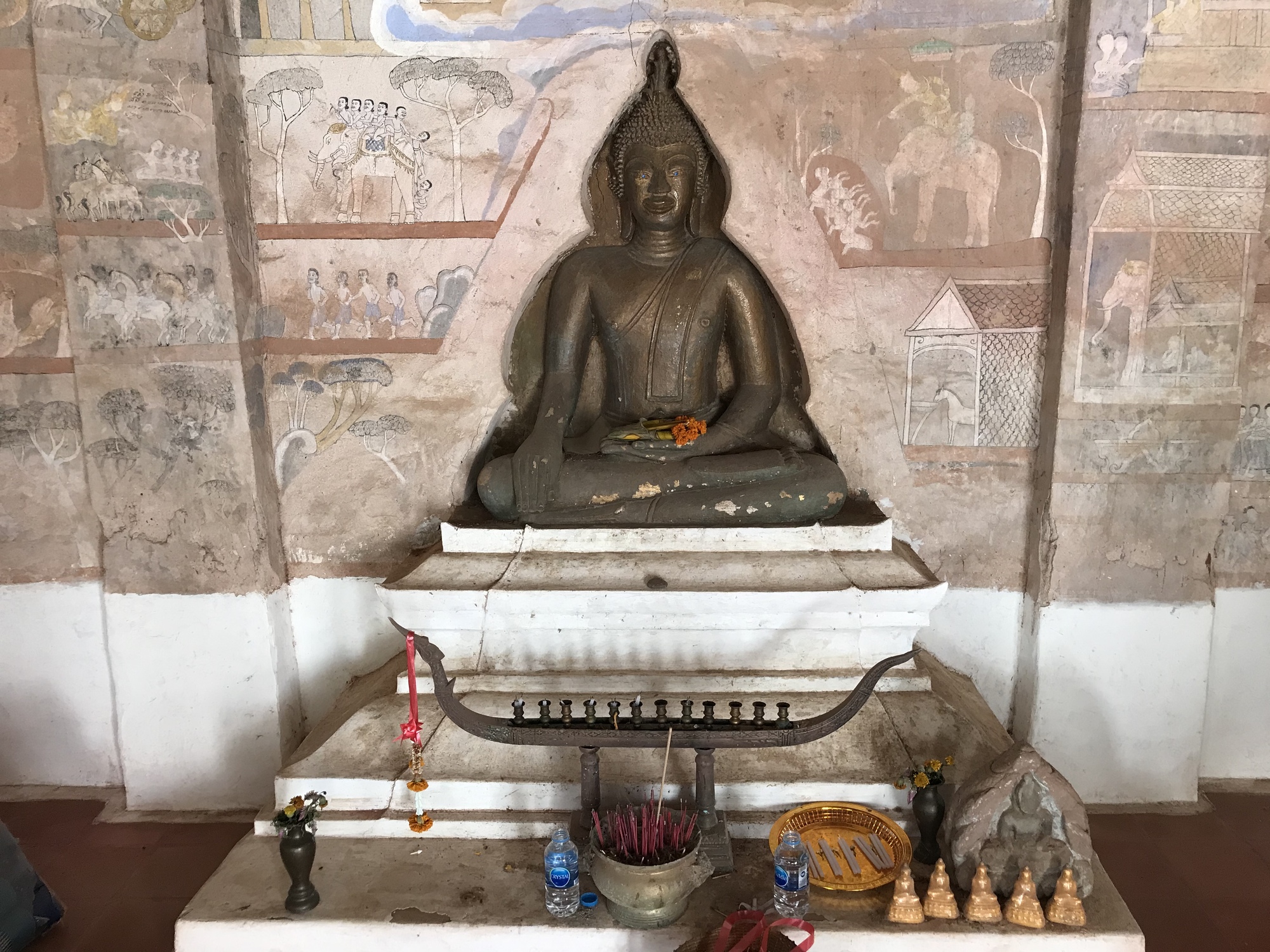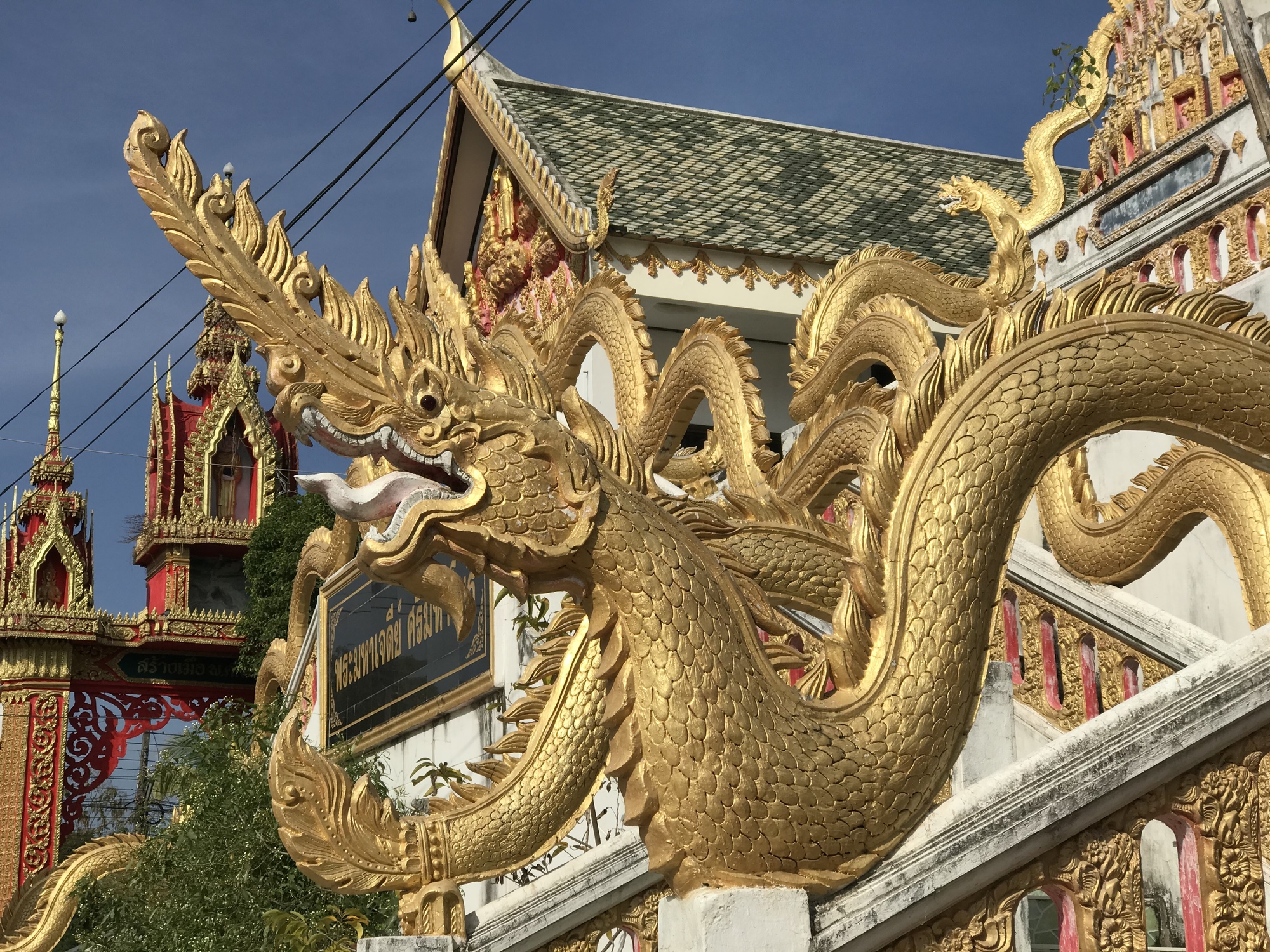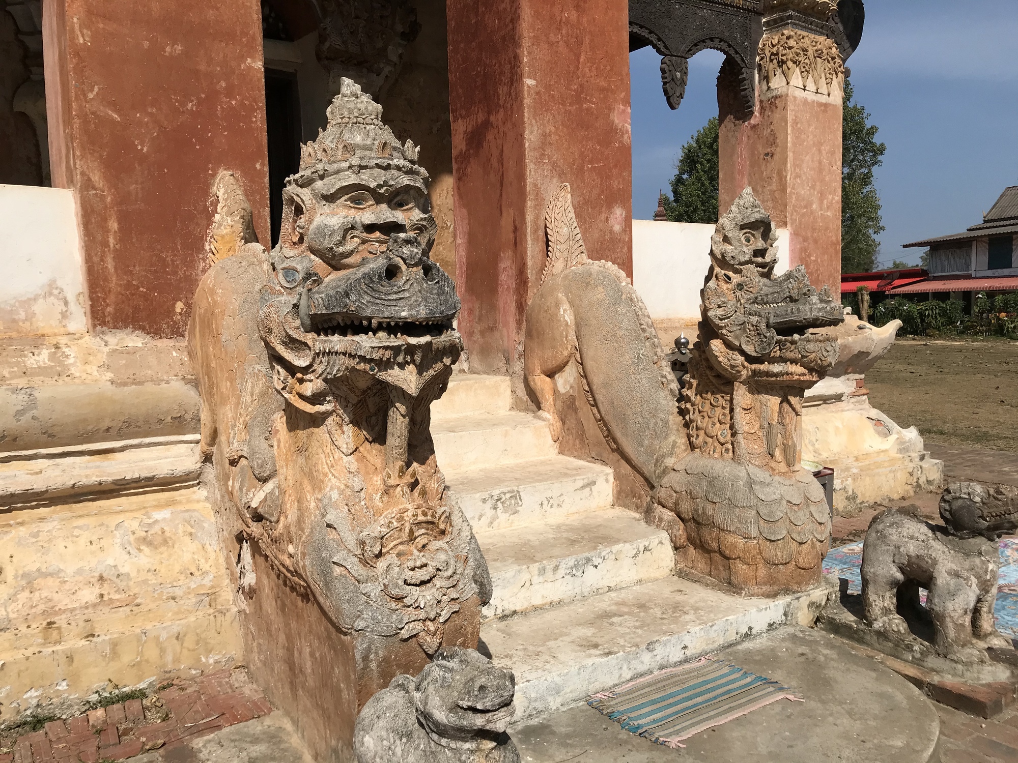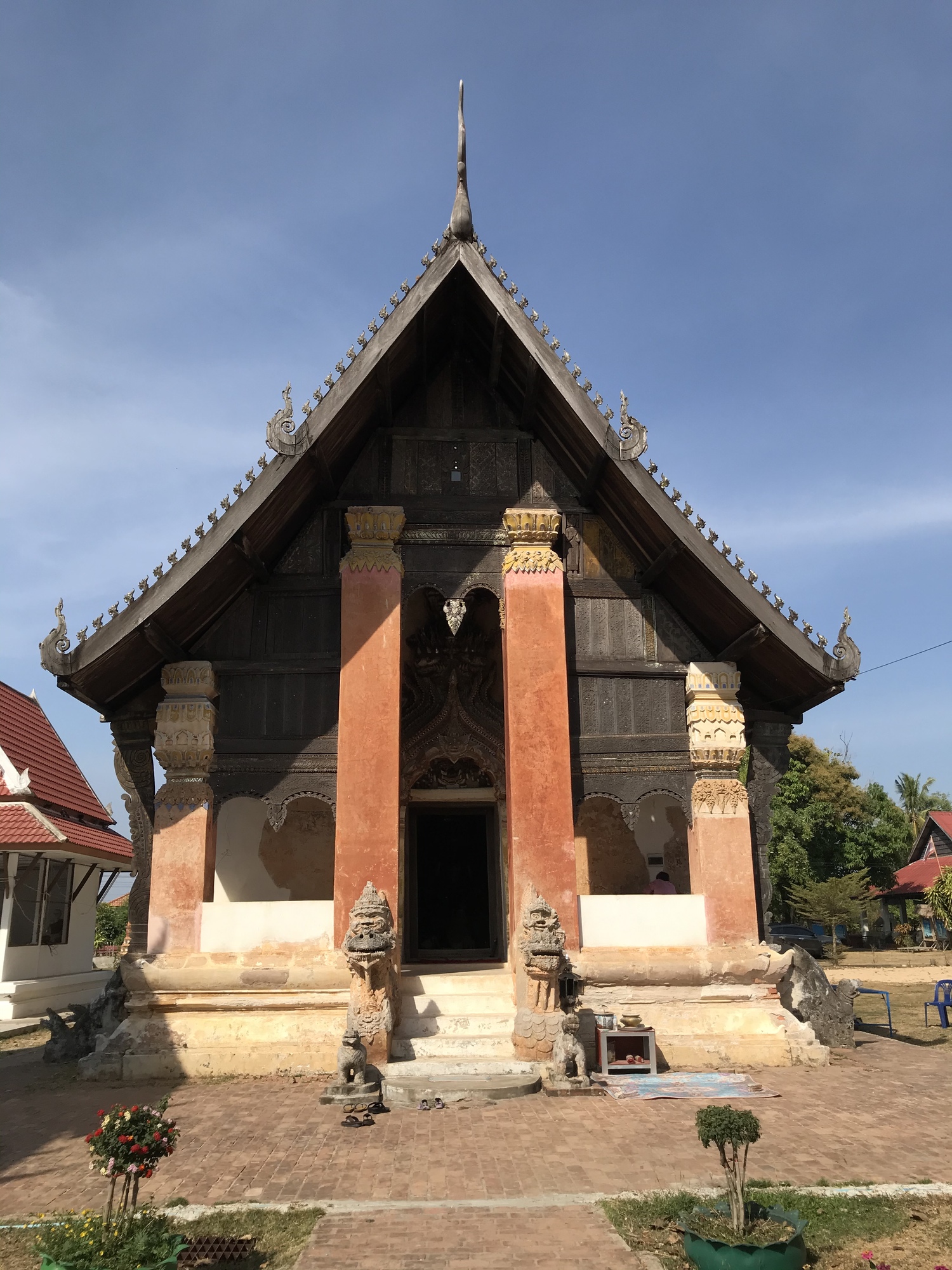 The second old temple, a few miles down the road, was new to us. It, too, was right on the Mekong and was much much larger than the first old one. It also seemed a lot older. The Nagas at either side of the entrance were of a completely different style than we had been seeing. And there were other elements that were different such as the entire front facade which was carved wood.