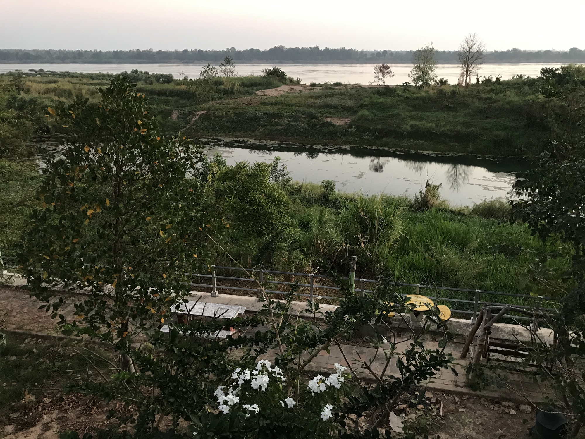 She left and we had the place and three cats all to ourselves. We had a front porch and a side porch that was very private and faced a pond and beyond that the river. Next to our bungalow was a large dining area with stairs to the roof and a great view of the river. It was sad that no other guests were enjoying the beauty of the place. The dining area was the perfect set up for a large party complete with a bar.