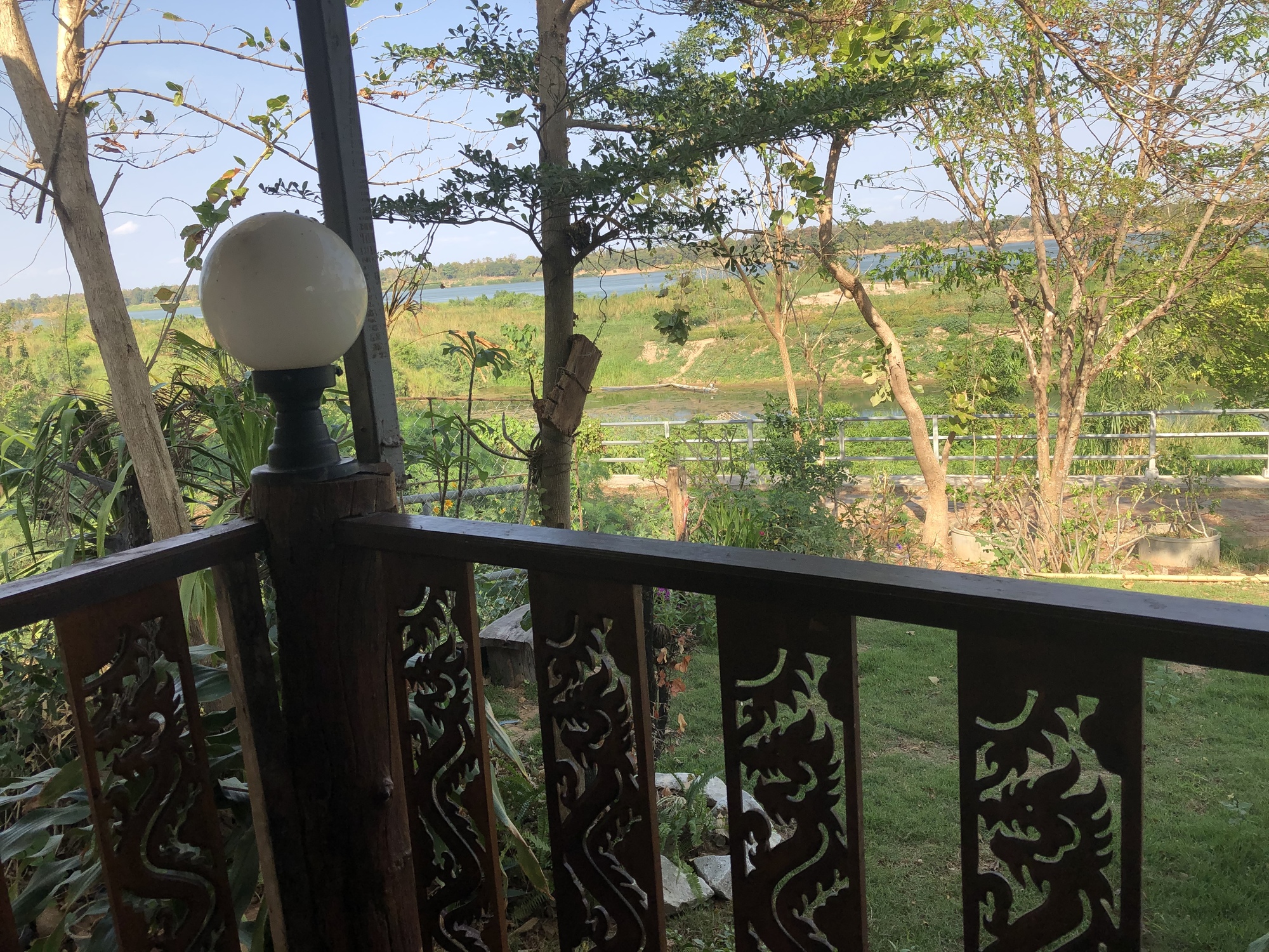 It wasn’t far. Kiang Khong Resort consisted of 10 beautiful wooden bungalows overlooking the Mekong River. The grounds were full of nice plantings. We looked all around and decided which bungalow we’d take. No one was there but a phone number was posted. Andrea called and got a woman who said something to her in Thai and then hung up. We were perplexed but after a very few minutes a pick-up truck pulled in and who should get out but that same woman we met waiting for coffee. We had no idea she was actually the owner! She was thrilled we were there and had already picked out a bungalow. It was already for guests with water in the fridge and towels in a basket. She was organized but she sure needed some customers.