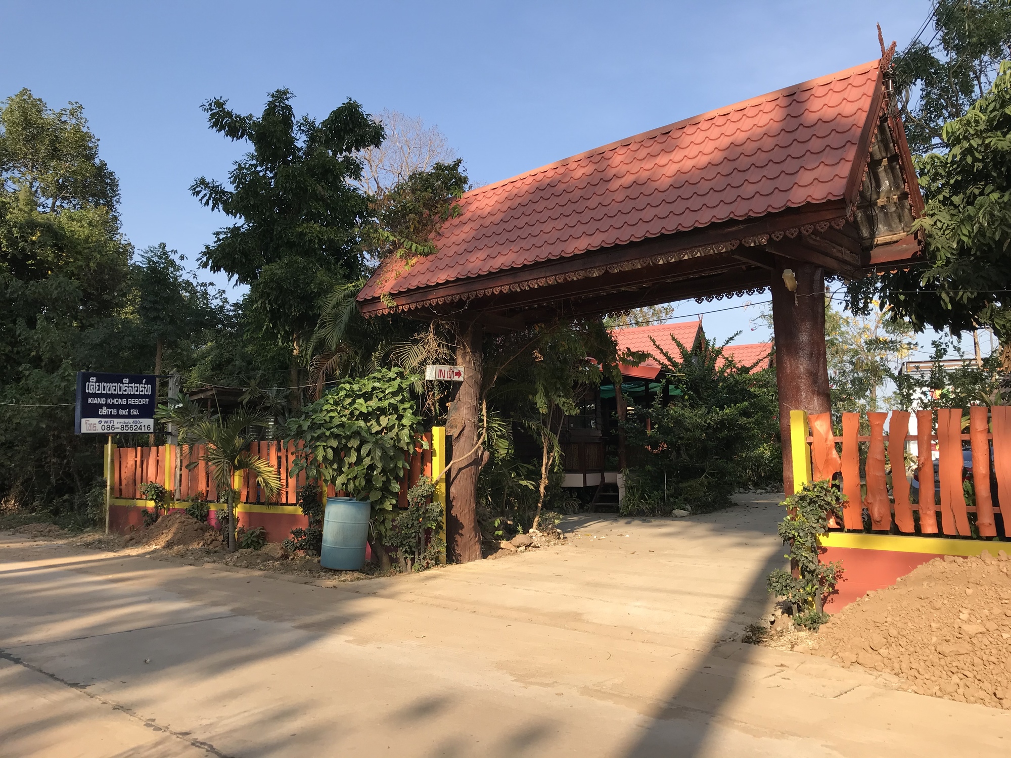 While we were waiting for my coffee a woman approached us and asked where we were going to stay. We told her of the 24 hour place across the street from the market that we had rejected because it was way overpriced at 700 baht. We told her of a resort we thought might exist south of town and she told us we absolutely had to go to a resort just a little bit north on the river. She told us the name, Kiang Khong Resort and it was 500 baht. She said it was really beautiful. She even told us the phone number of the place, (as if we were going to remember it!) The woman was very enthusiastic and seemed really nice. She also didn’t speak a word of English. We told her we’d go look at the resort.