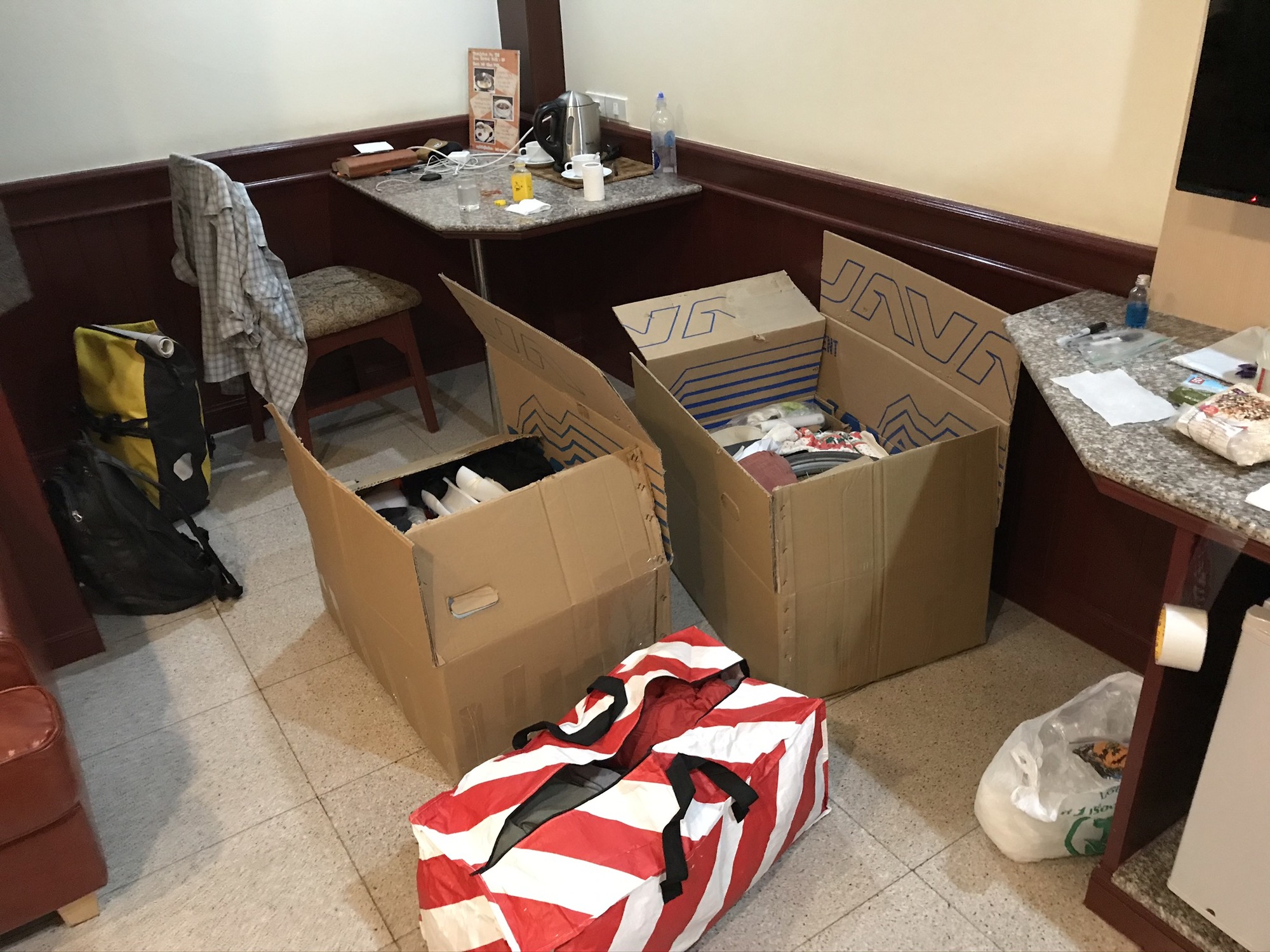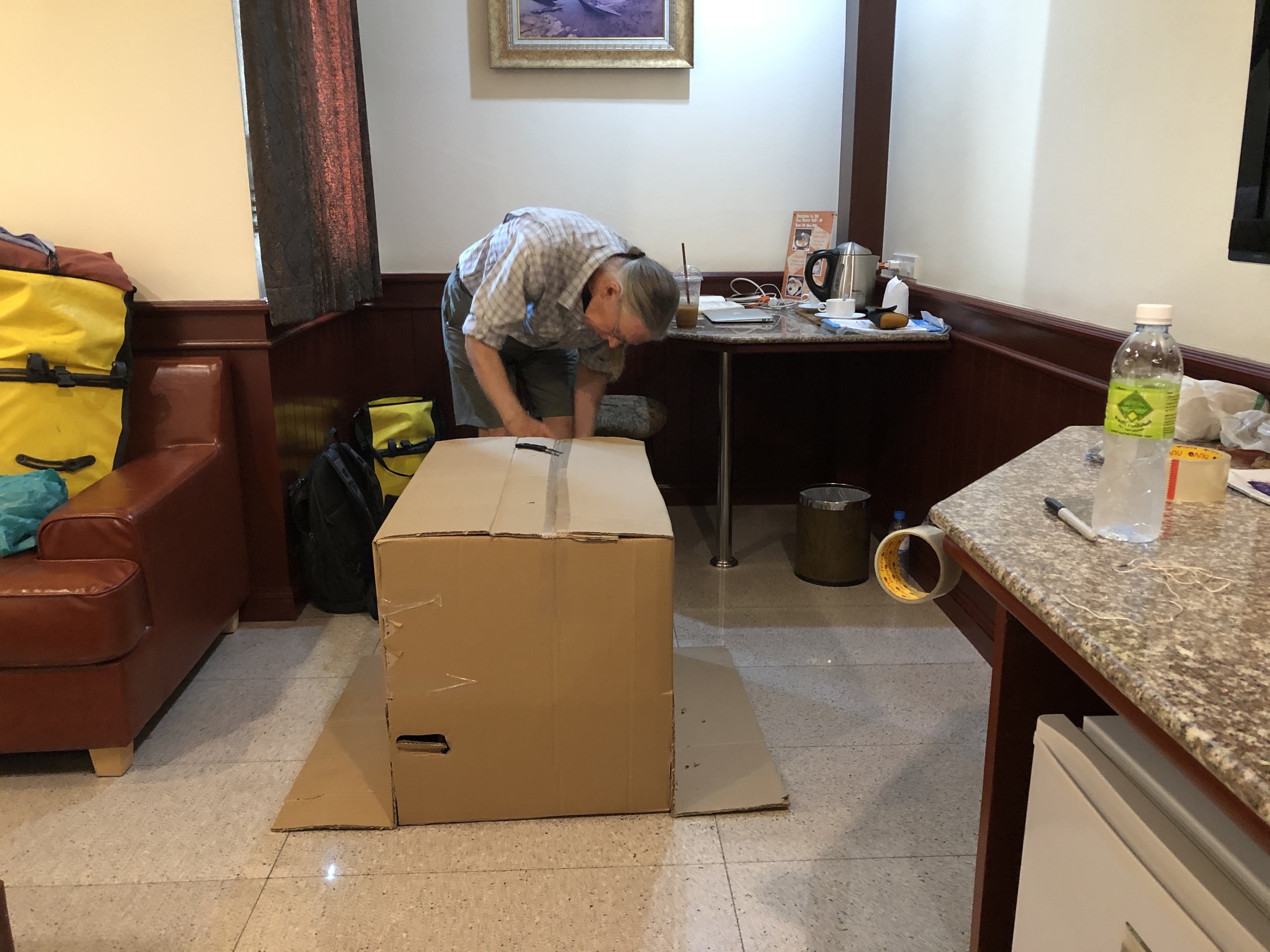 Taping is my expertise. I maybe could make a box like she does but it would take me around ten days instead of her half an hour. But I’m really good at folding up all the sides and cutting off excess cardboard and putting on so much tape that in the end we had a very strong box emerge right there on the floor of our luxurious room. It’s definitely a team effort and I really would not want to try to do it all by myself even though I suppose I could if I had to.