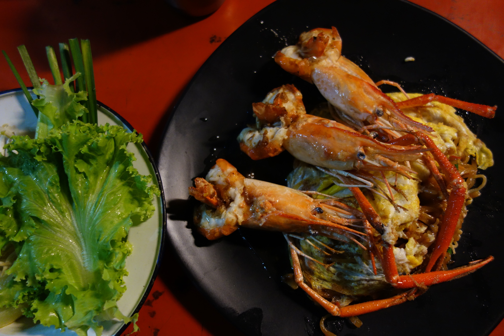 Appropriate Sunday dinner: Pad Thai de luxe with king prawns. Looks like a gourmet restaurant dish but comes from a most unappealing street hawker only 200 m away from my hotel. Cost: 120 Baht - 3 €. I love Thailand!