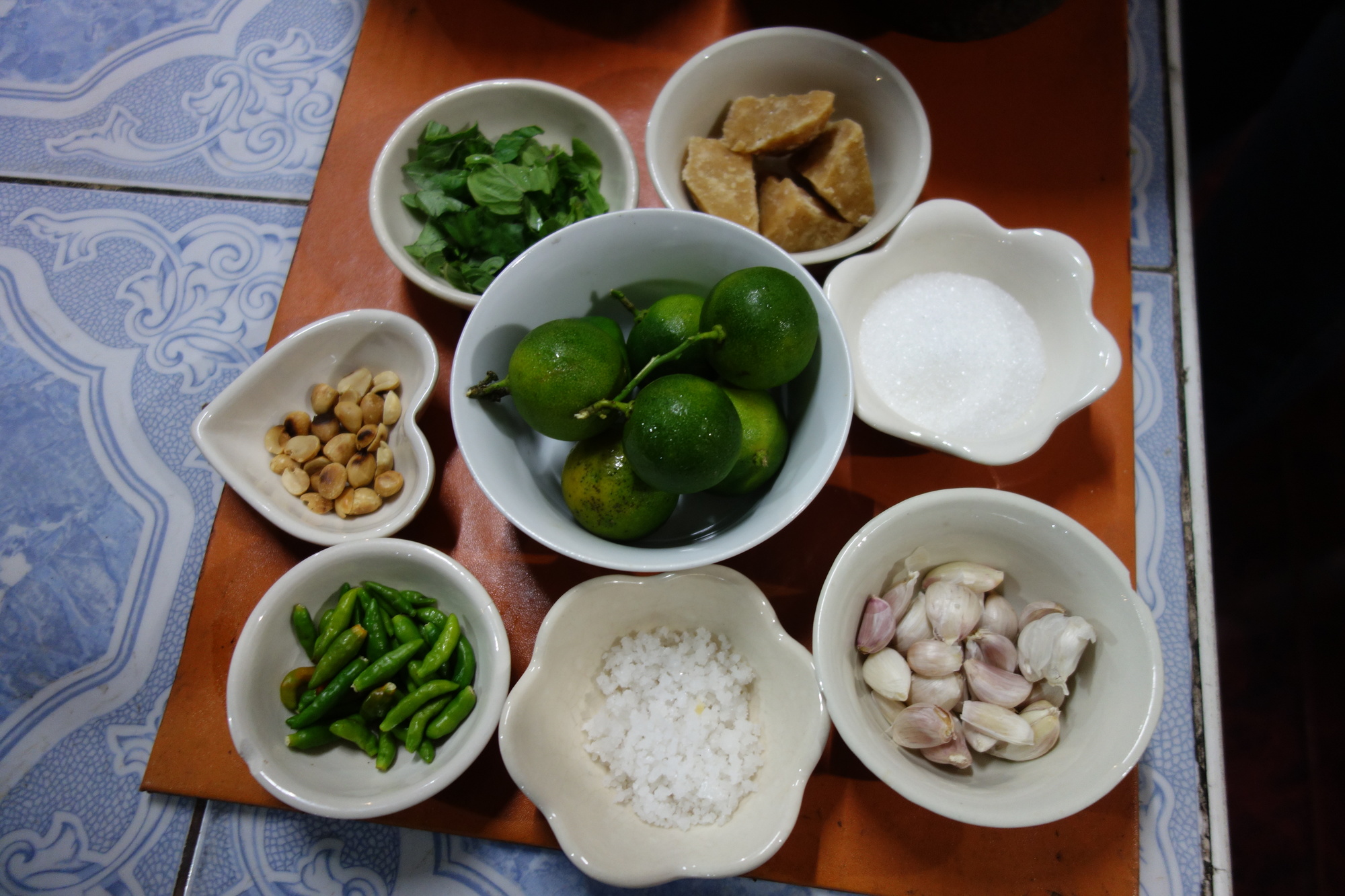 I was taught how to prepare this great seafood dip by Siriphan, the owner of the Nakoa Rimlay Homestay in Ban Tong Tom/Sawi/Chumphon Province. Here is the list of ingredients: palm sugar, refinded sugar, garlic, sea salt, hot hot hot chilis, roasted peanuts, holy basil, tangerines (no limes!). Anything but the refined sugar was used in full as you see it here. And here is the video on the preparation, featuring Siriphan and myself: