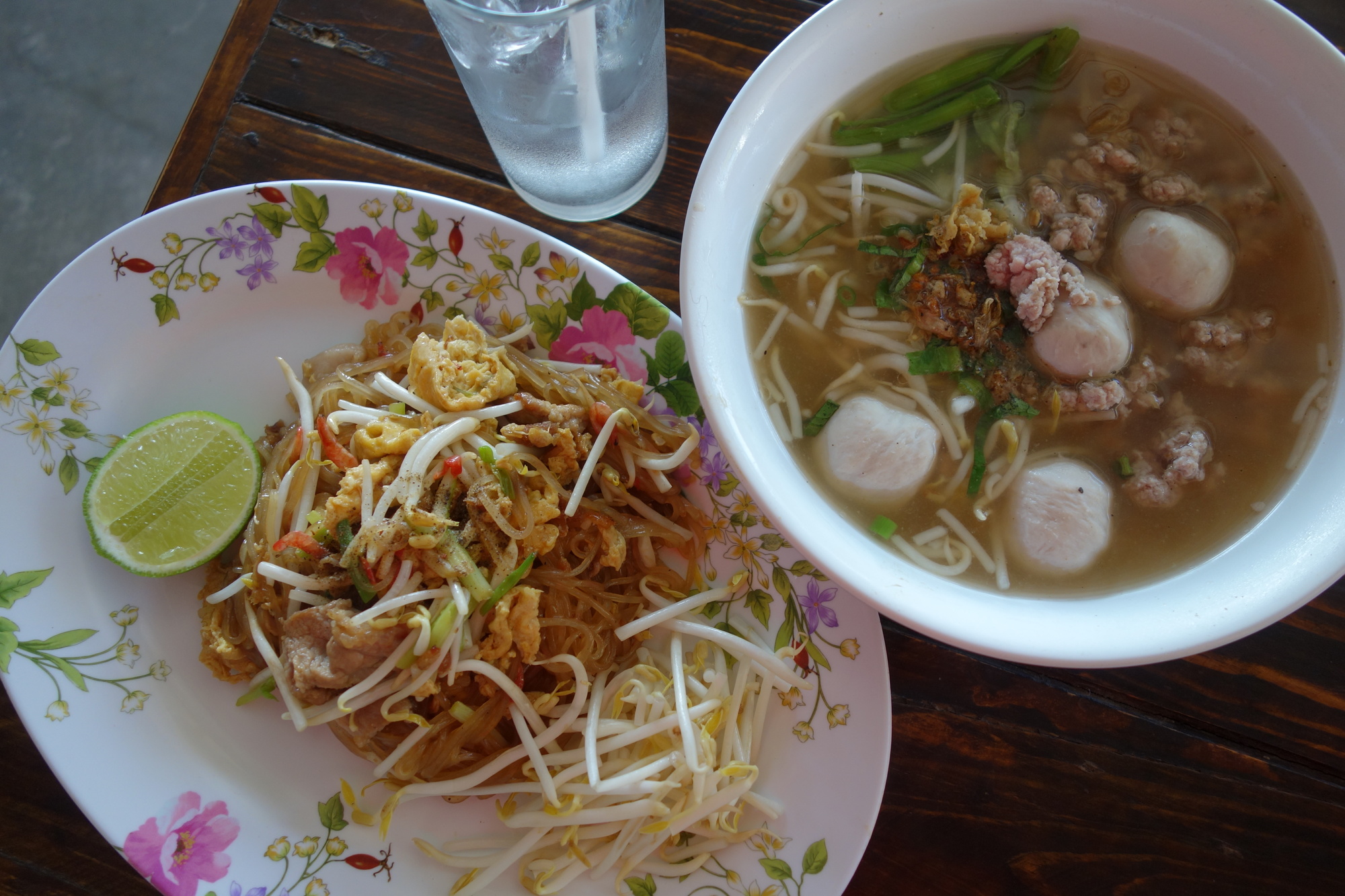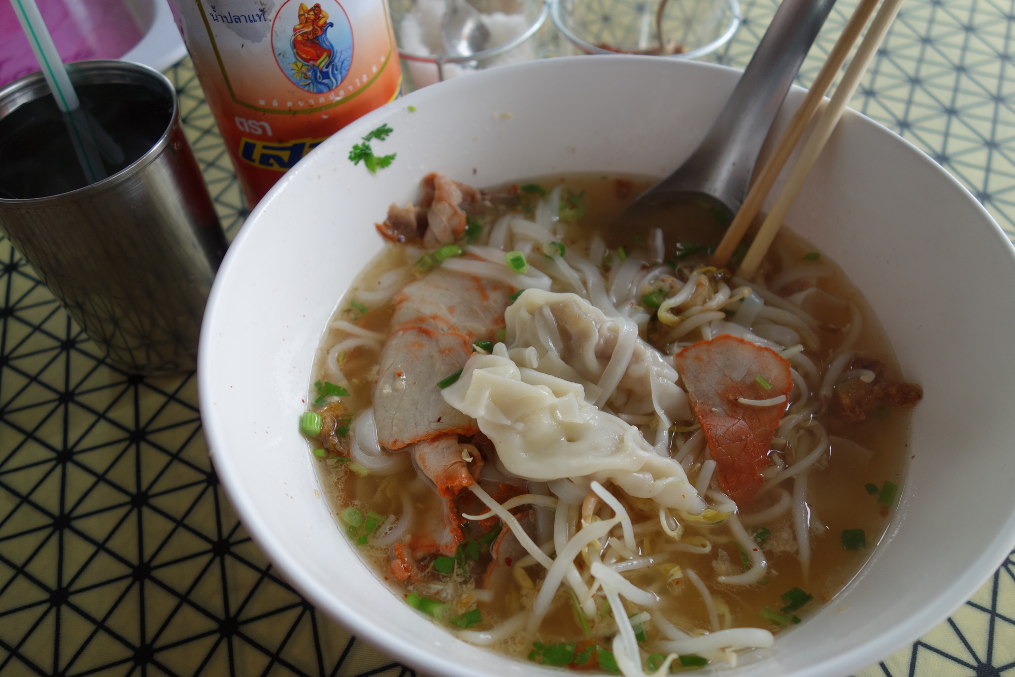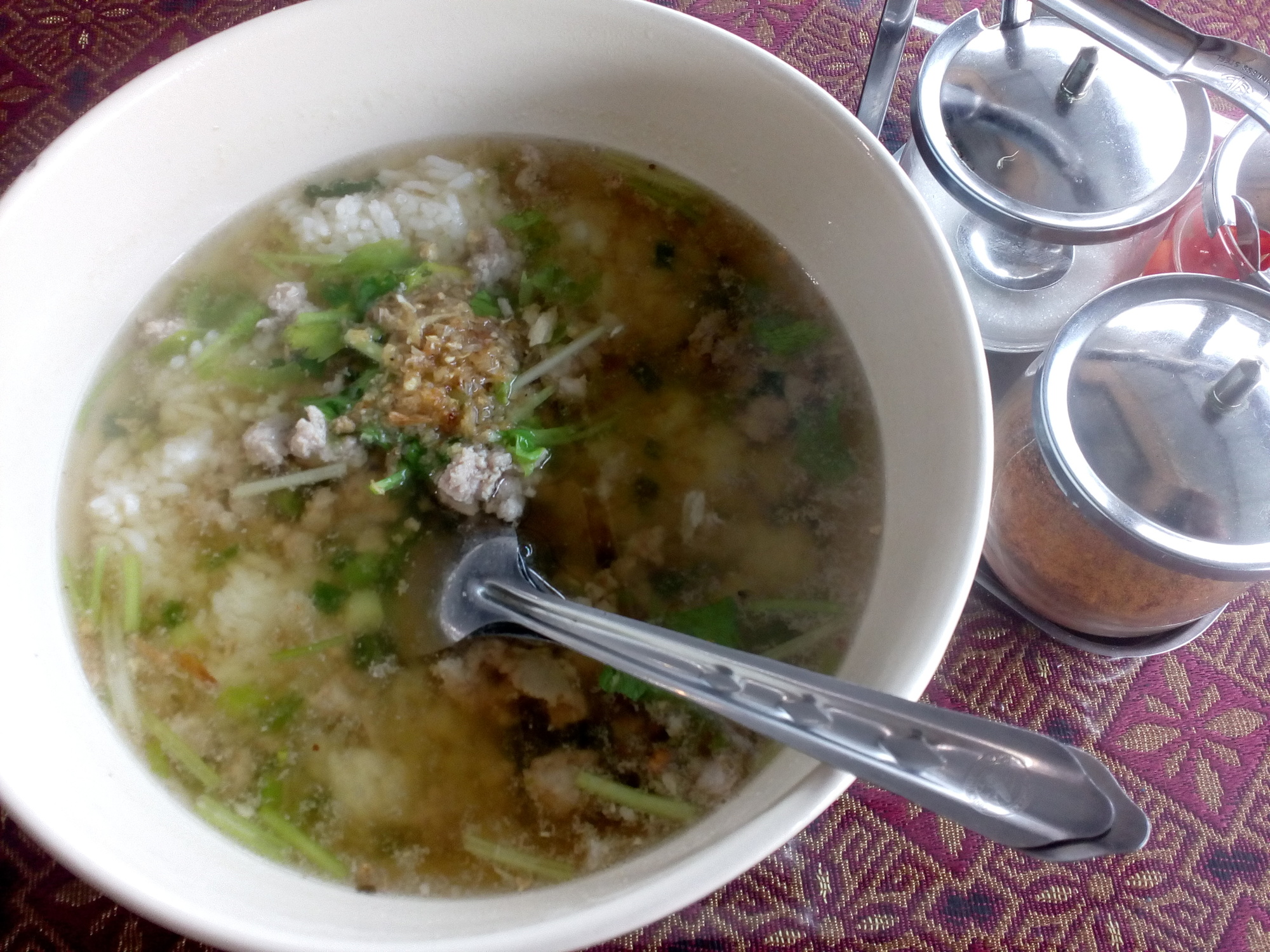 While riding the bike at 30+ degrees celsius I don´t really feel like solid food but soups. There are three that I really do like: Broth with rice and minced pork ("Khao Tom Moo") as shown here is one of them. The others are of course noodle soup and rice porridge which will be featured at a later stage.