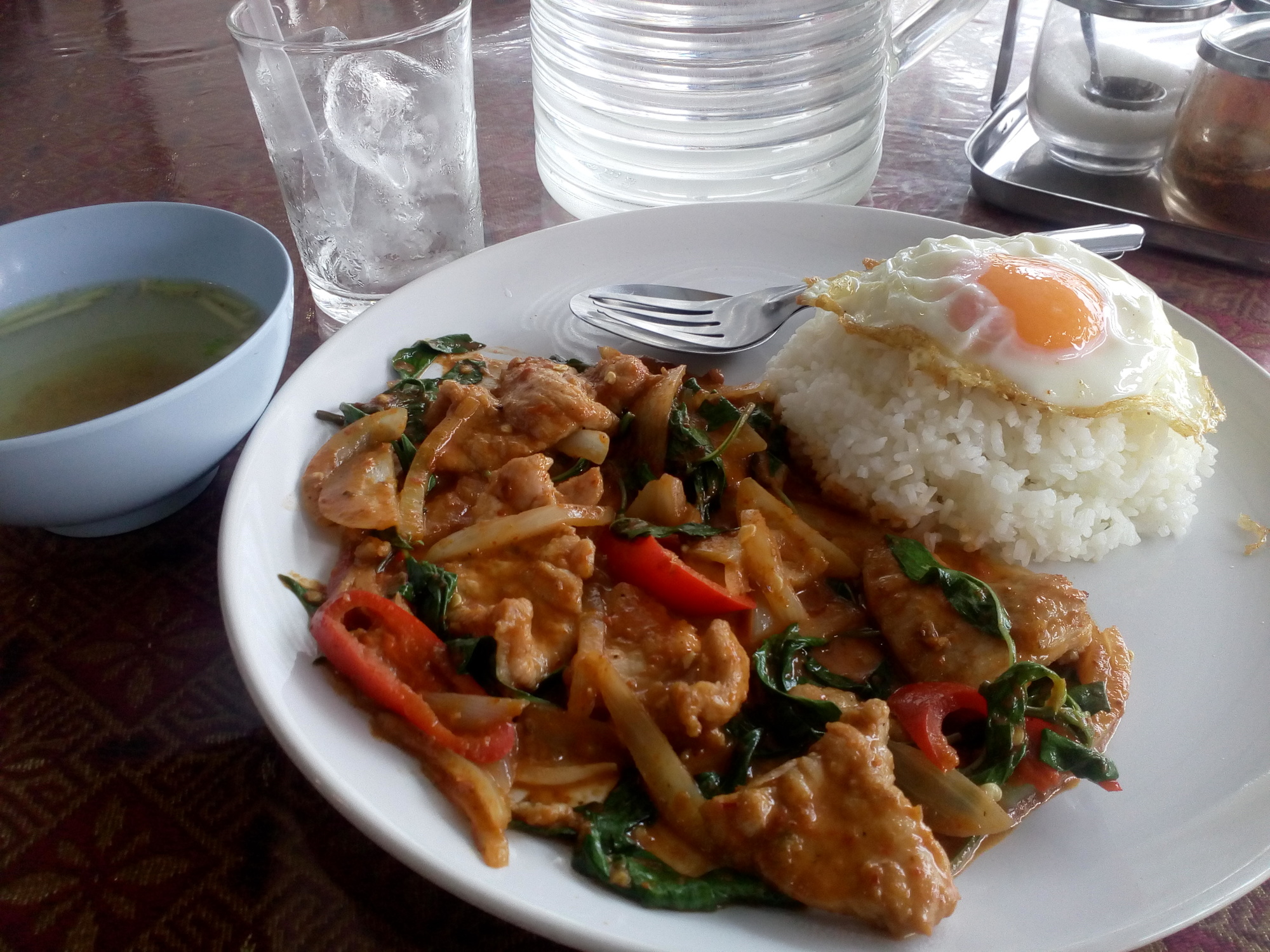One of my all time favourites! A pork curry called "Pad Pik Gaeng Moo". The type of meat is always put at the end of the dish. Pork is obviously "moo"; chicken is "gai"; shrimp is "kung" and seafood is "talee". In a "real" Thai restaurant you will get the drinking water ("nam plao") as seen in the background for free; if you want ice with it ask for "nam kaeng, khrap". Female customers say "....., kha" instead.