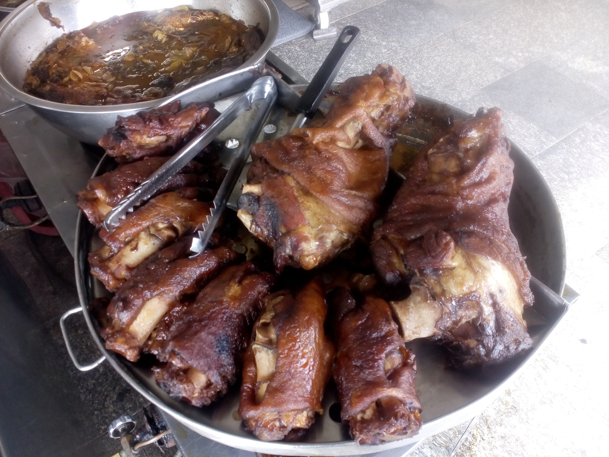 That´s how you know the Khao Moo is on offer, the whole knuckles are always on display. By the way: I don´t eat the skin and I simply pull some skin of my arm and say: Mai! (No!). Good enough to only get meat.