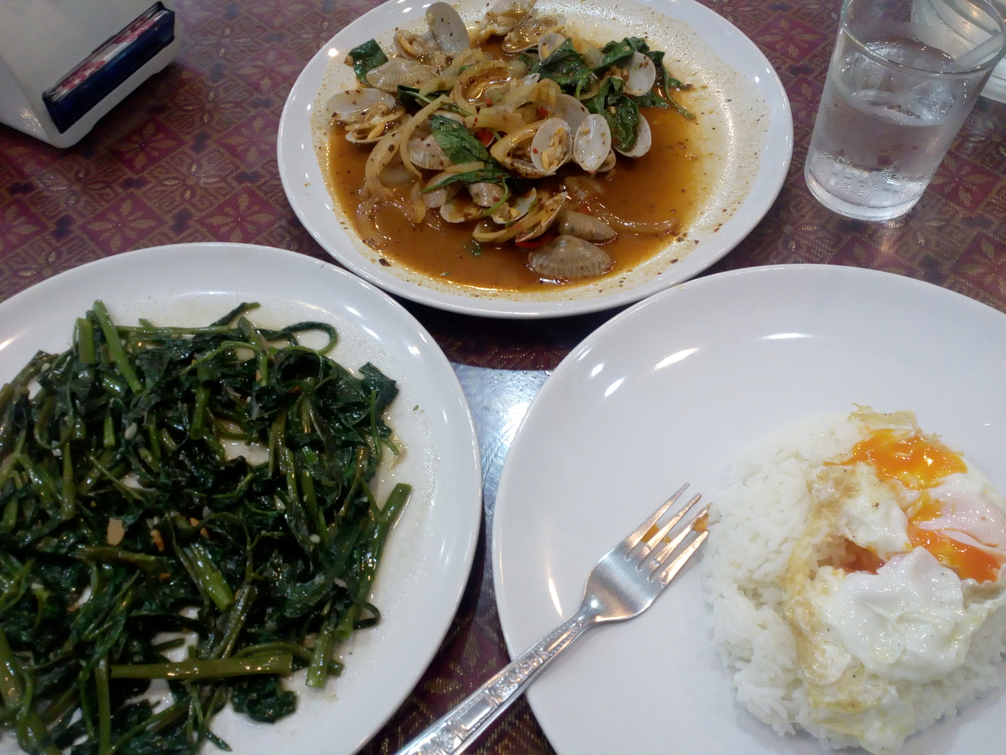 Here we go, as much garlic and chili as a caucasian can take! The greens on the left are called "Pak Boong" or even "Morning Glory" might see a result. I understand it is called silverbeet in the English speaking world. That´s where most of the garlic goes that I posted while in Chiang Rai. The clams in the middle will have the same huge amount of chili to balance it out. Ask for "Hoi Lai". And last but not least the white rice ("Khao Suai") with a fried egg ("Khai Dao"). I could eat that combination every second day!