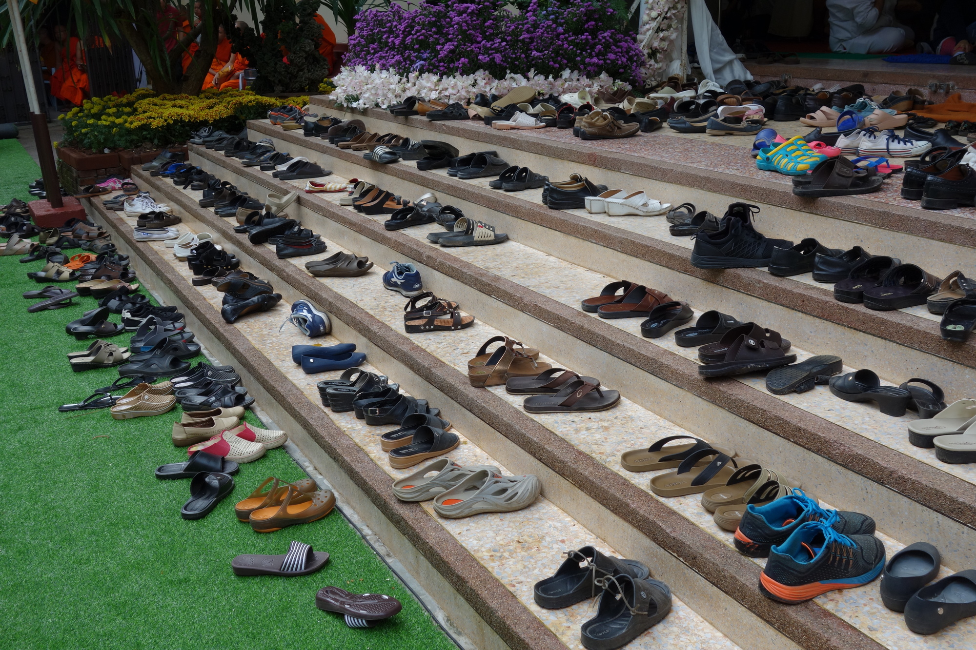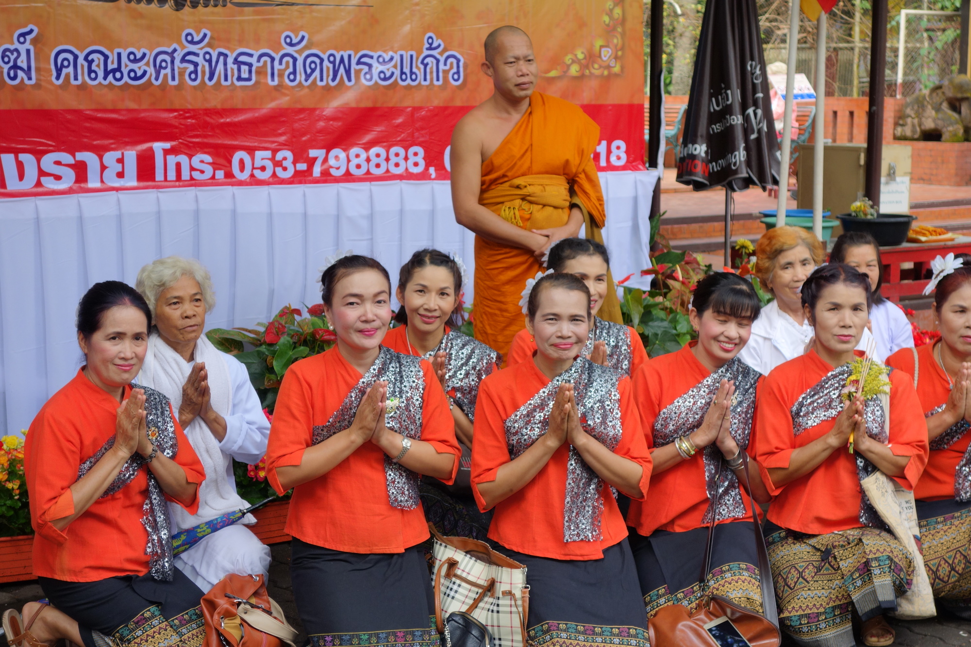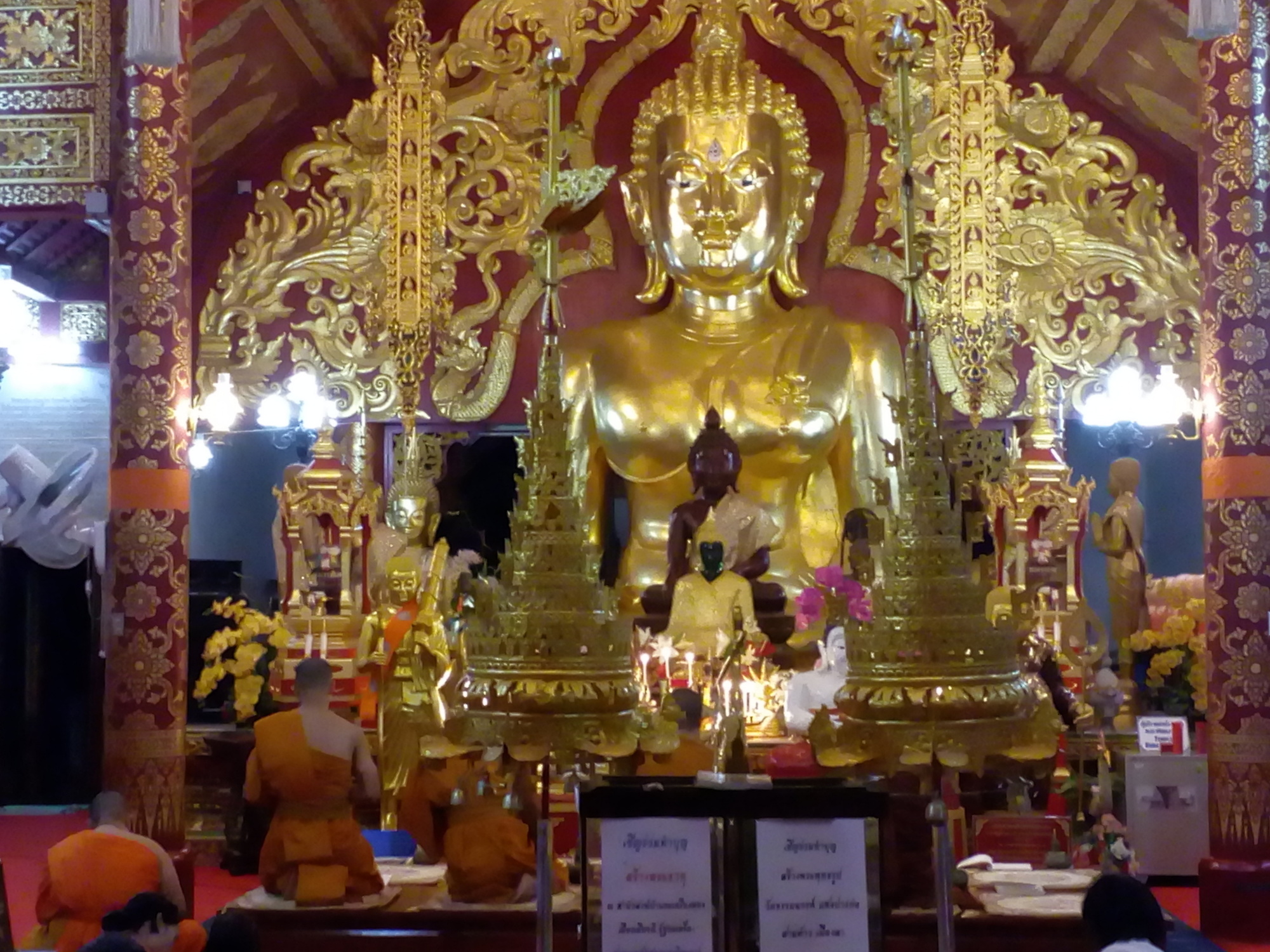 On return to my room I finally found some sleep but was woken up soon after by the monotonous and unusual vociferous chanting of the monks in the Wat Pra Kaew next door. Not one second did I think: Why do they have to do it that loud on a Saturday morning? Quite the opposite! I can´t withdraw from that spiritual fascination and after approximately 2 hours of it (I am not kidding!) I decided to get up and ask the guesthouse staff whether something special was going on. They told me it was some round anniversary of the temple and I should go because they would give away food for free. I did indeed dress up and go - but not for the free food! Not in a country where a lovely meal comes at 1.50 €. What I went for was to experience first hand - I am repeating myself - the magic of the canto and the devotion of the Thai worshippers.