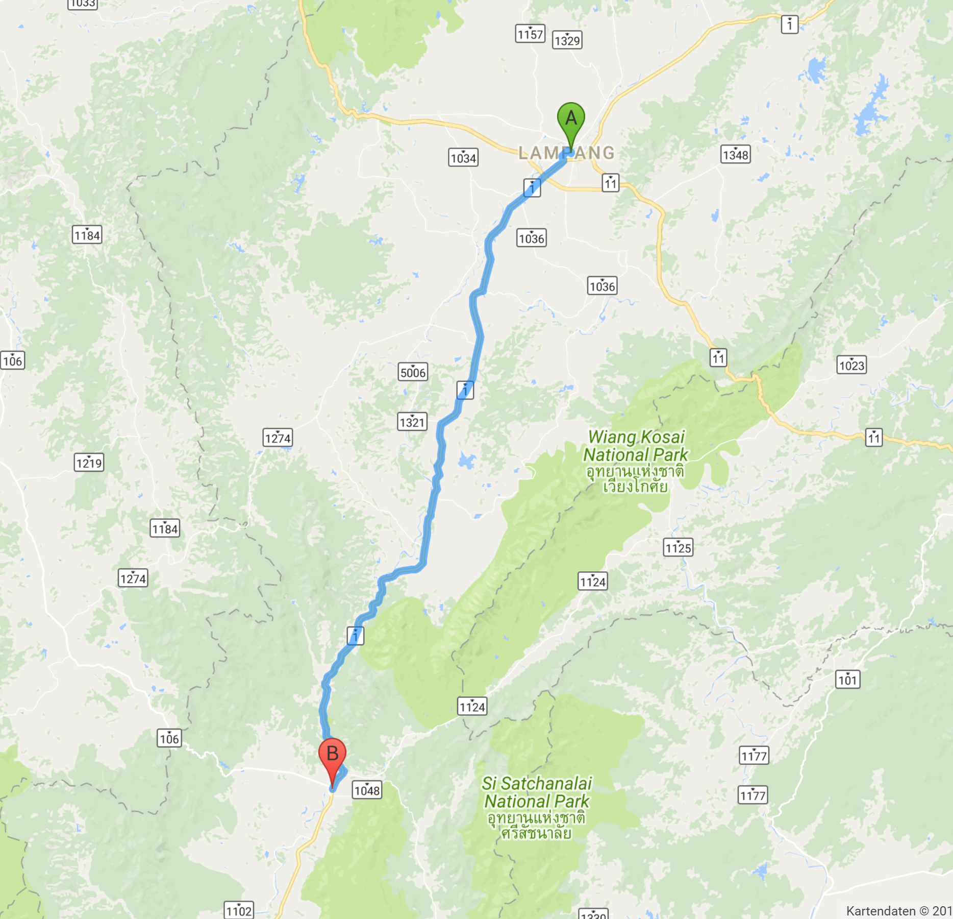 in Lampang I was desperate to get moving again. As I will now slowly be turning east towards the Mekong the most logical and shortest route would have been to stay on Hway 11 through Den Chai to Uttaradit. That is definitely challenging terrain though and as I did have no idea this morning what this influenza would have done to my general fitness I picked the by far longer, very likely more the more busy but at the same time the easier route. Straight down Hway 1 to Thoen that is.
