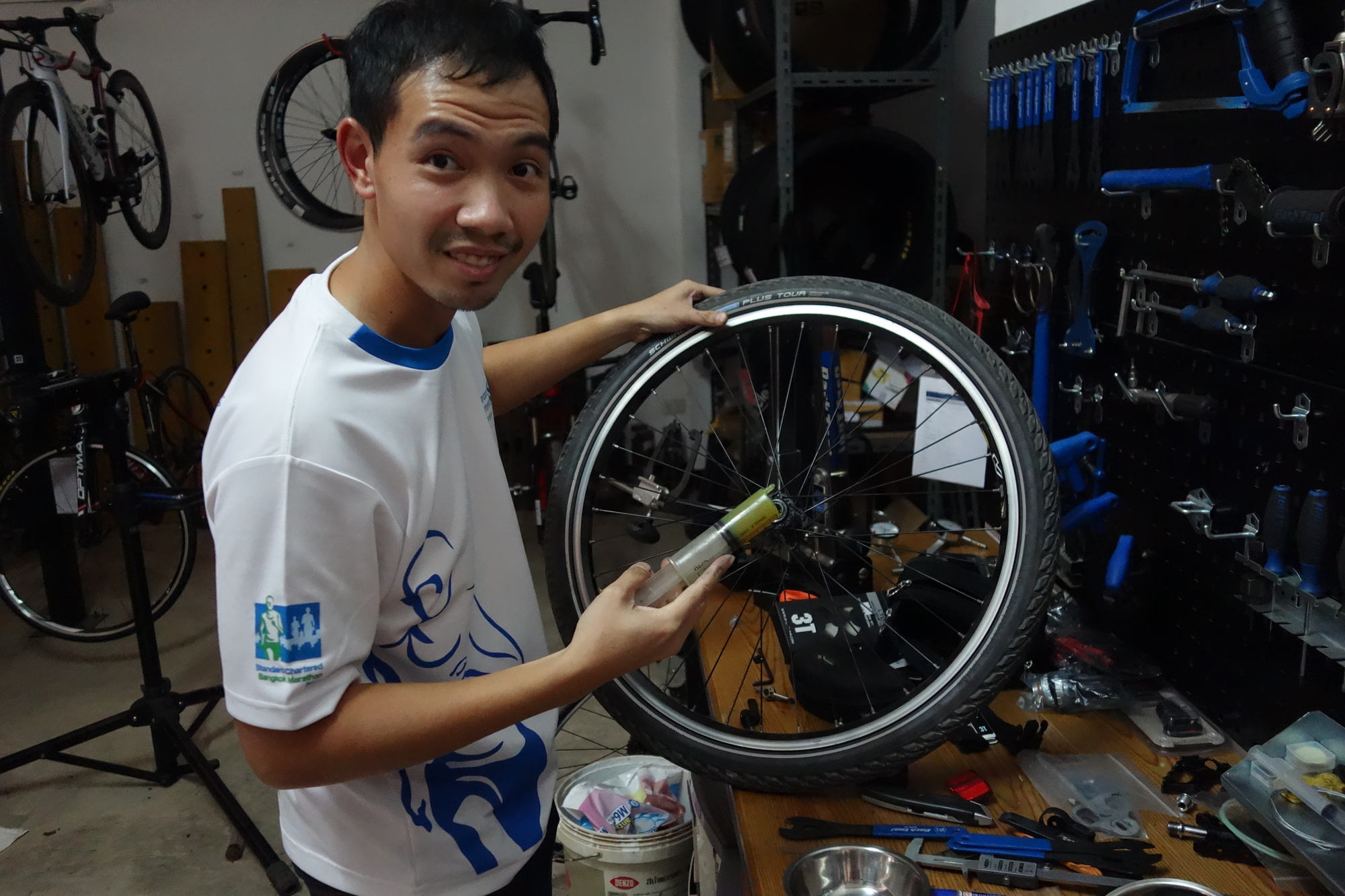 Anyways, the last 33 km into Loei were an utter joy ride and when I rolled into town I decided to see a bike shop before going to the A.P. Court Hotel. Which shop first? My friend Chris from Singapore had suggested to see "The Bicycle" along the 201 towards Chiang Khan which was bit out of my way but what a winner it was! The young owner, Bot, was out for the afternoon but returned immediately when his parents gave him a call. And he got his hands on straight away. Bearings cleaned and regreased; gearshift assembly readjusted; new screw for the kickstand. It wasn´t even dark yet when I left for my hotel and must have been the happiest man in town. I will remember Christmas Day 2017 for quite a while. Bad start, great end - the best of all scenarios!