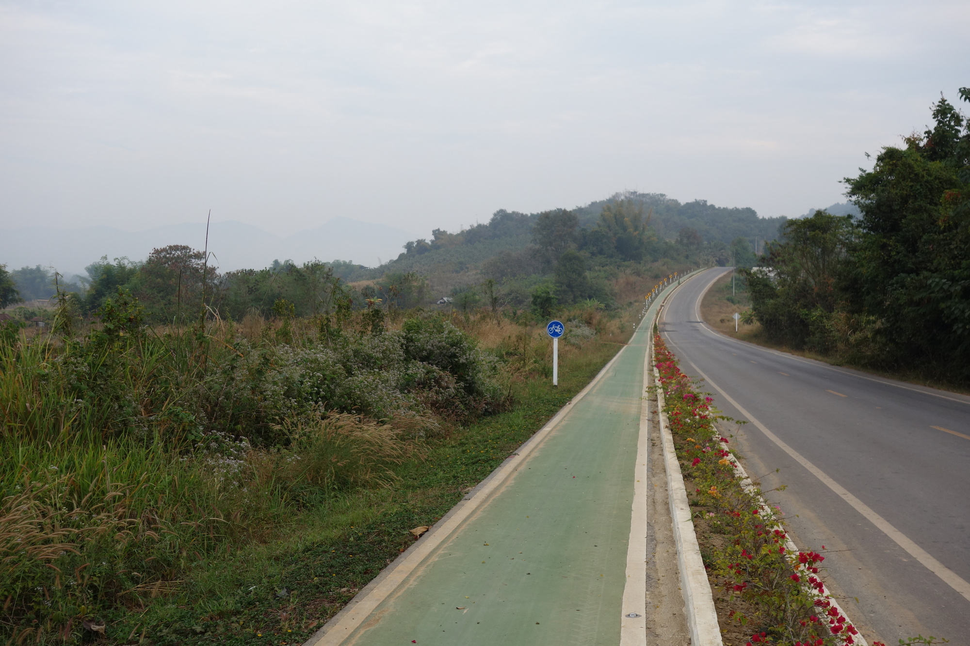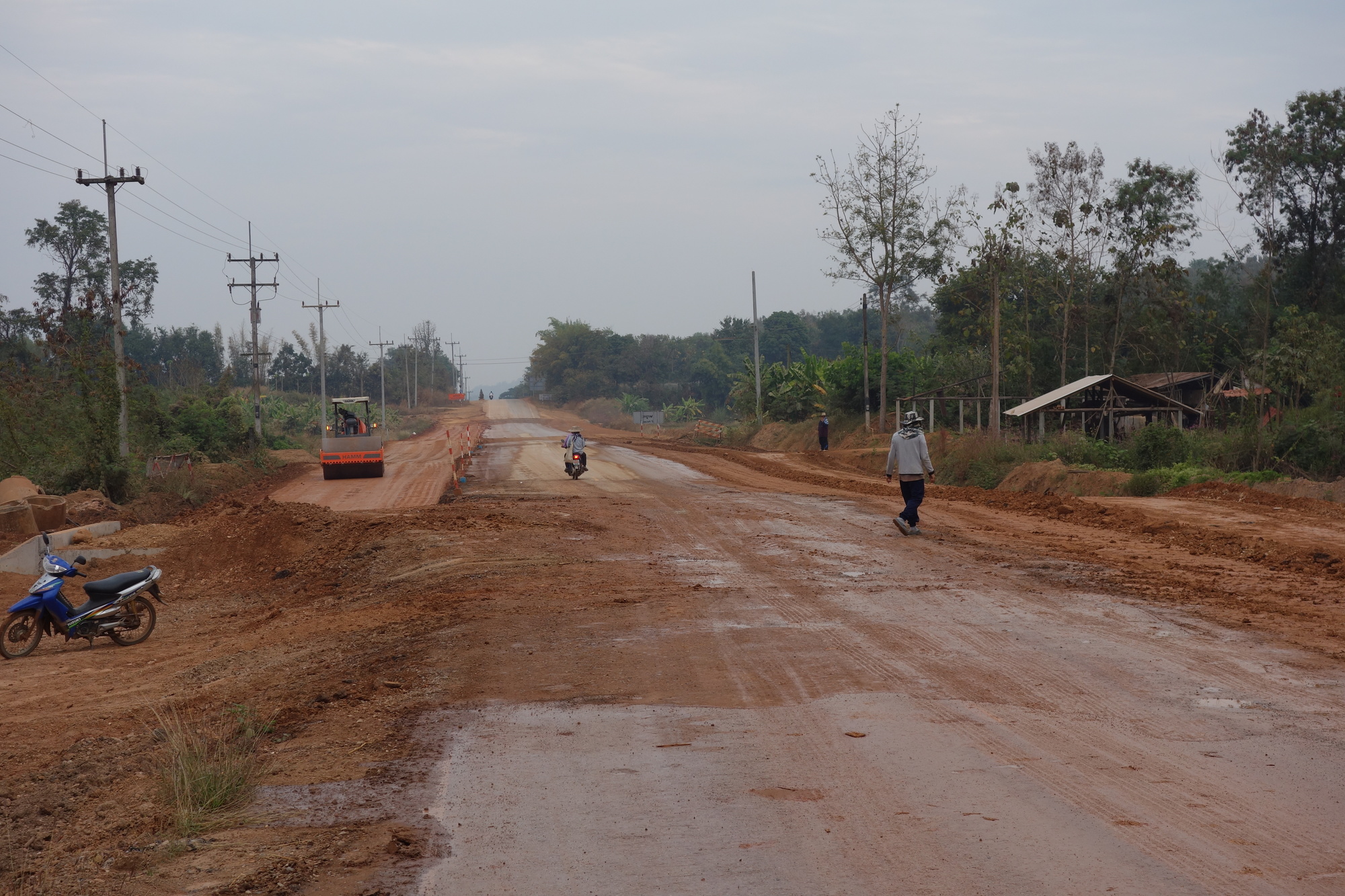 I am less enthusiastic about the start of the 4009 though. Bot had obviously forgotten to tell me it´s under construction. Big time. It´s that pest or cholera choice again. If they hose down the dust you will have the bike covered in gooey red mud; if they don´t spray water, you will definitely need some breathing protection. Fortunately it was all over after 5 km and then I was indeed happy I listened to my favourite mechanic in Loei. Lovely countryside ride it was! Mind you there is no easy cycling up here in the North and Northeast of Thailand. Permanently up and down with many steep if short sections. Very demanding on such a heavy bike. But once again: I packed everything myself, nobody else to blame.