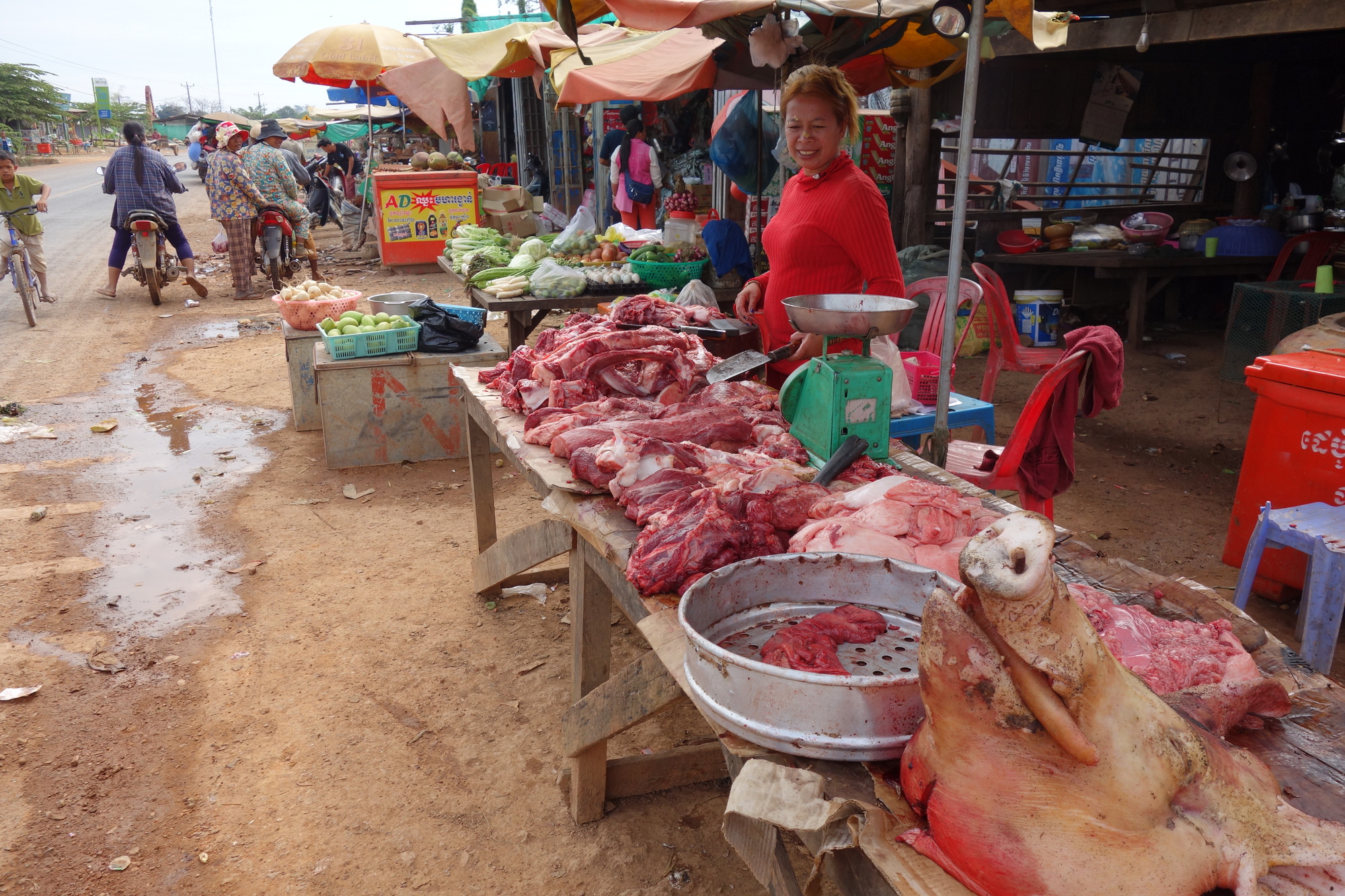 Let me use this photo to have a word on food in Cambodia in general. It´s the only country in SEA where I suffered from serious diarrhoe on previous visits. You can see why. On no market or village stall I have ever seen meat or fish being kept under any sort of refrigeration. This and the lack of general hygiene makes me extremely hesitant when it comes to eating meat and I live almost vegetarian
