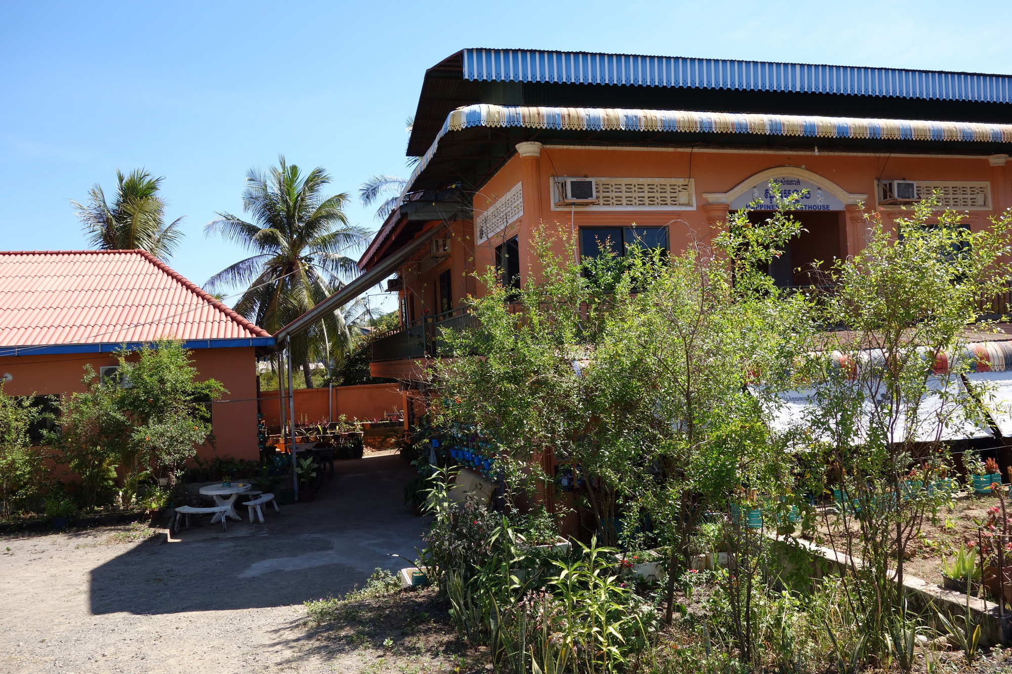 All the same I didn´t feel like having a big loop around town searching for a guesthouse and luck had it when entering PVC the very first compound on the left is the Sopheak Meangkol Guesthouse, also Happiness GH. Run by mother, daughter and four dogs I received a very friendly welcome and was offered three different types of rooms: fan/cold water at 7$; fan /hot water for 10$ in the attachment and after having seen one of the latter there was no need to see the ac rooms for 16$ anymore. Immaculately clean, good wifi- everything exactly meeting my profile regarding a decent room.