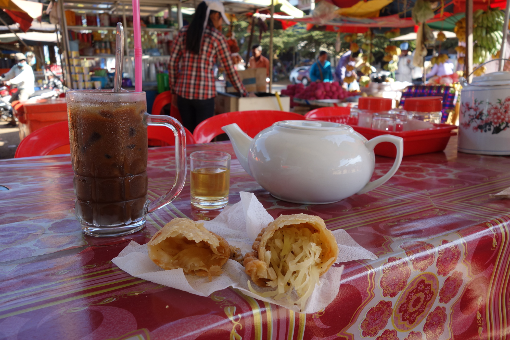 Drafting these daily reports plus picking and uploading the related photos takes a considerable amount of time. I still love doing that but always look for a place that I consider inspiring. If I do find particularly nice places, I wish to share them at the start of a page so you can relate to my proceedings even closer. Today (Sat, Jan 20) I am sitting at the market in Preah Vihear City typing the following lines. This is my favourite choice of location: A busy market, having an iced coffee, some delicious onion and vegetable pastry and the mandatory Cambodian free pot of tea