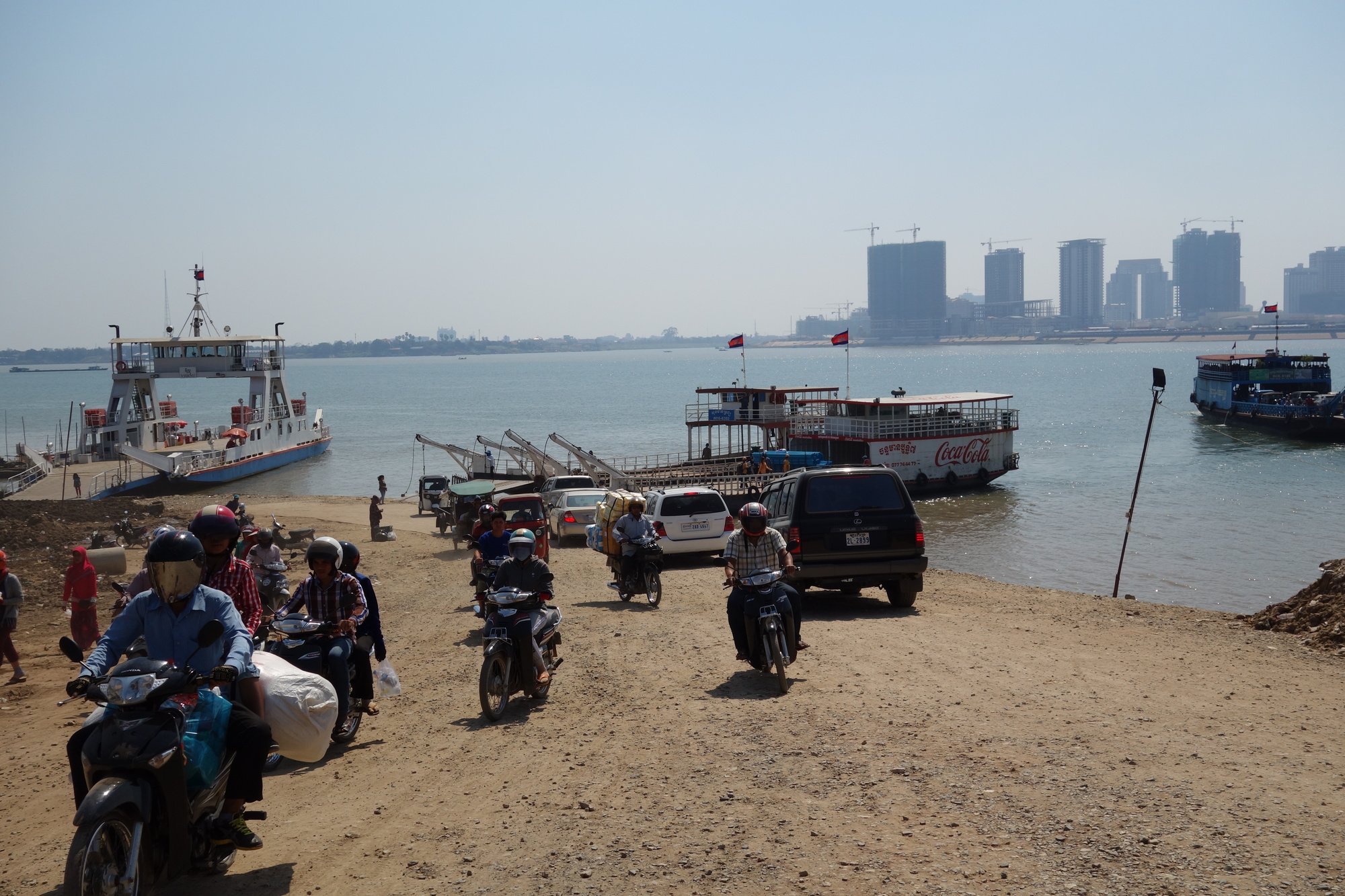 To me going on the ferry was a highlight as well. I believe you have to cross any river on the water once - going over a bridge is simply not the same experience. And this local traffic ferry certainly lived up to my expectations. Busy without being hectic, extremely cheap (500 Riel for me and the bike) and a relaxingly slow cruise over to Phnom Penh. I assure you - no better way to get into Cambodia´s capital.