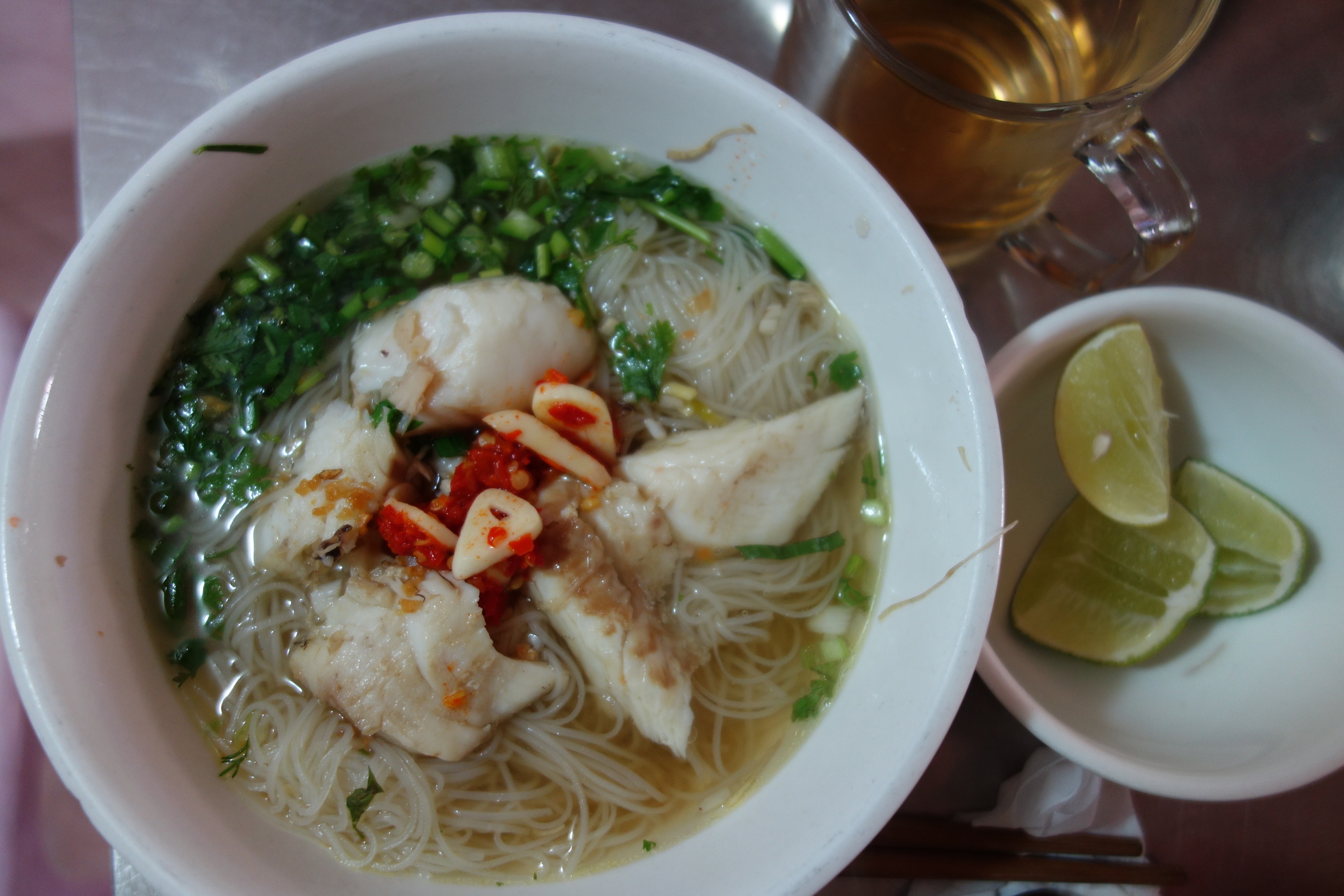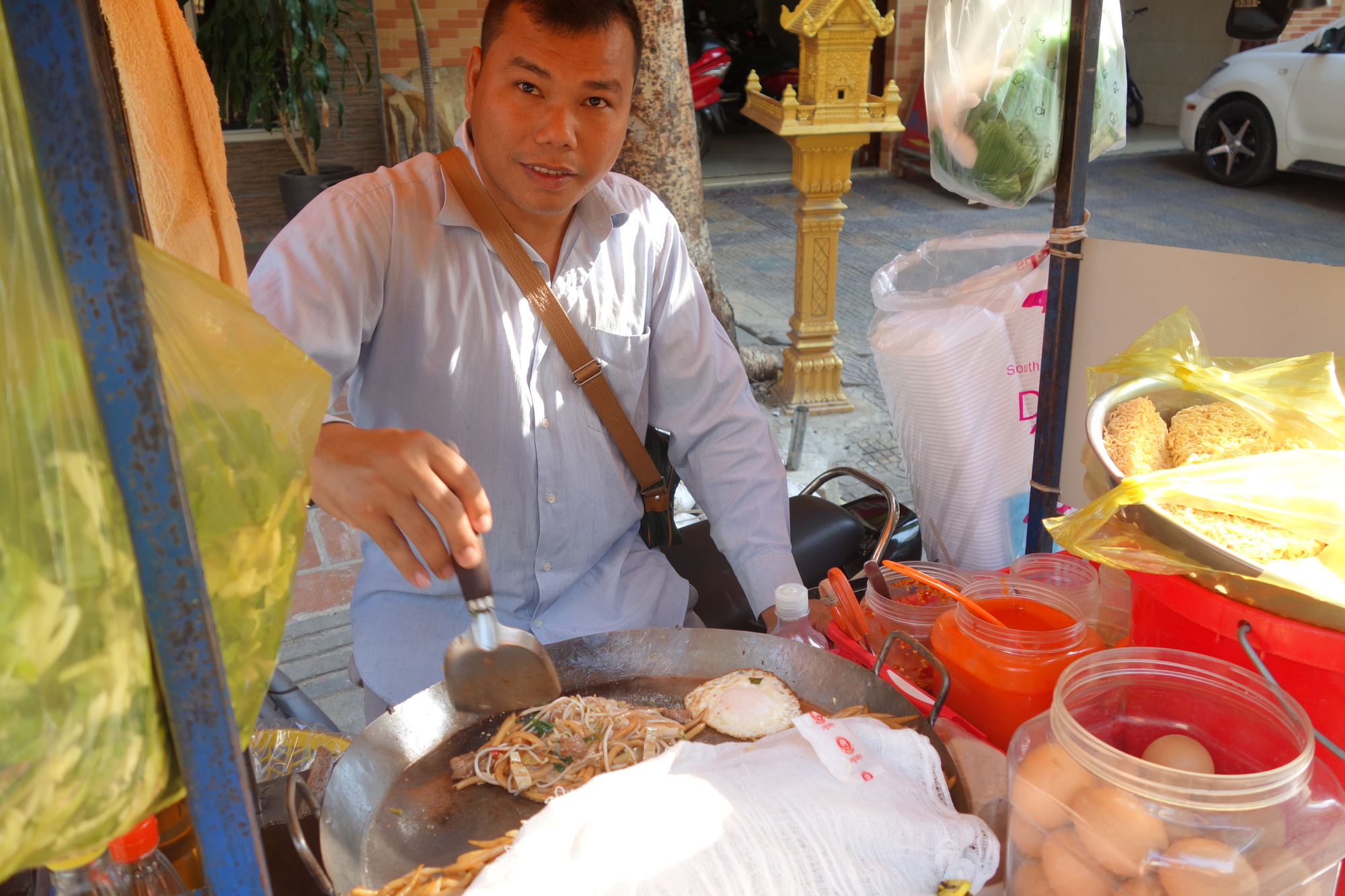 My daily breakfast: A fantastic dish doesn´t have to look spectacular. This noodle soup with fish is served in a little restaurant on the northwestern corner of the Royal Palace. Coming from the Mekong you walk the barred street along the wall of the Palace; cross the road on the corner; fourth building on the left. Mind you the soup is only served in the morning