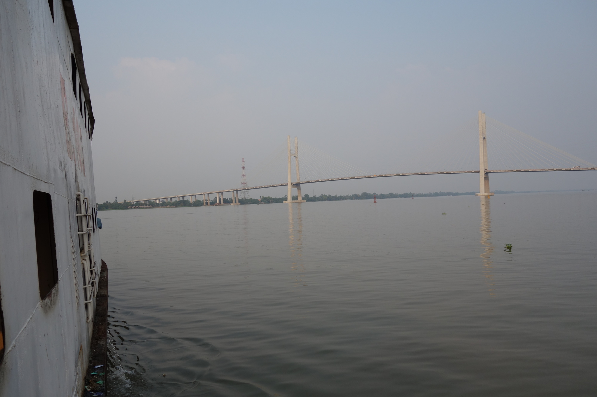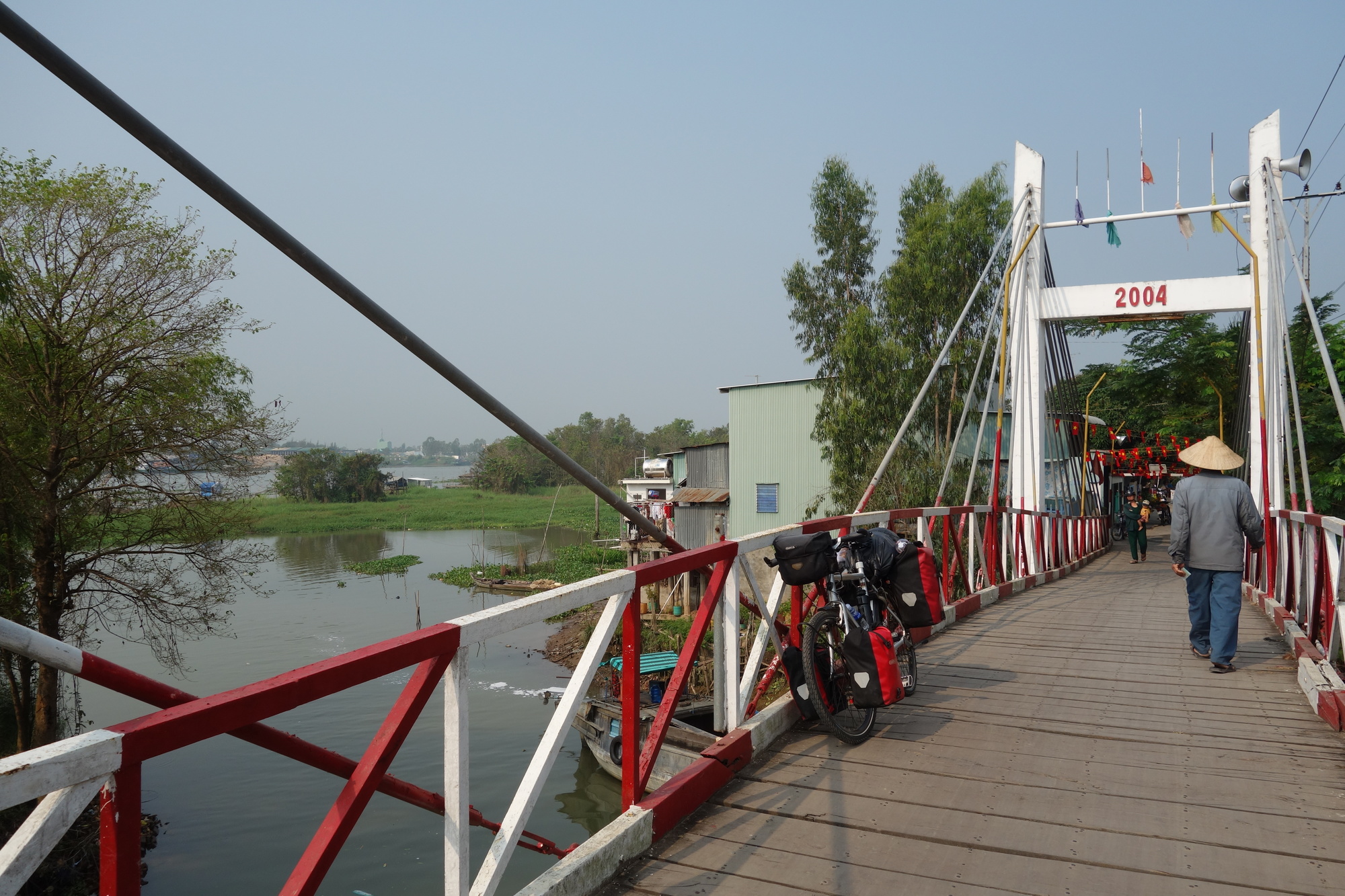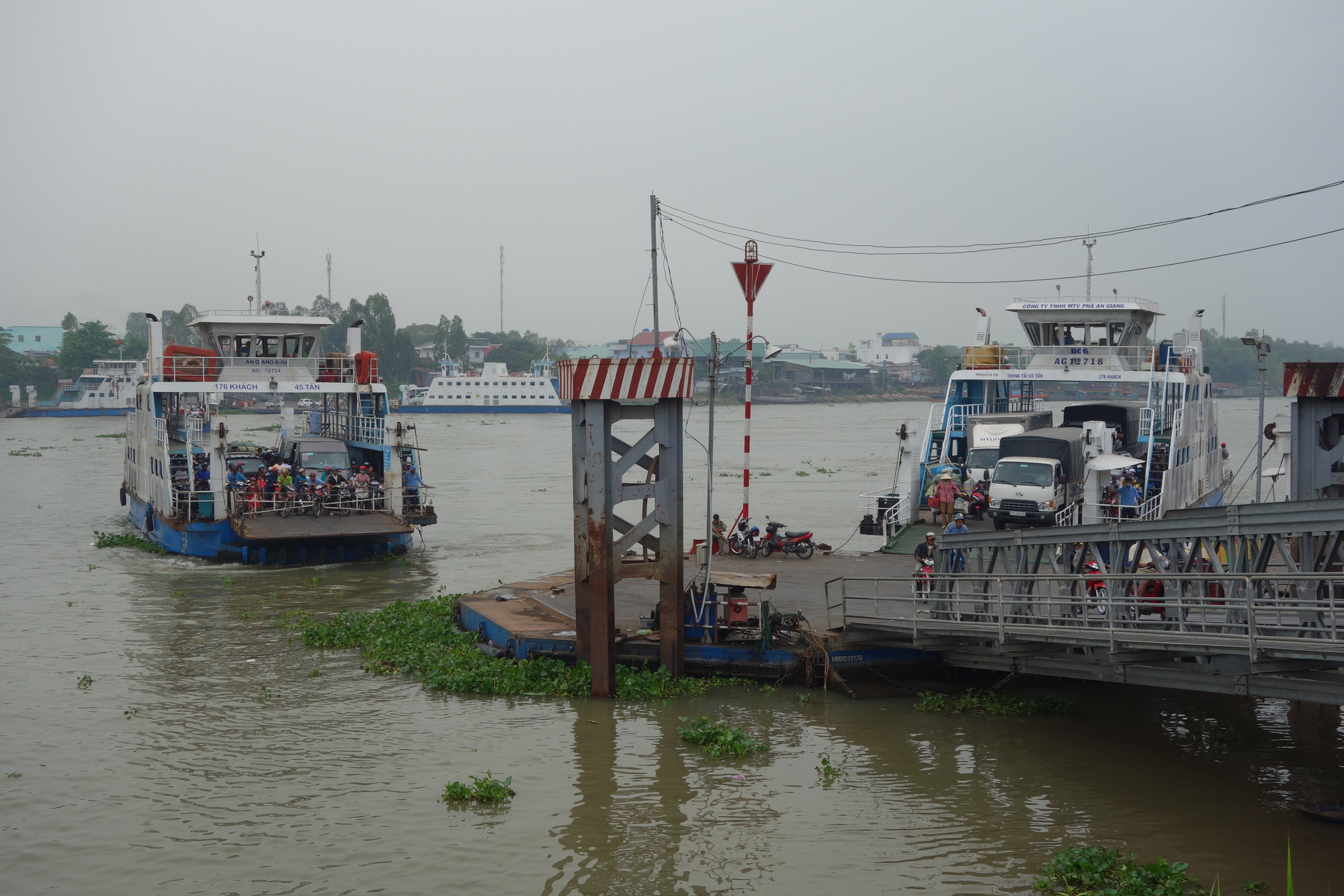 Onlya few hundred meters from the bank to the ferry terminal where youpay 2000 dong at a counter and hand the receipt over to a guy sitting at the entry of the "waiting room". I really like using those ferries and the procedures here in Vietnam are well orchestrated. Over on the other side I turned immediately right onto the delightful #951, which turns into gravel after a few kilometers though. There I moved over to the #953 which runs parallel only a 100 meters further inland. Later on this road was called 951 again but this is irrelevant as you stay on the same road all the way through to the village of Phu Tan at the southern tip of what I would call a peninsula. Here I lost the route that I was determined to follow towards Cao Lanh as I wasn´t aware there are two ferry terminals. Not a problem as the # 942 would take me to the city with even one ferry crossing less. The only disadvantage of my route: A considerable increase in traffic but I am still happy with the way the Vietnamese motorists have been treating me so far. The 942 clings to the bank of the Mekong all the way with just one row of buildings between the road and the water for most of the time. As I said, more busy than further north but still very enjoyable. Before I forget to mention: That second ferry was 2000 dong as well, the third one over to Cao Lanh is free of charge for cyclists.