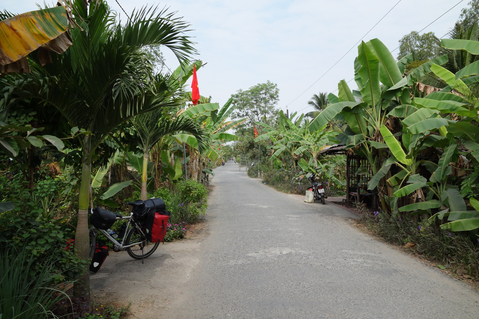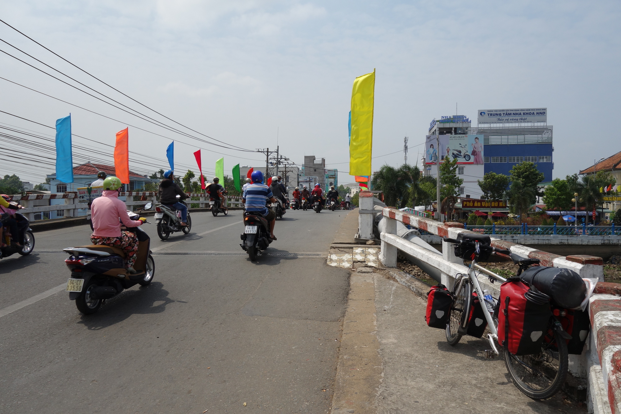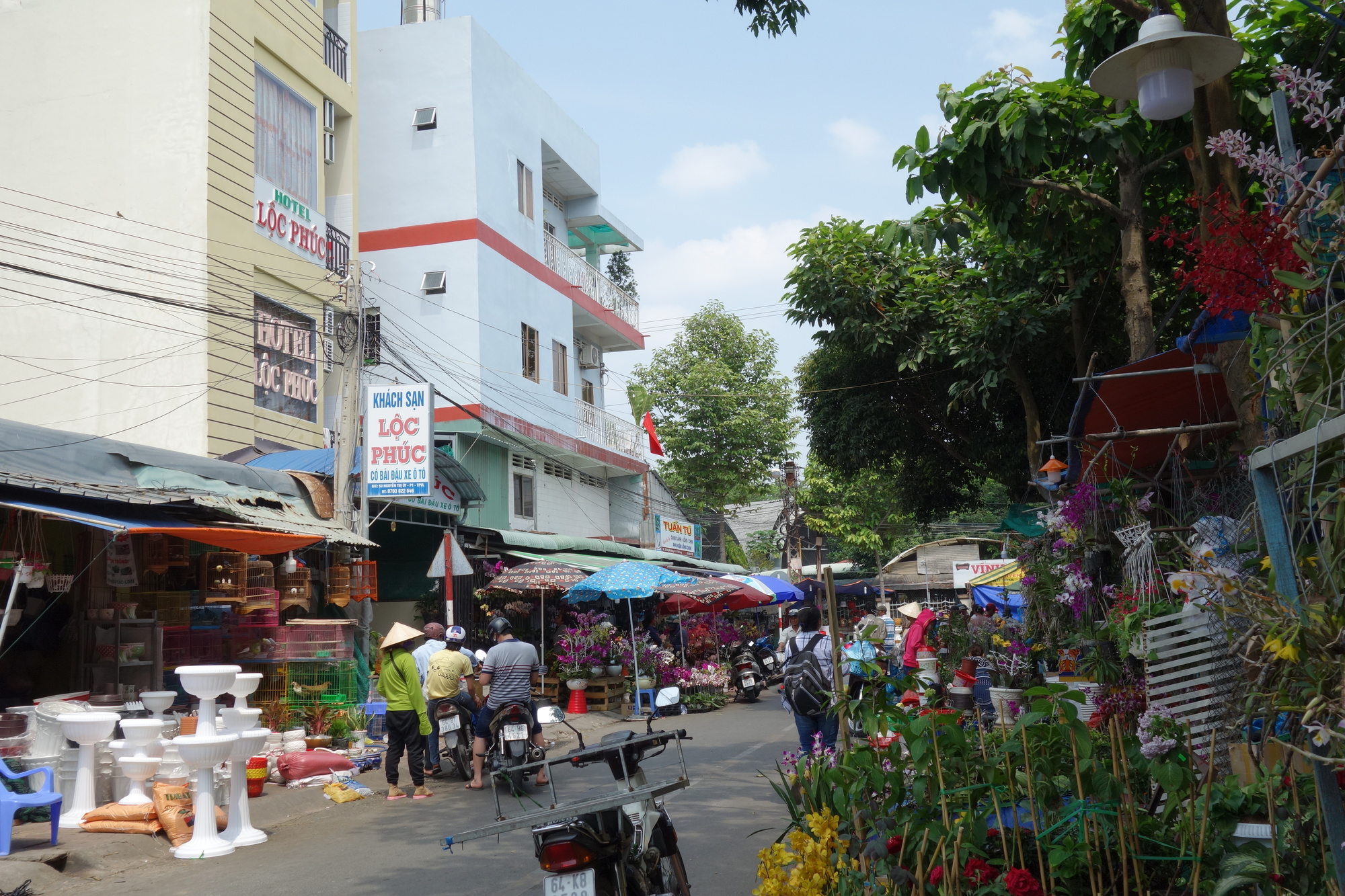 I have time to talk about those things as the ride was over long before noon. I had started off on a bumpy but most enjoyable side road along the river which unfortunately only lasted for a bit less than half of the distance. The last kilometers had to be done on the very busy Hway 80 which was acceptable though due to a wide shoulder. When I got into town I was immediately fascinated by all the colour and market activities along the Mekong. My brief consideration to carry on a bit further as it was still so early turned into the opposite when I rolled past the Lo Phuc Hotel in that orchid pitch dominated side street. I saw their balconies facing the street and when I was shown the small but very bright, well equipped (fridge, excellent wifi, locker for the valuables) rooms for 300000 dong I instantly booked myself in for two nights. What I didn´t know then was the fact that stalls in the neighbourhood sell pets and as some of the pups are kept in cages outside their whining had impact on my sleep. I would still go back to that very same hotel again!